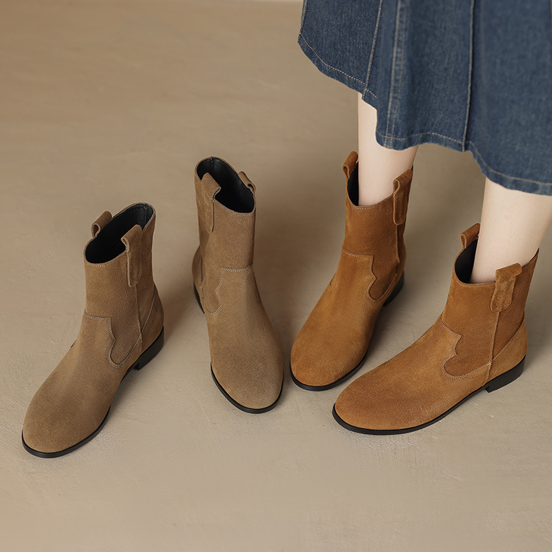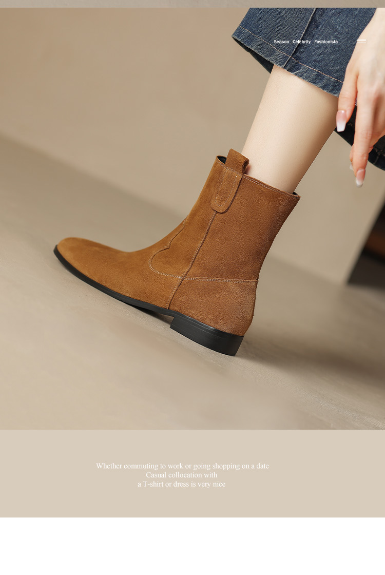 빈티지 젖빛 소가죽 청키 힐 앵클 부츠 여성용 미드 힐 2023 가을과 겨울 새로운 정품 가죽 마틴 부츠 뾰족한 발가락 미드 부츠스토어 가기