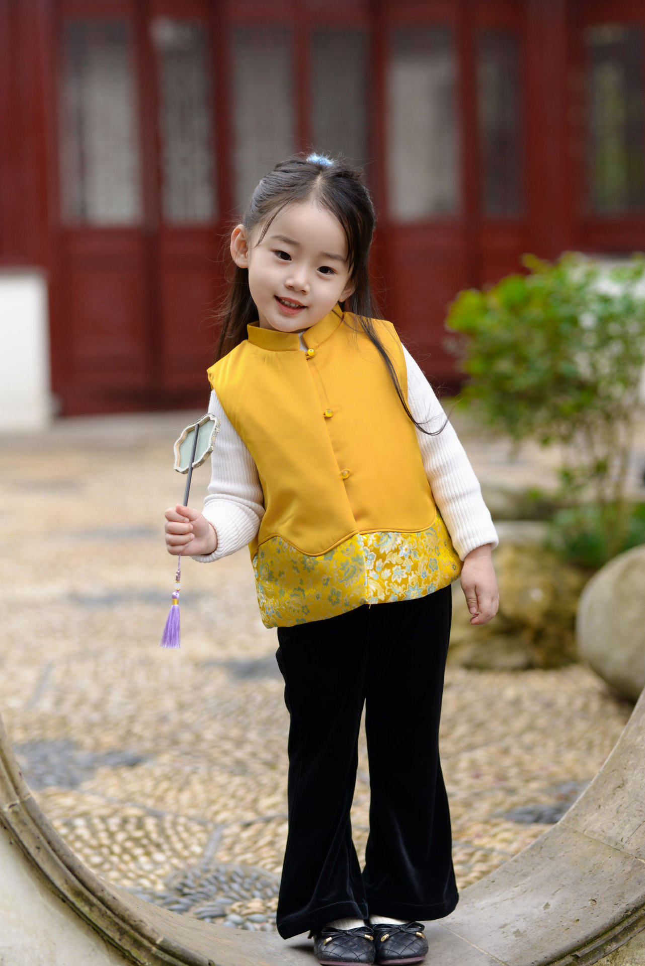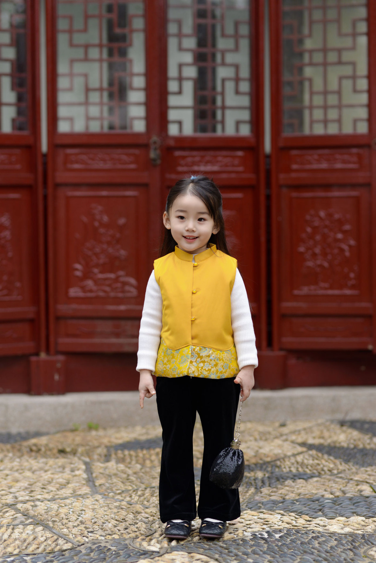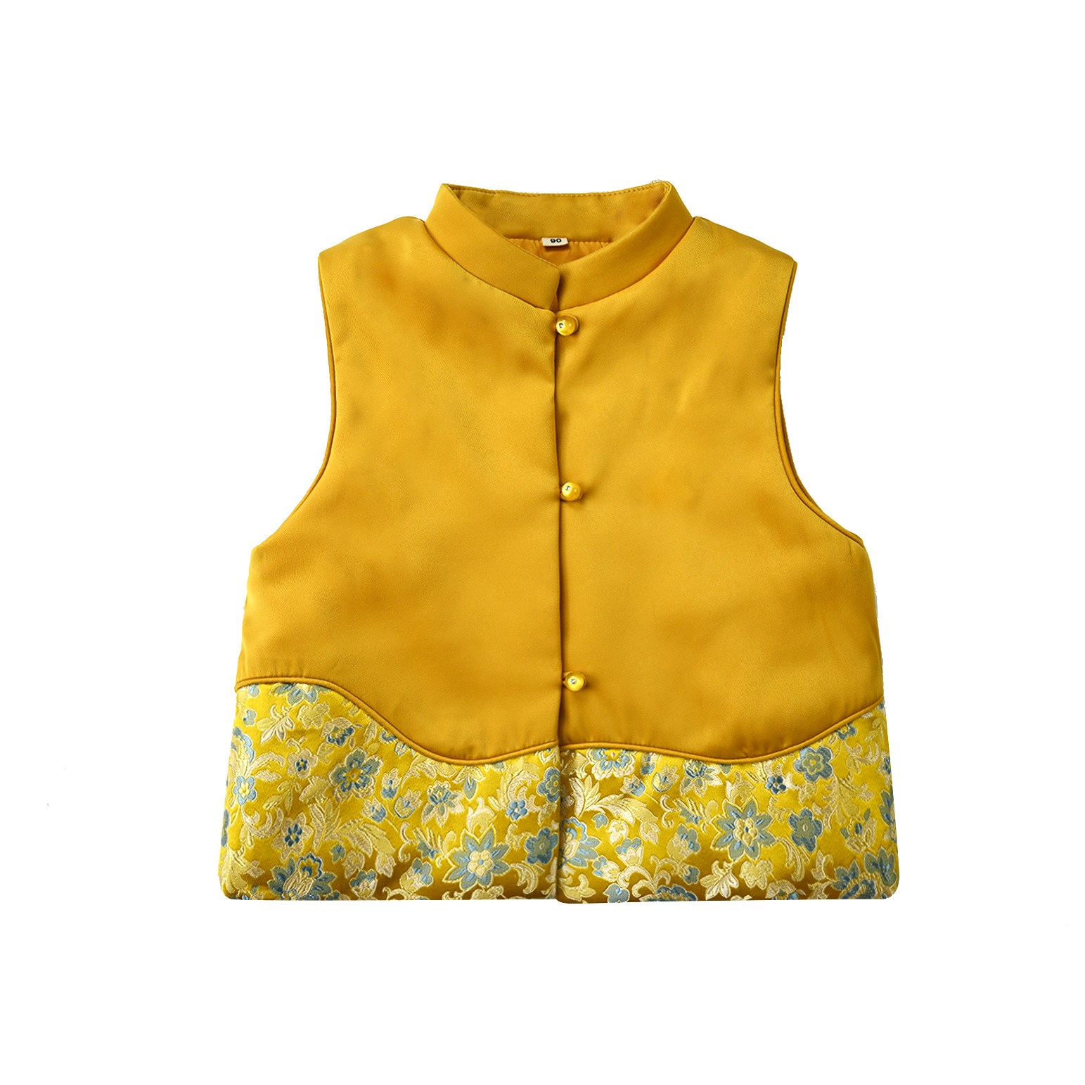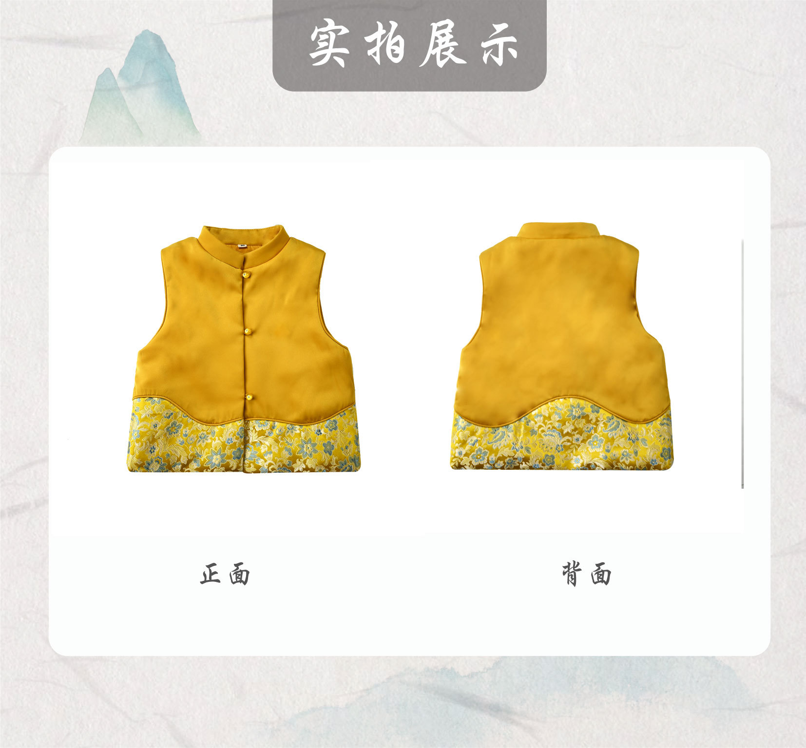 황금 노란색 조끼 가을과 겨울 여아 조끼 아기의 새해 의류 탱 세트 스티치 자카드 조끼 Hanfu스토어 가기