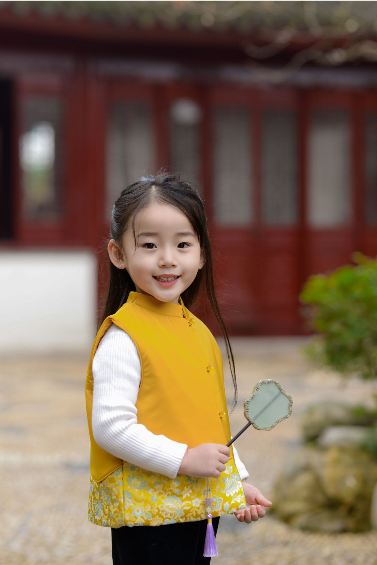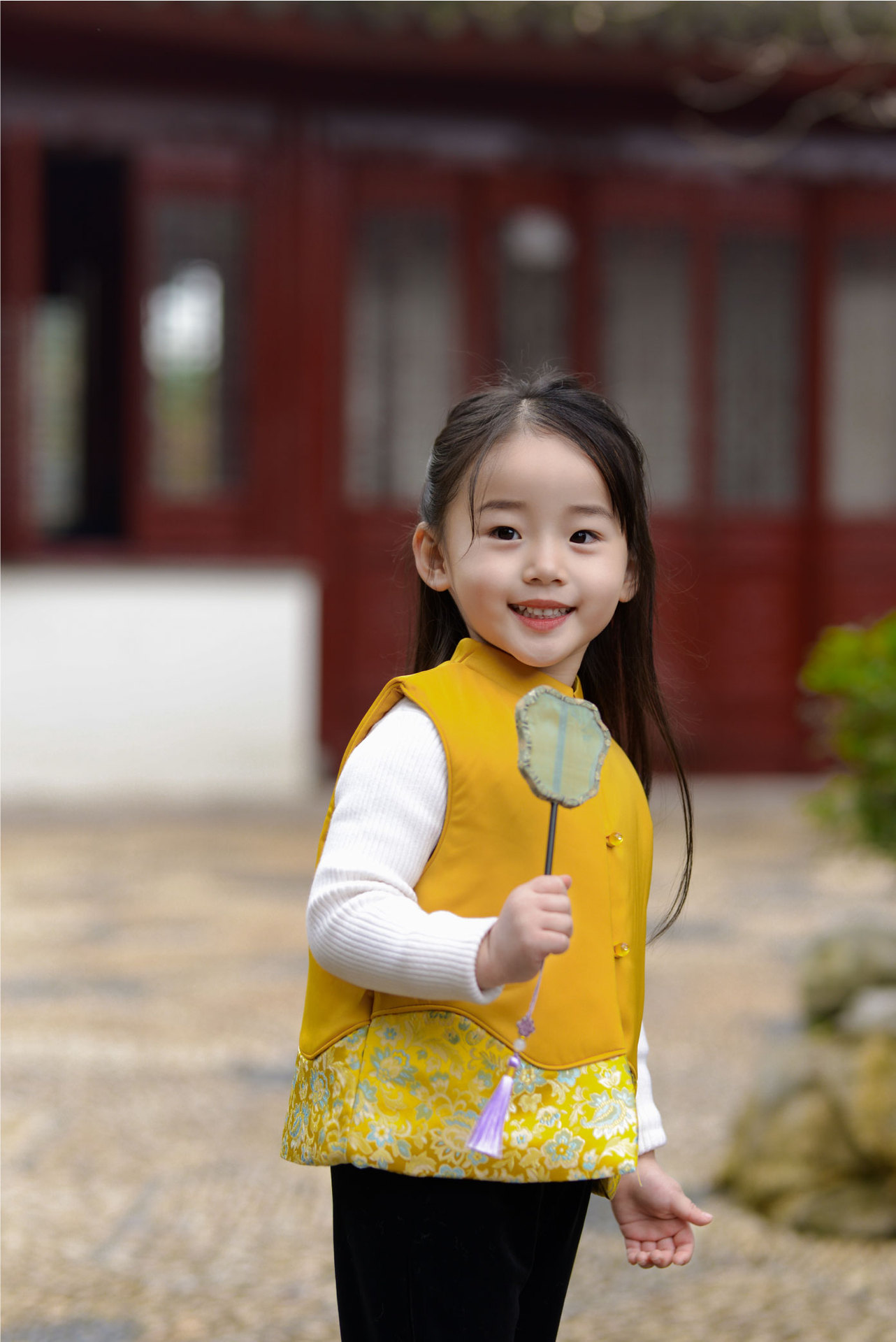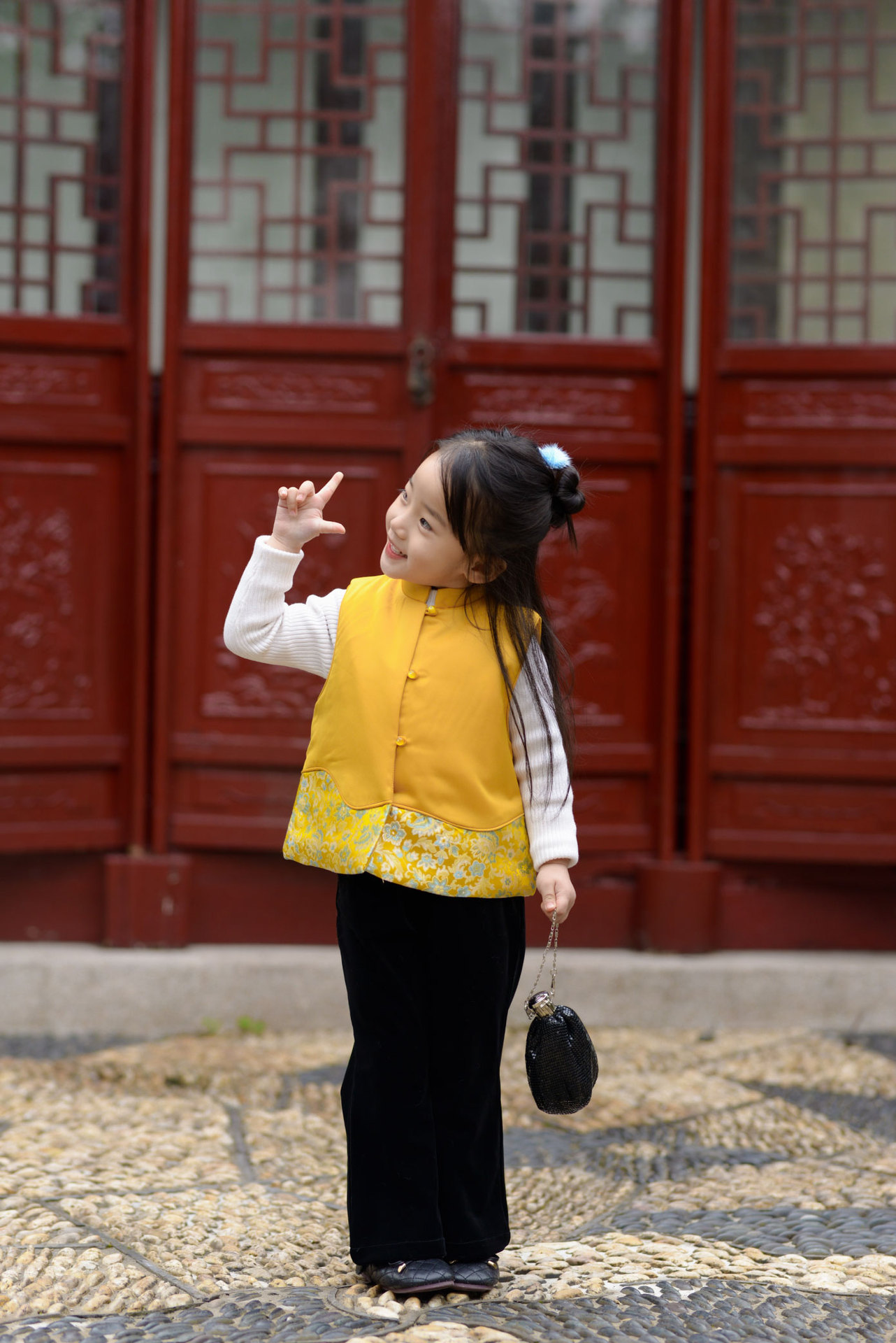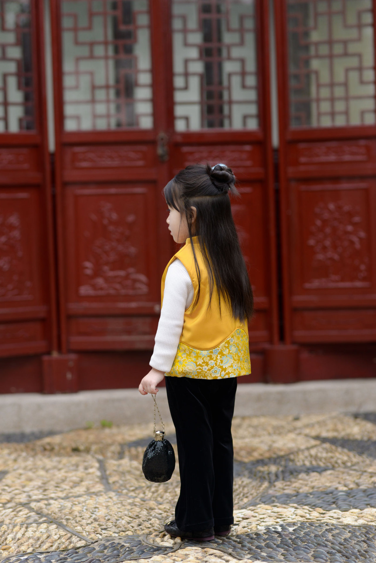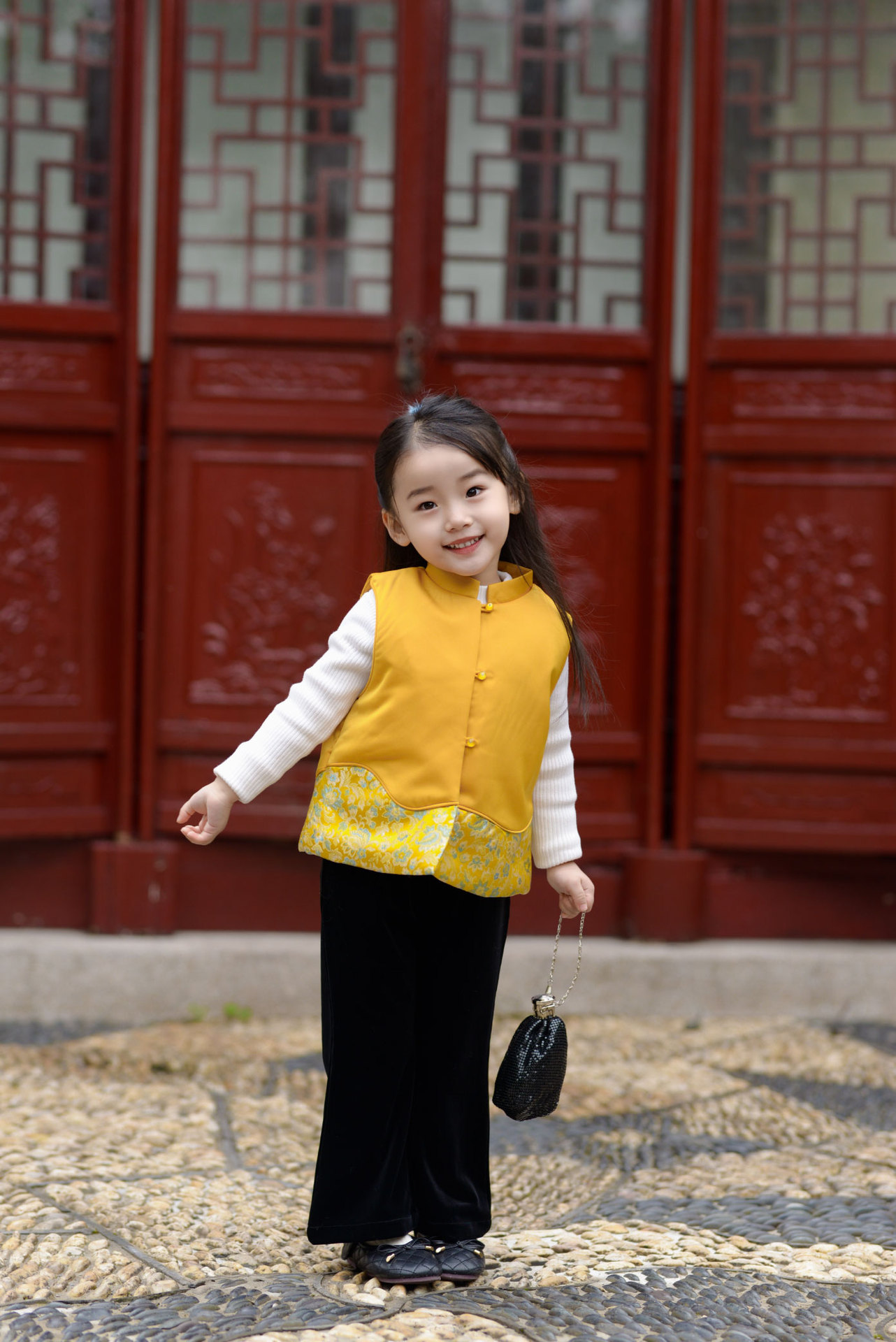 황금 노란색 조끼 가을과 겨울 여아 조끼 아기의 새해 의류 탱 세트 스티치 자카드 조끼 Hanfu스토어 가기