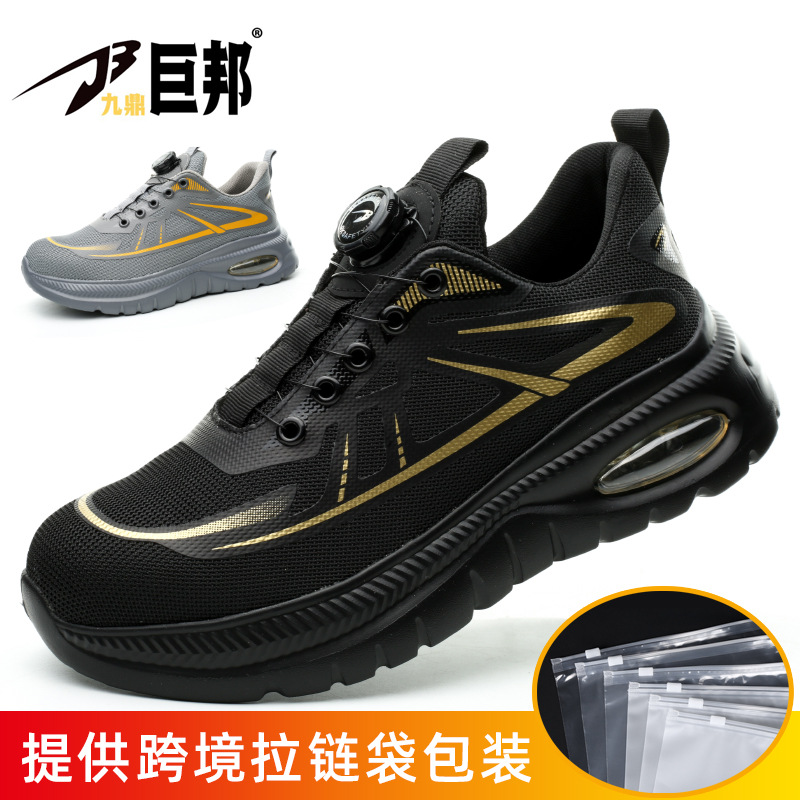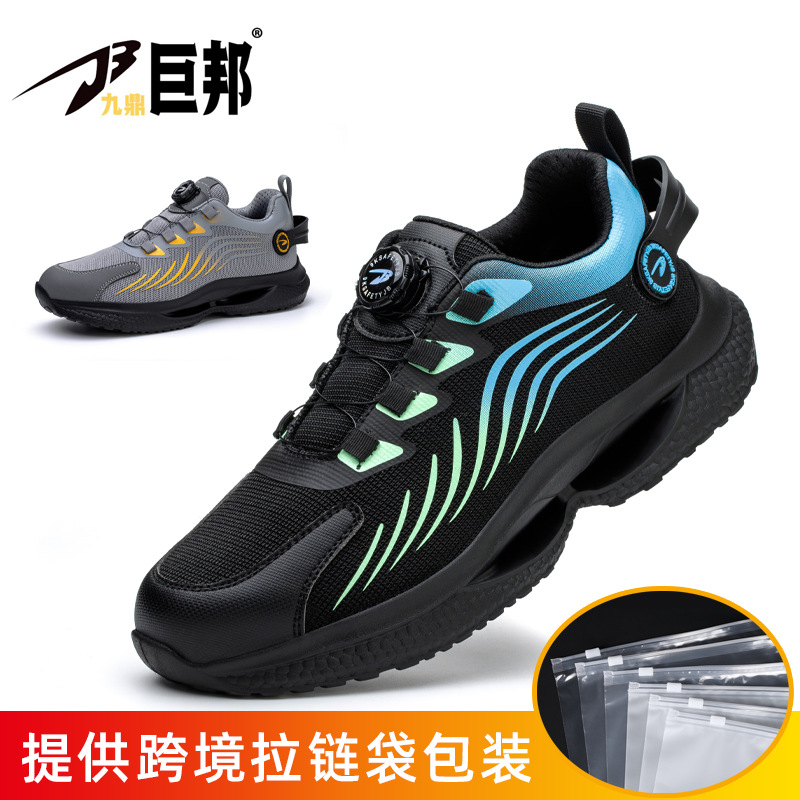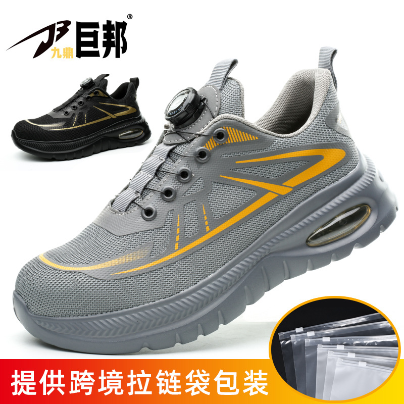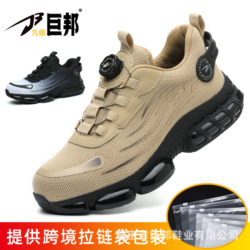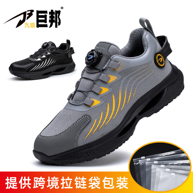 국경을 넘는 간편 신발끈 없는 안전화, 회전 버튼 남성용 안전화, 플라이 니트 경량 통기성 안전화