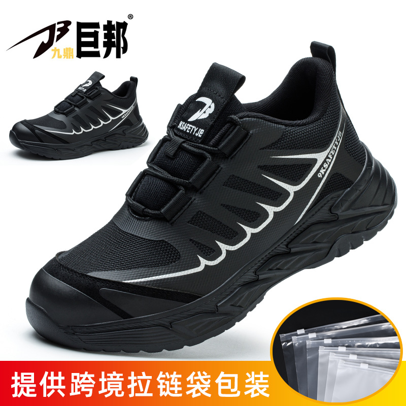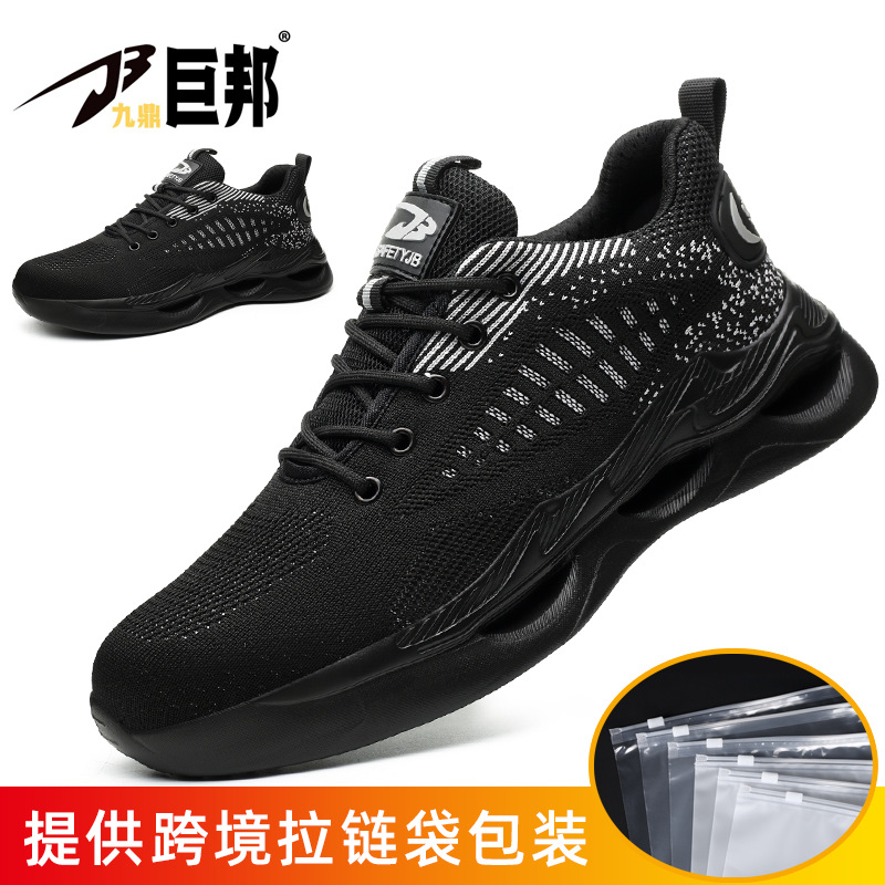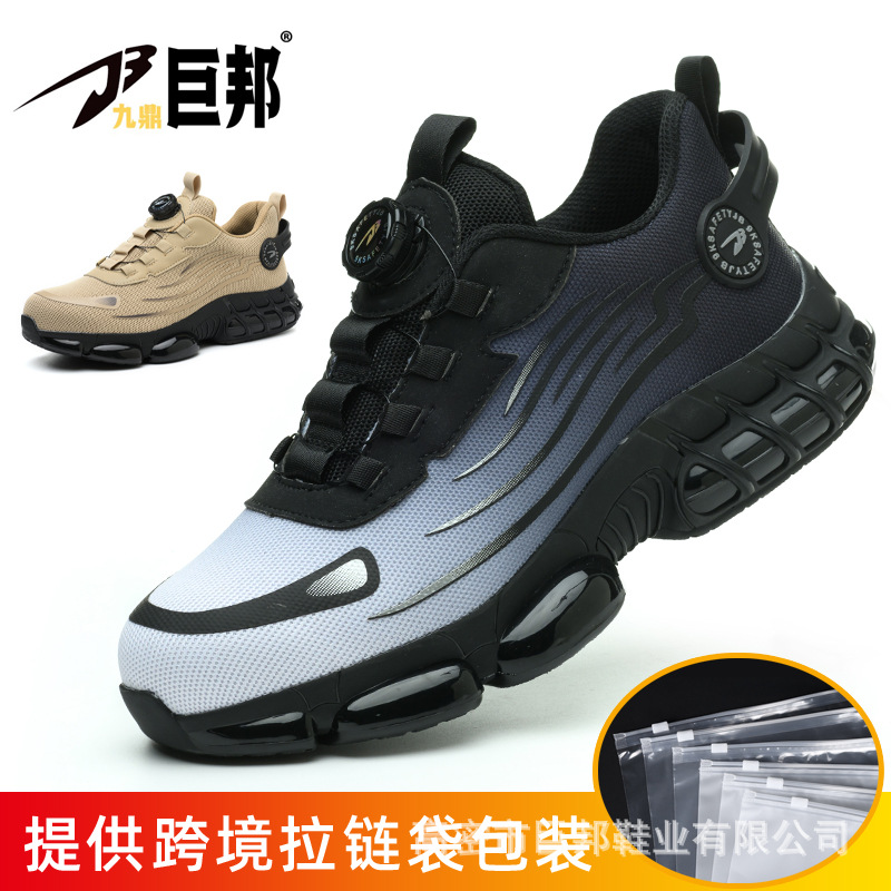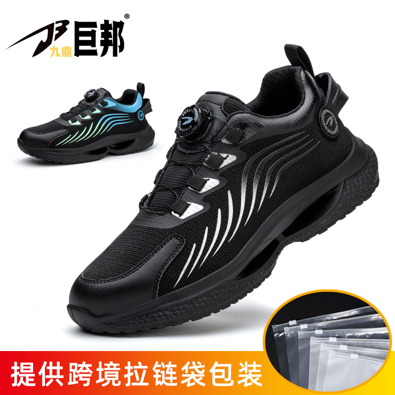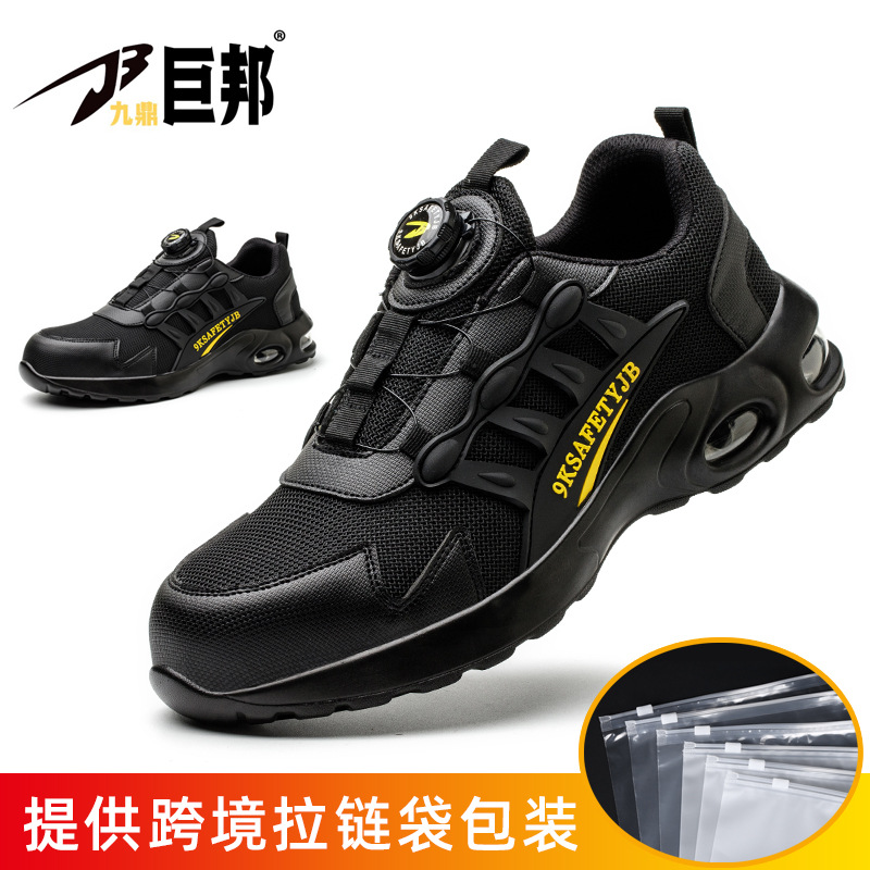 국경을 넘는 간편 신발끈 없는 안전화, 회전 버튼 남성용 안전화, 플라이 니트 경량 통기성 안전화