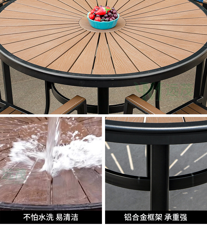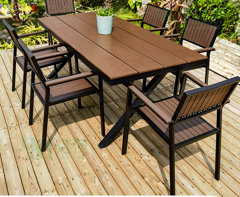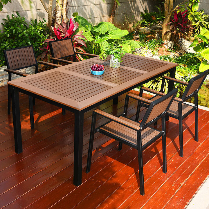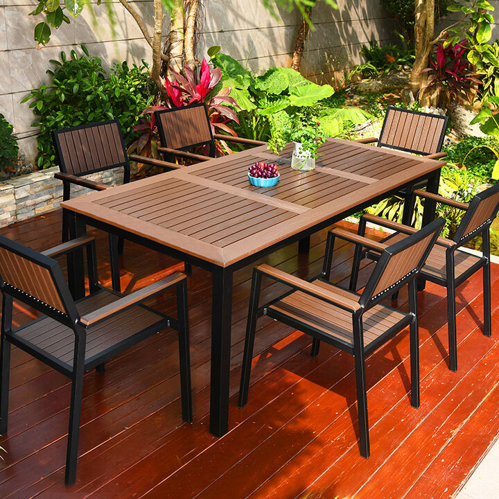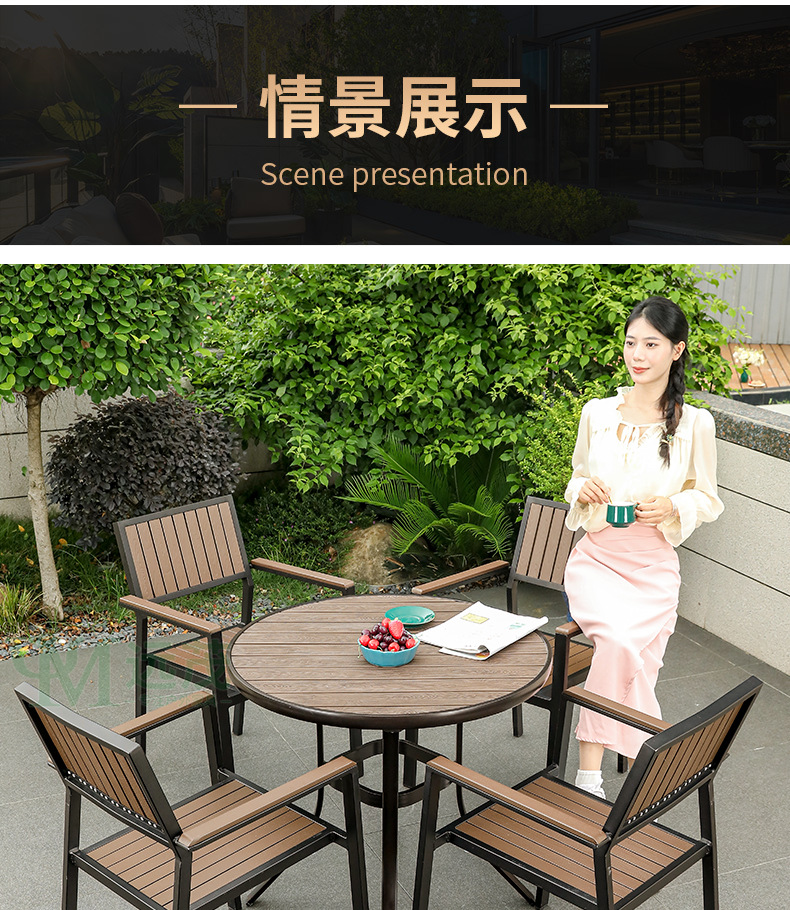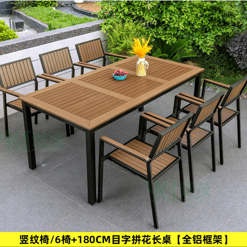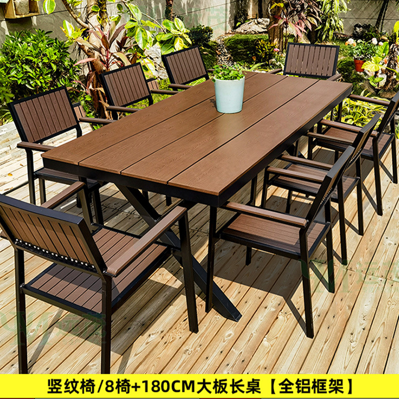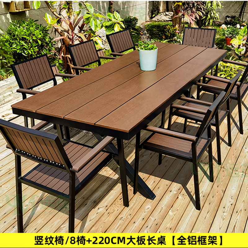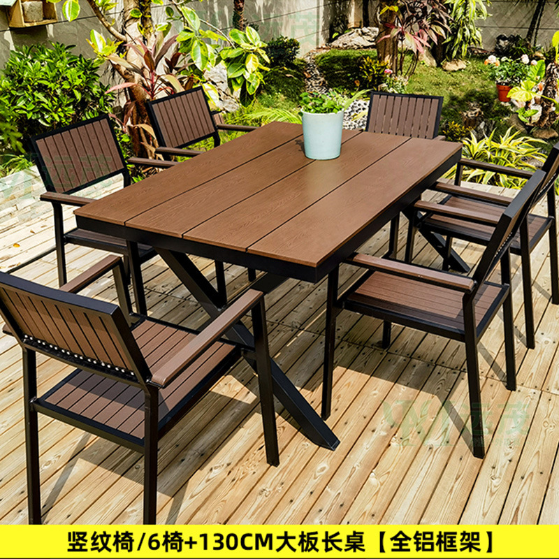 야외 안뜰 플라스틱 목재 테이블과 의자, 부식 방지 목재 알루미늄 합금 레저 빌라 야외 테라스 방수 및 자외선 차단 테이블과 의자