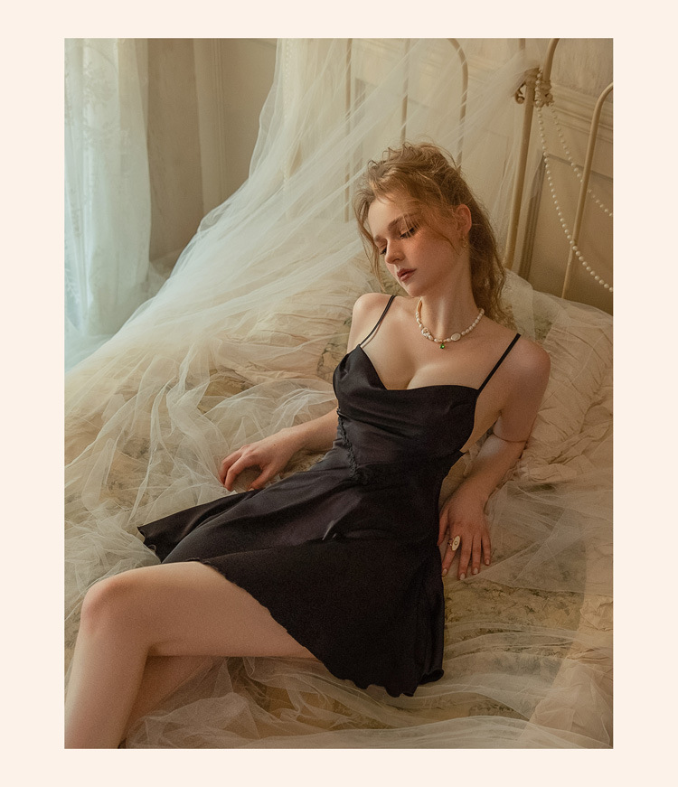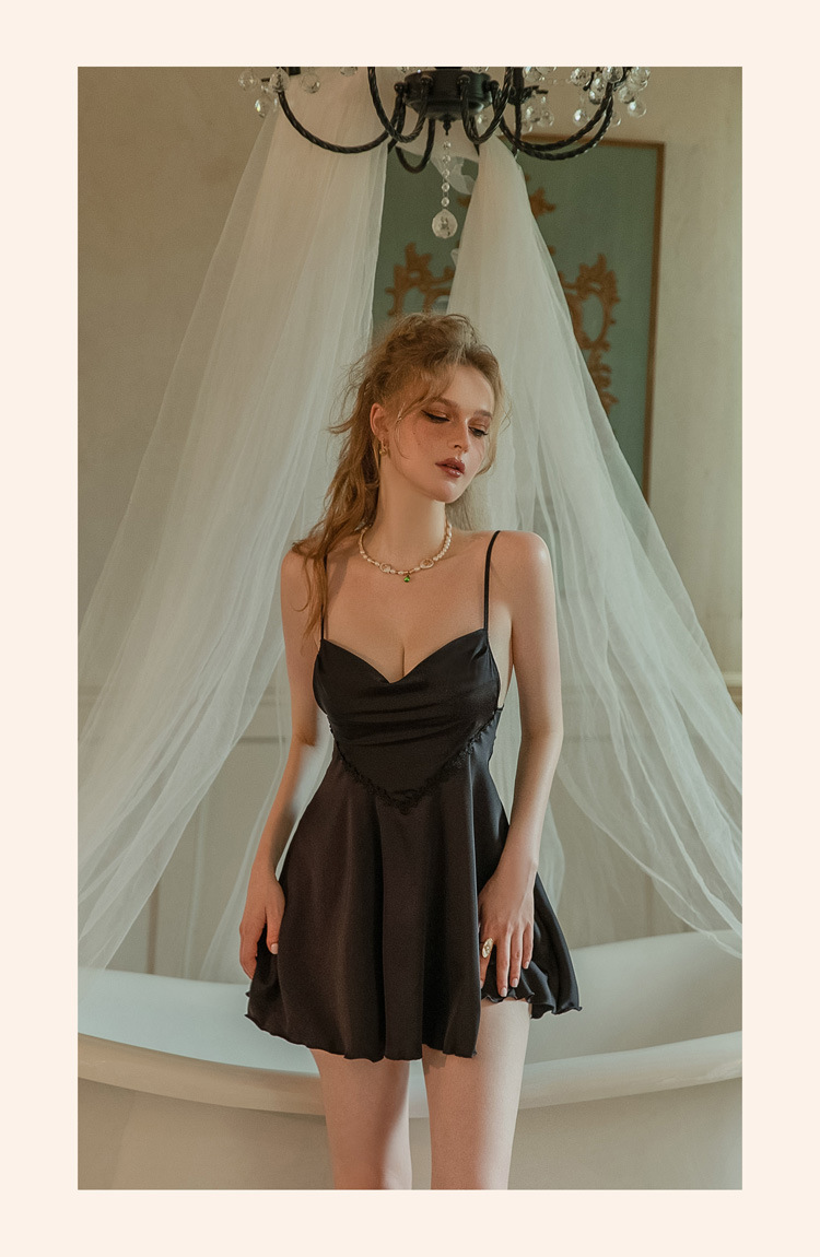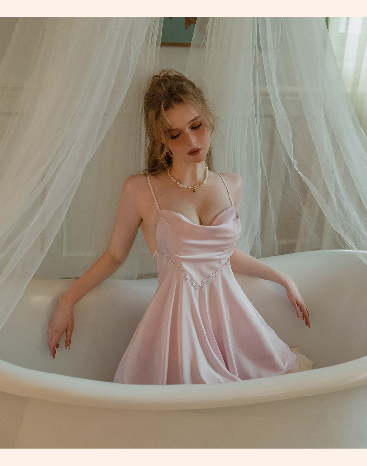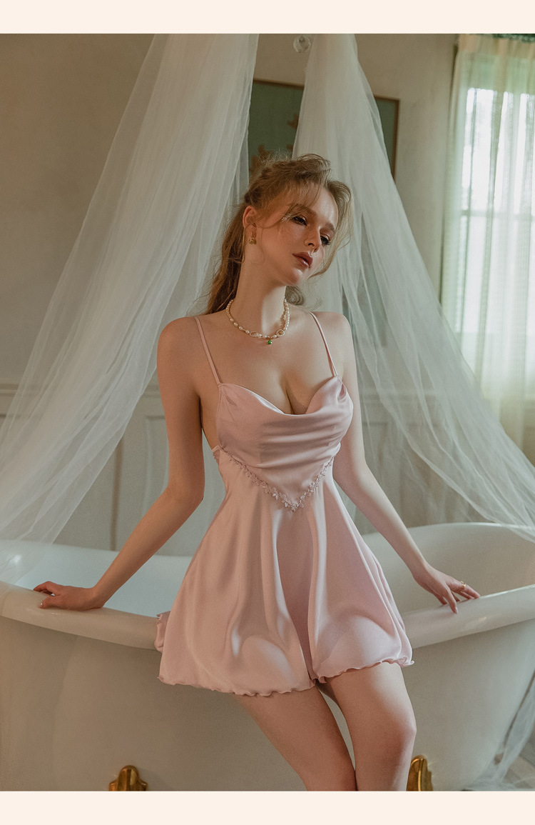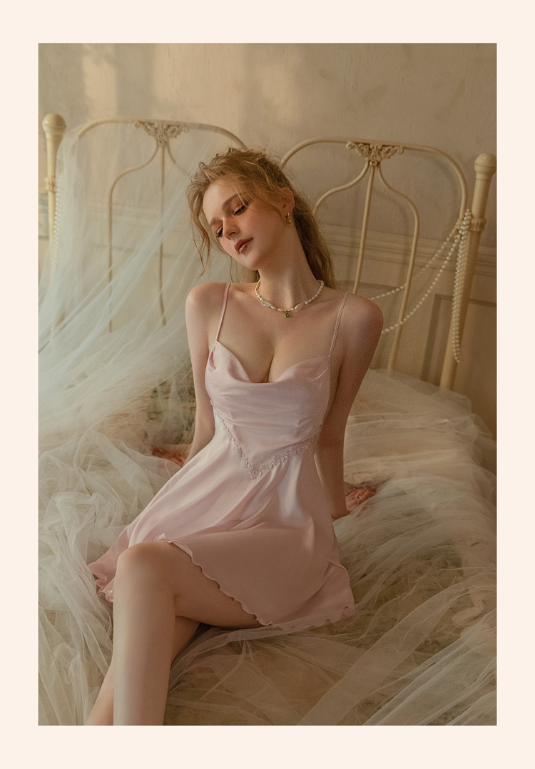 가을 2023 새로운 새틴 벨트 가슴 패드 디자인 감각 섹시한 잠옷 원래 프랑스 순수 요정 스타일 잠옷스토어 가기