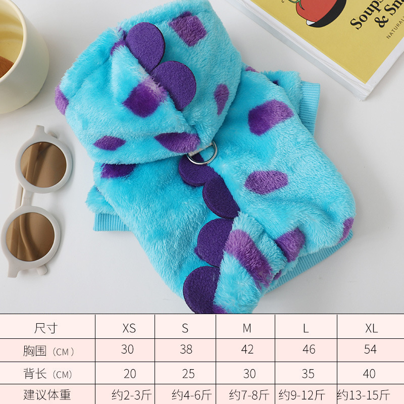 작은 몸 개 Schnery 트랙션 링 버클 블루 웨이브 도트 공룡 반팔 양털 겨울 애완 동물 따뜻한 옷
