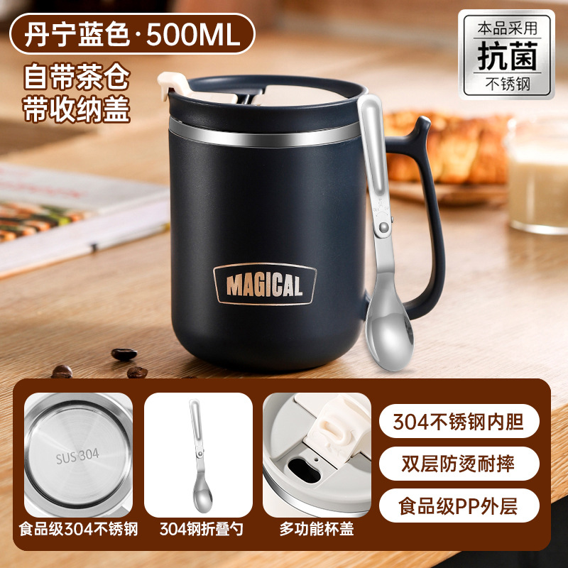 • [커피 머그] + 접이식 스푼 + 스테인레스 스틸 차 배수구 데님 블루