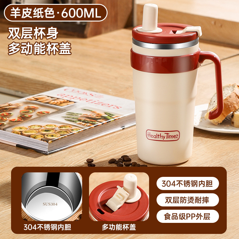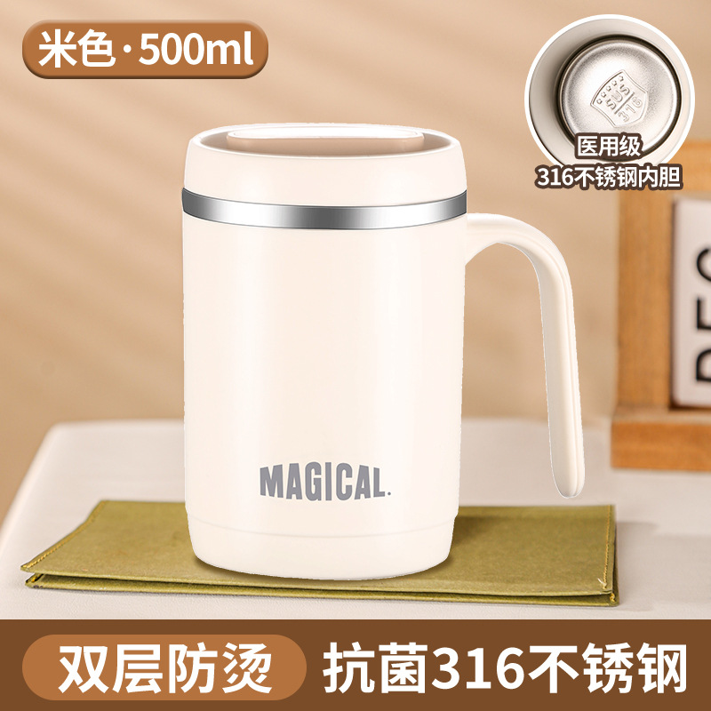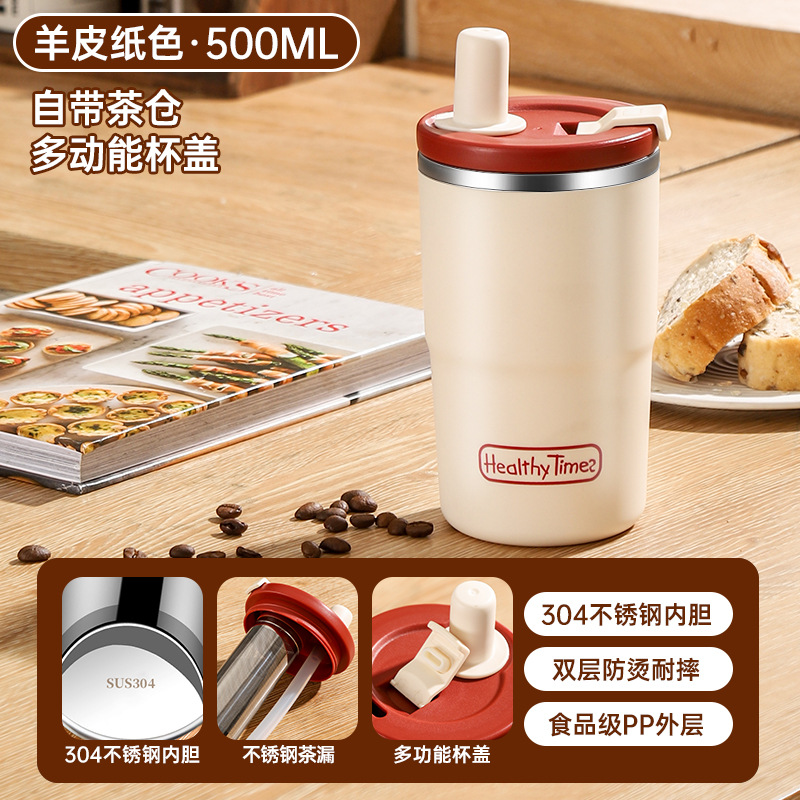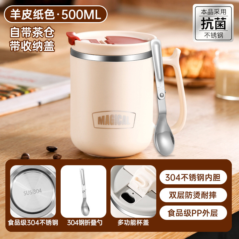 • [커피 머그] + 접이식 스푼 + 스테인레스 스틸 차 배수구, 양피지 색상