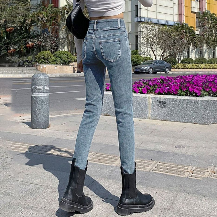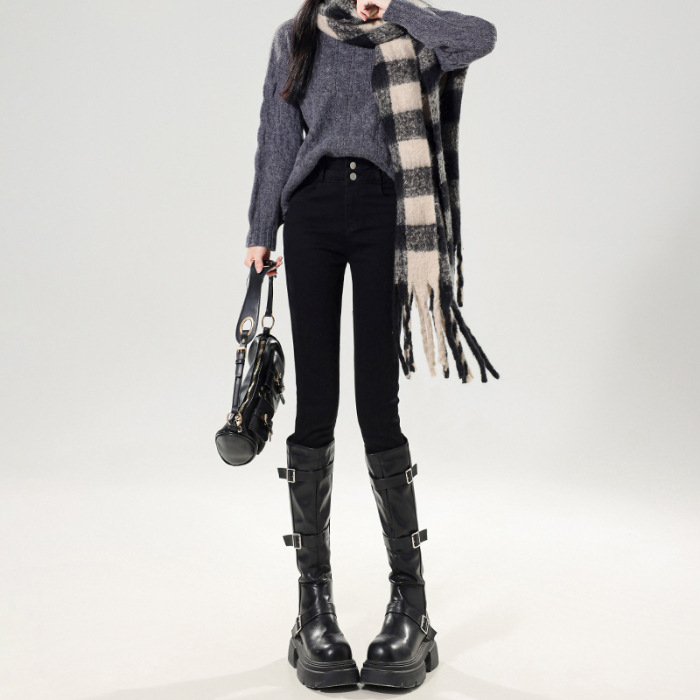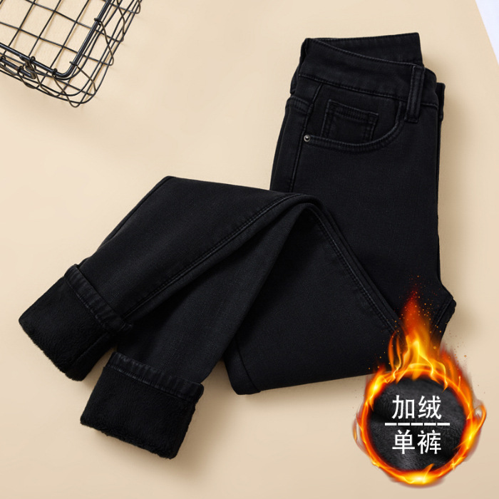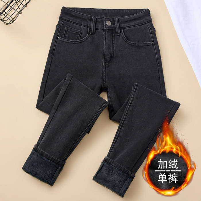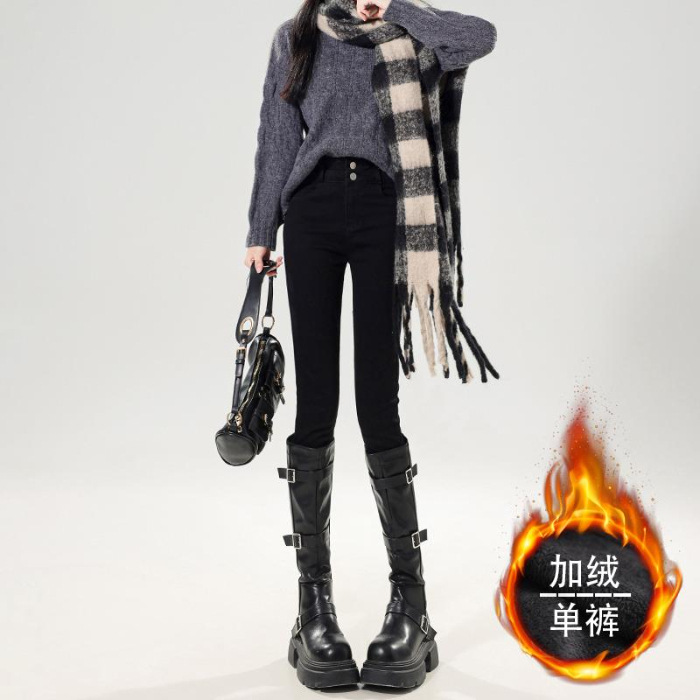 벨벳 데님 팬츠 여성용 신축성 높은 허리 슬림핏 스키니 팬츠 겨울 2026년 신상 두꺼운 보온 타이트 팬츠