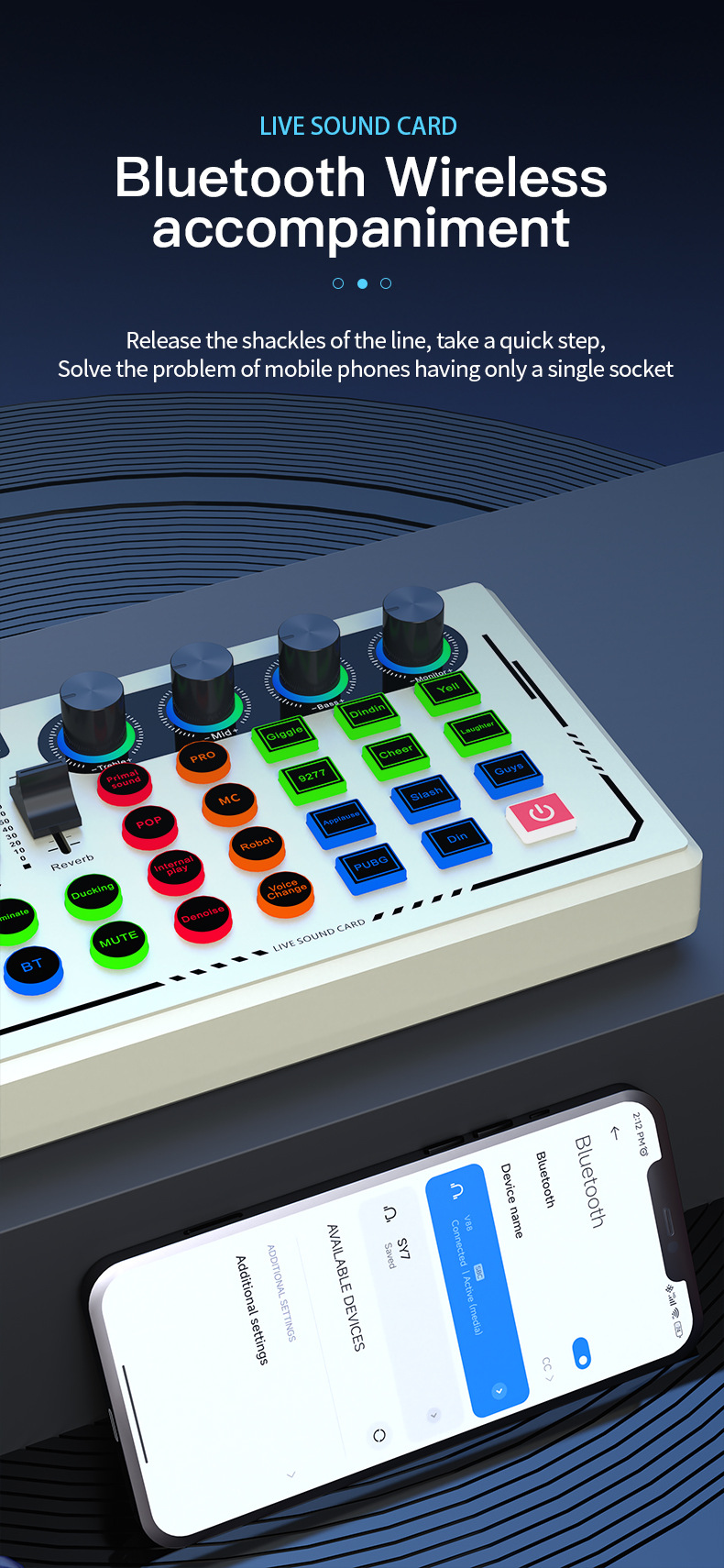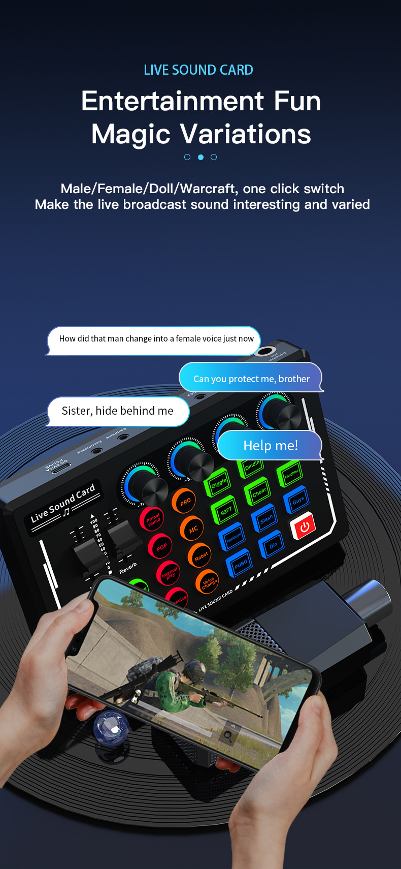 A6 라이브 방송 사운드 카드 믹서 다채로운 조명 효과가있는 영어 버전을 6.35 동적 코일 녹음 노래에 삽입 할 수 있습니다.