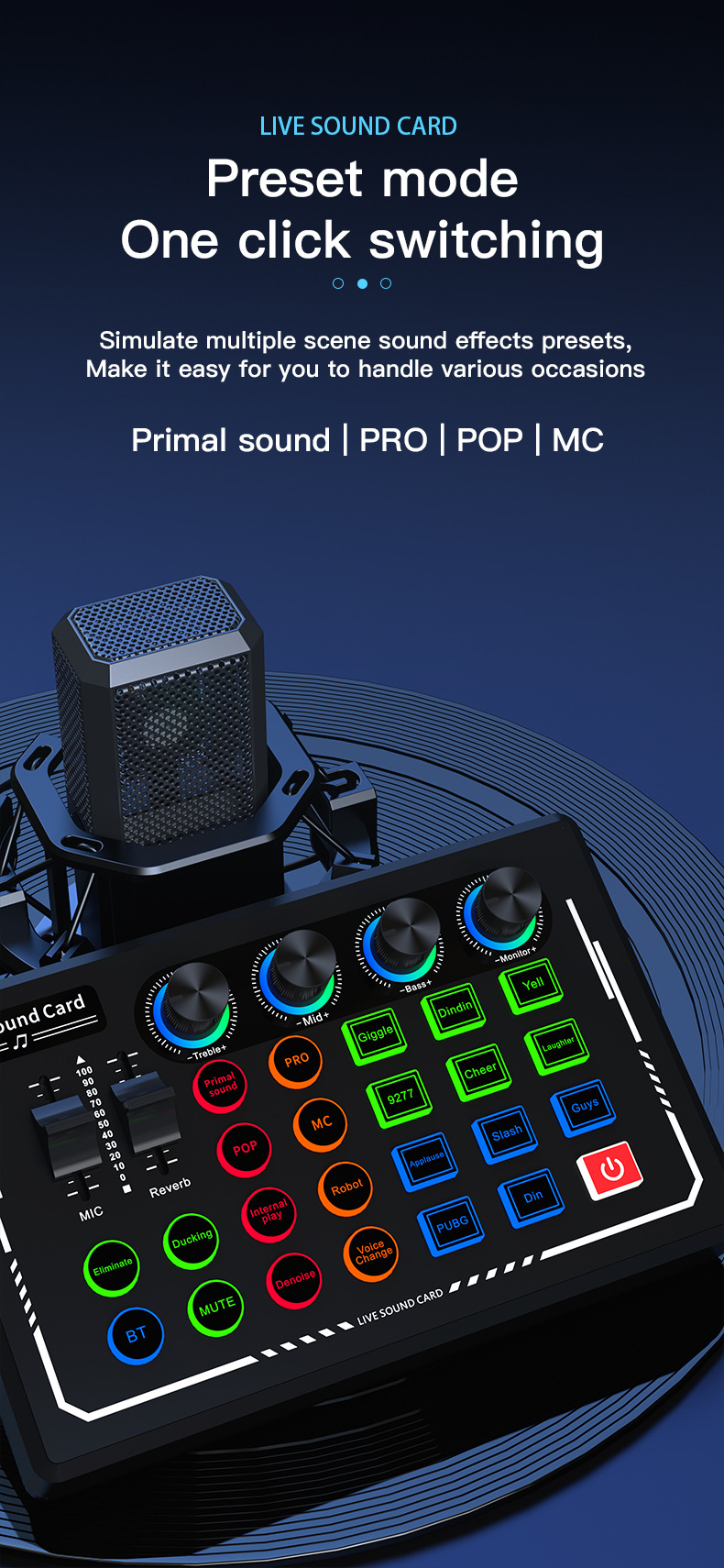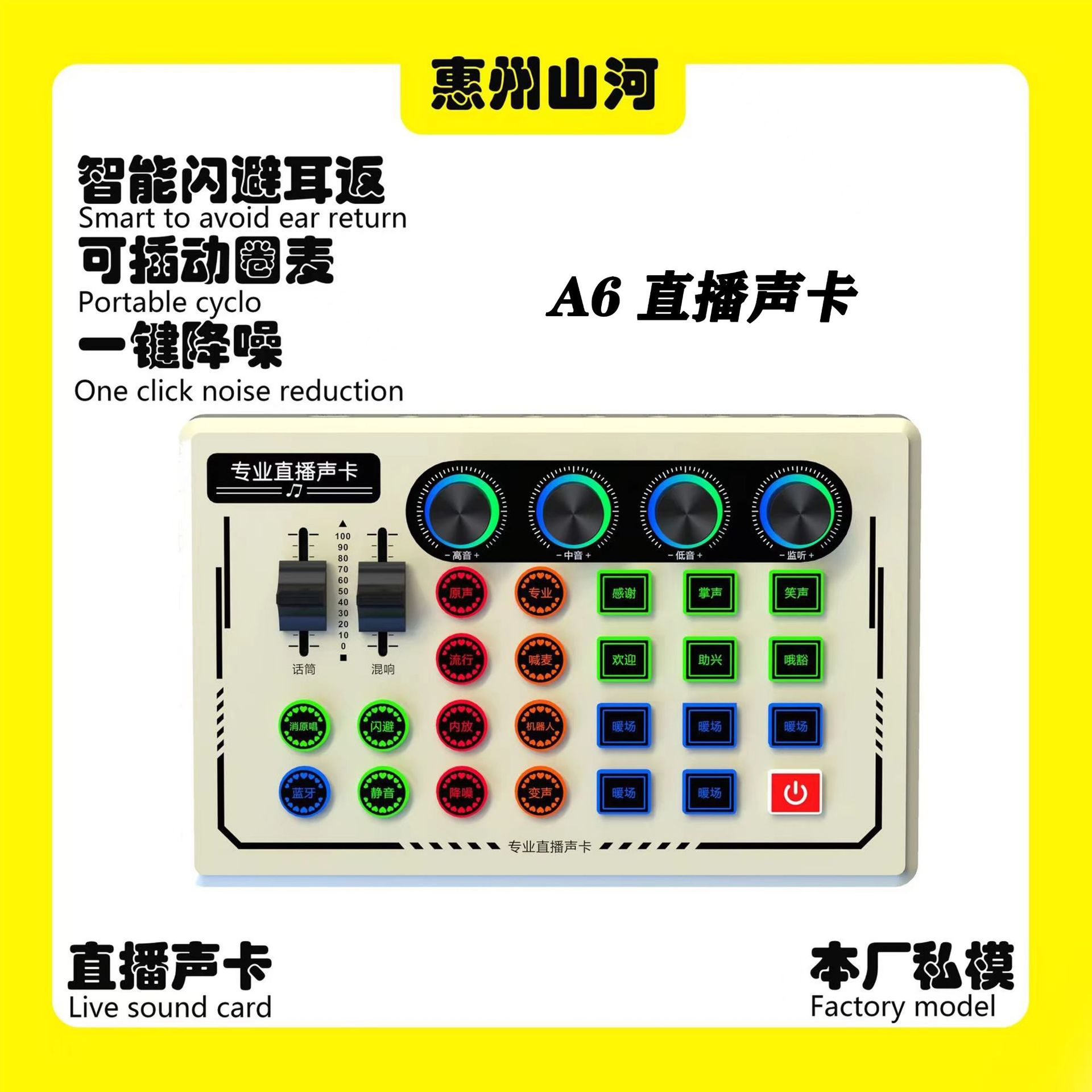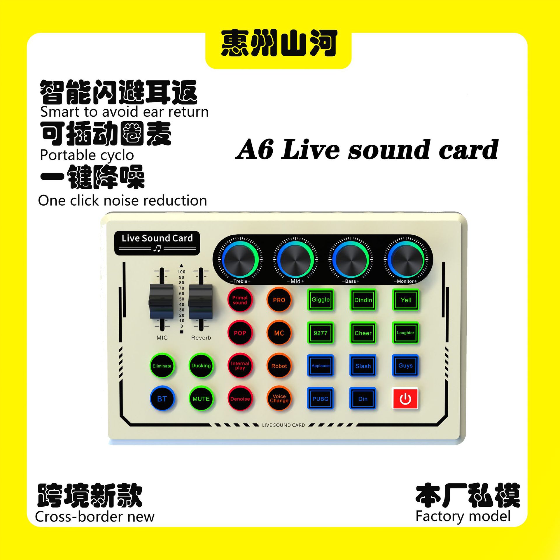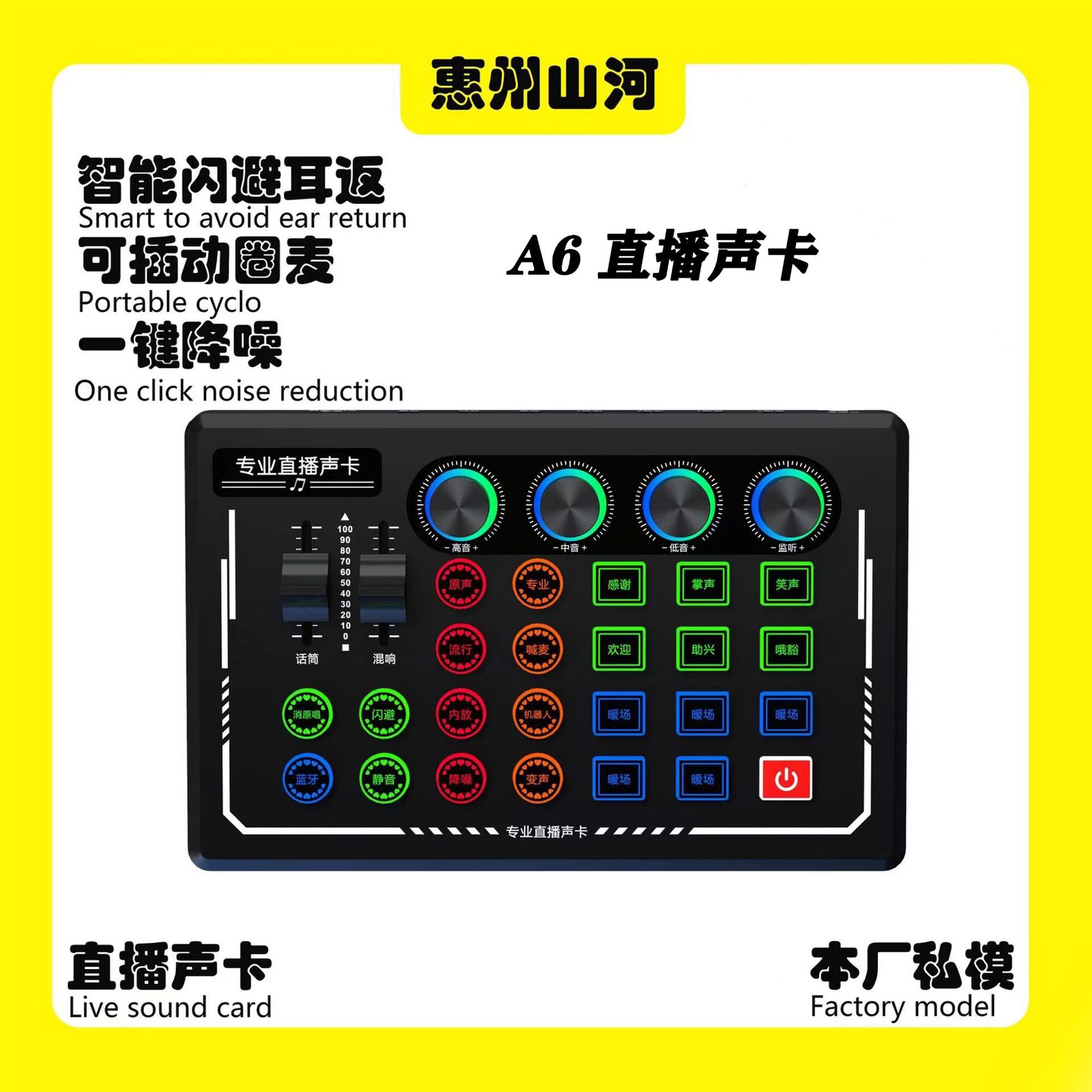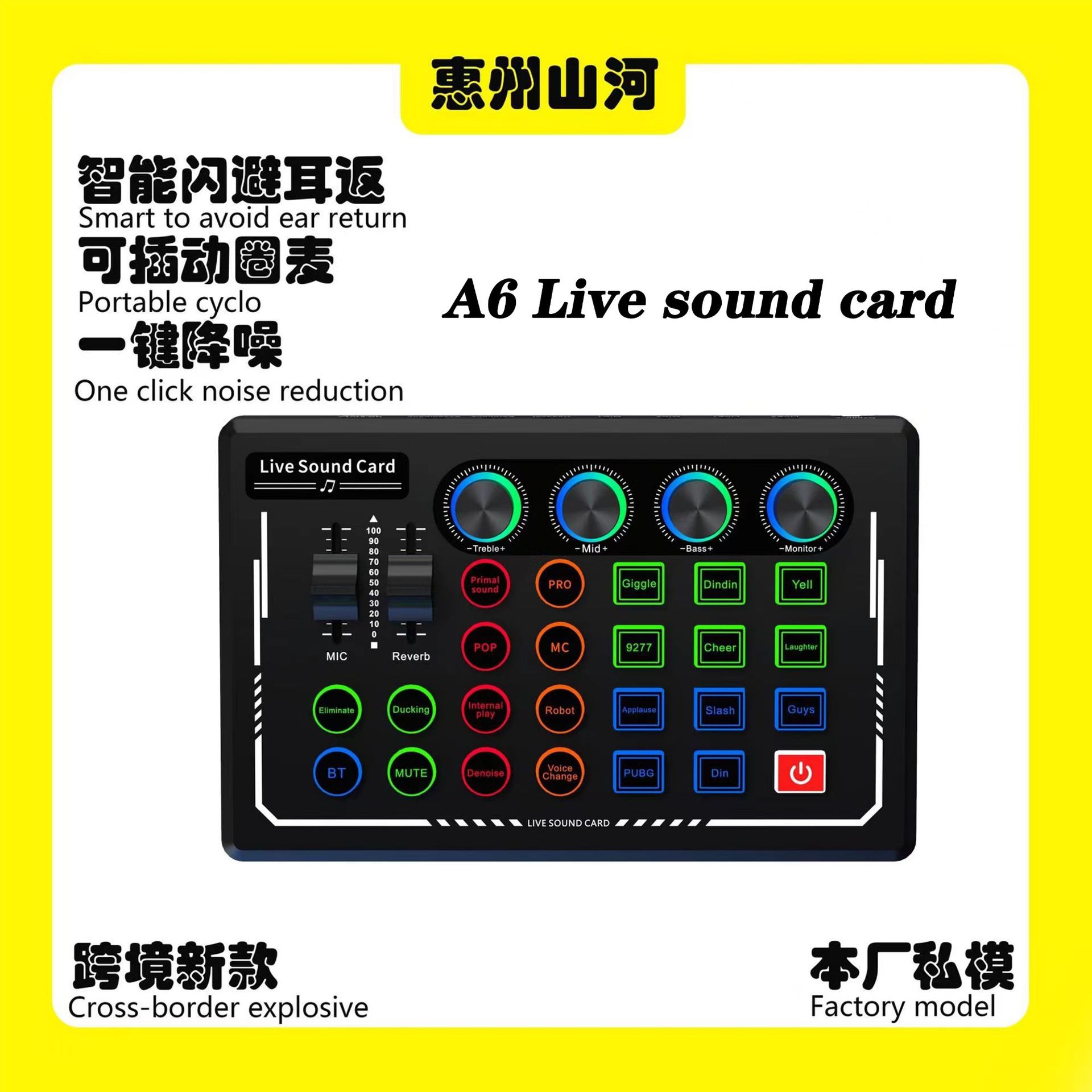 A6 라이브 방송 사운드 카드 믹서 다채로운 조명 효과가있는 영어 버전을 6.35 동적 코일 녹음 노래에 삽입 할 수 있습니다.스토어 가기