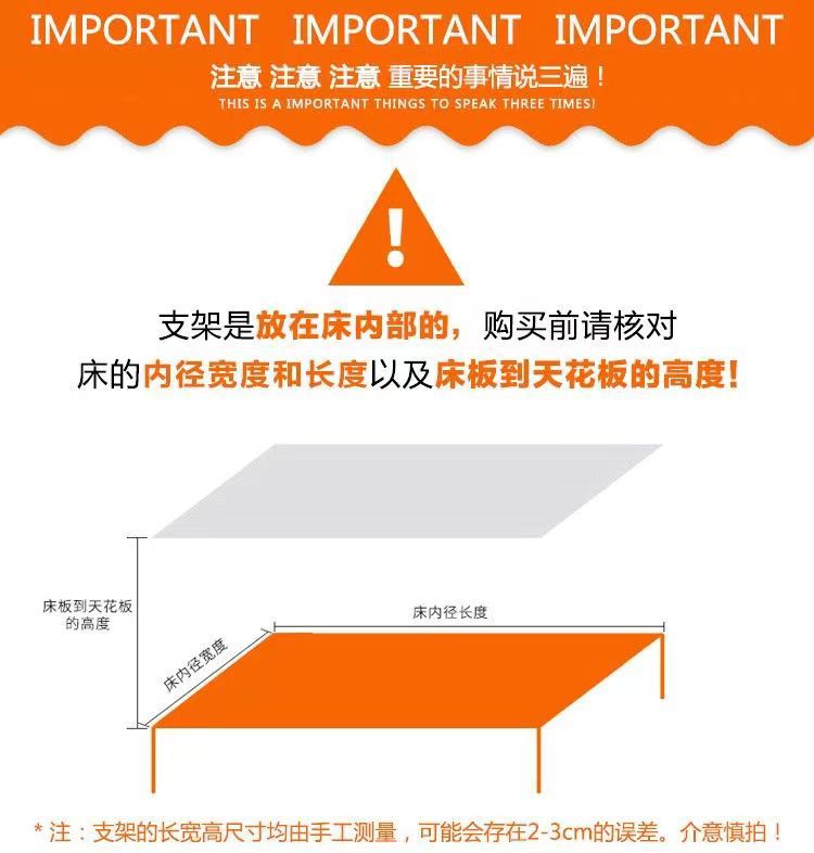 下单知悉:本链接图片上展示出来的所有床品,主要是为了更好更直观体现出支架的作用及使用场景,而非配套支架售卖的,如有不明白的问题,可联系客服专员,我们将力争以最快的速度为您解答,谢谢观临!