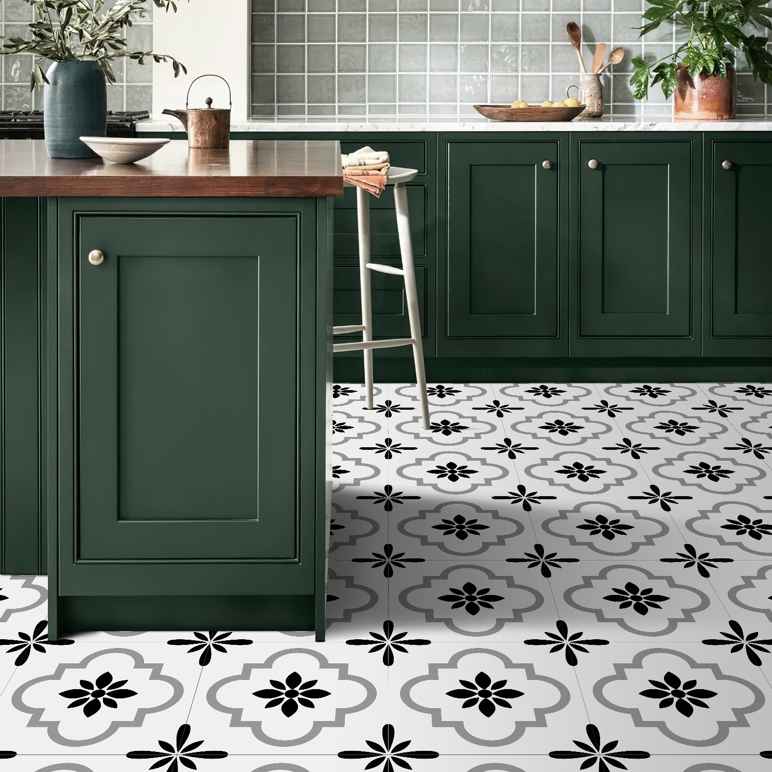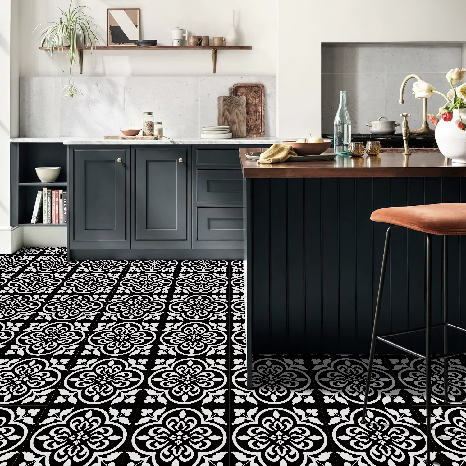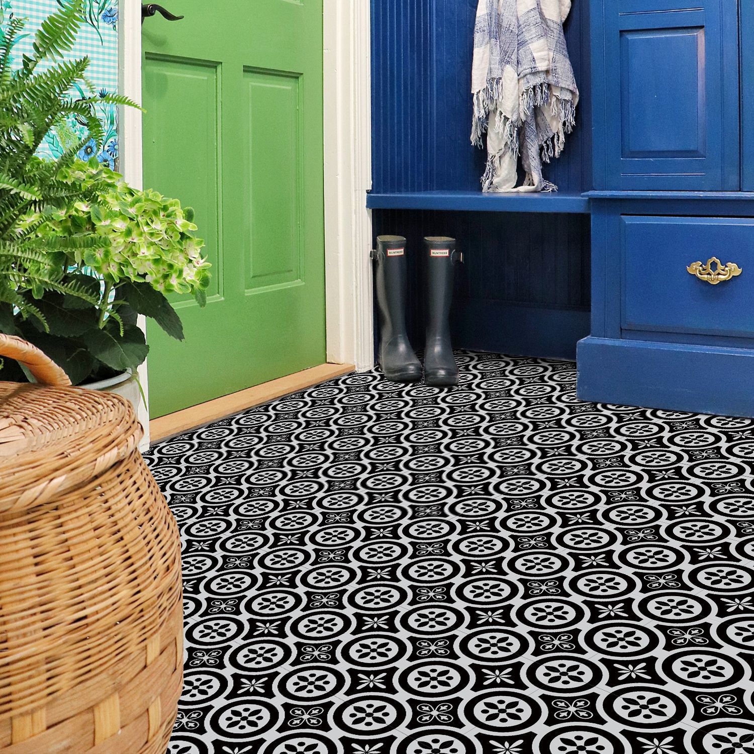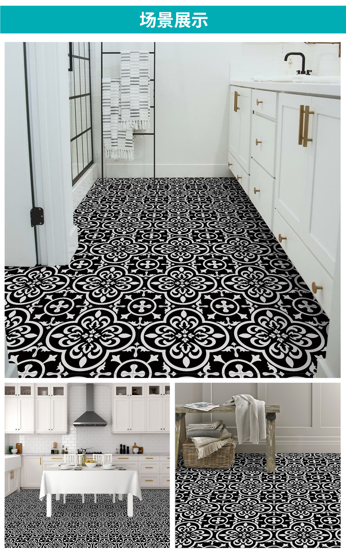 매력 세트 새로운 포르투갈어 흑백 타일 바닥 스티커 침실 욕실 바닥 장식 자체 접착 방수 유럽 바닥 스티커스토어 가기