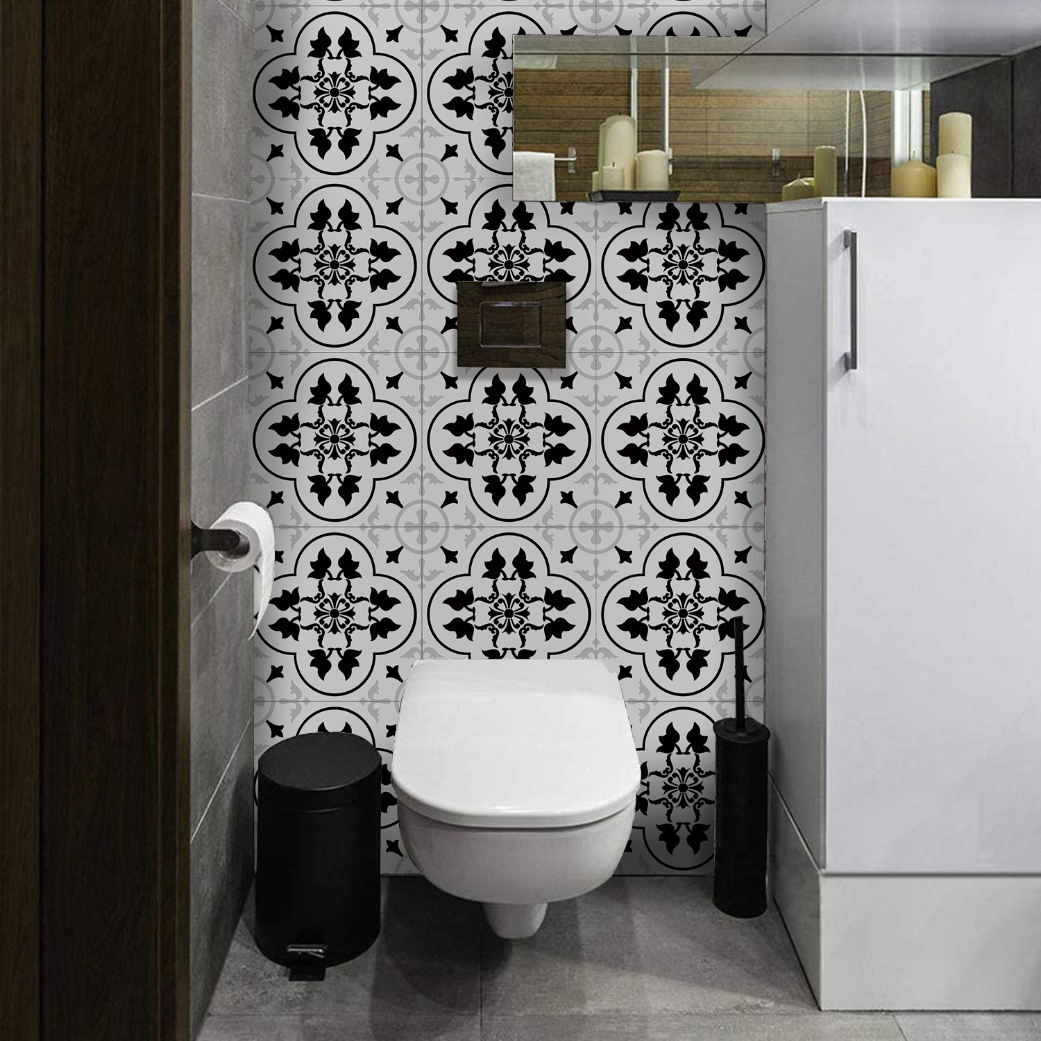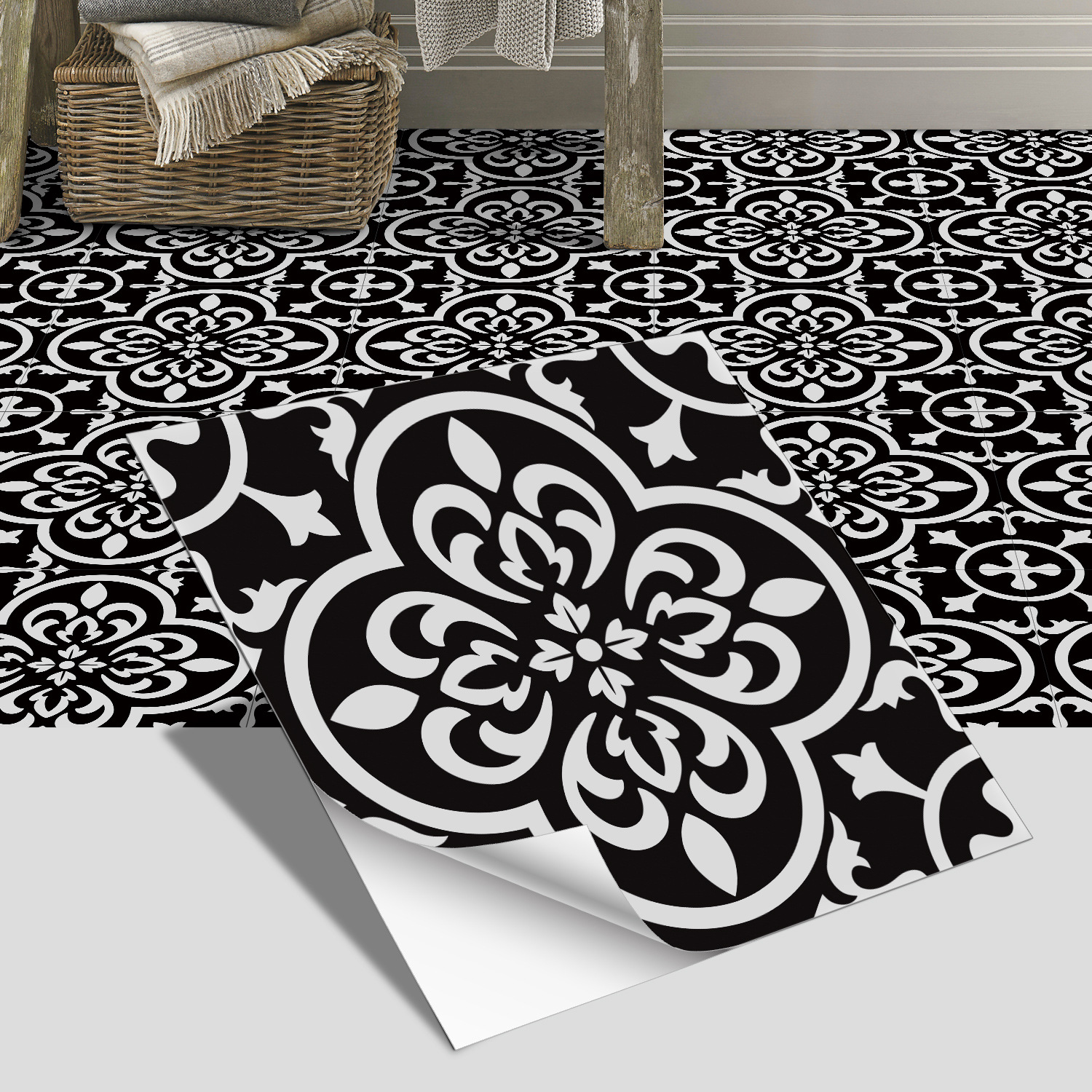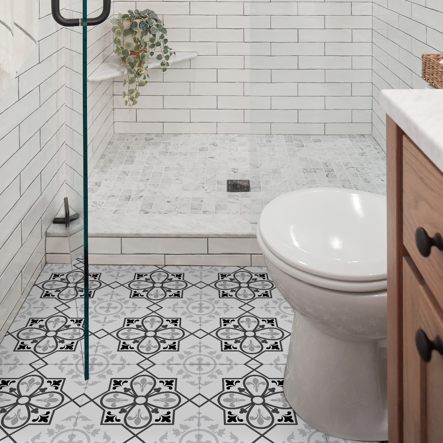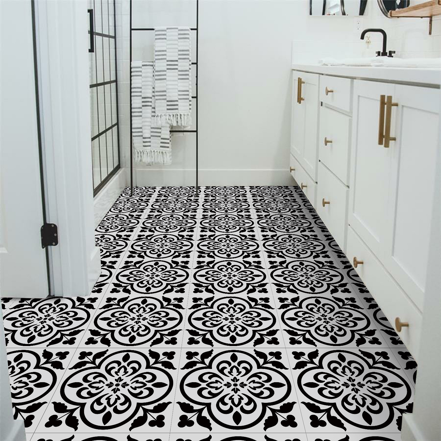 매력 세트 새로운 포르투갈어 흑백 타일 바닥 스티커 침실 욕실 바닥 장식 자체 접착 방수 유럽 바닥 스티커