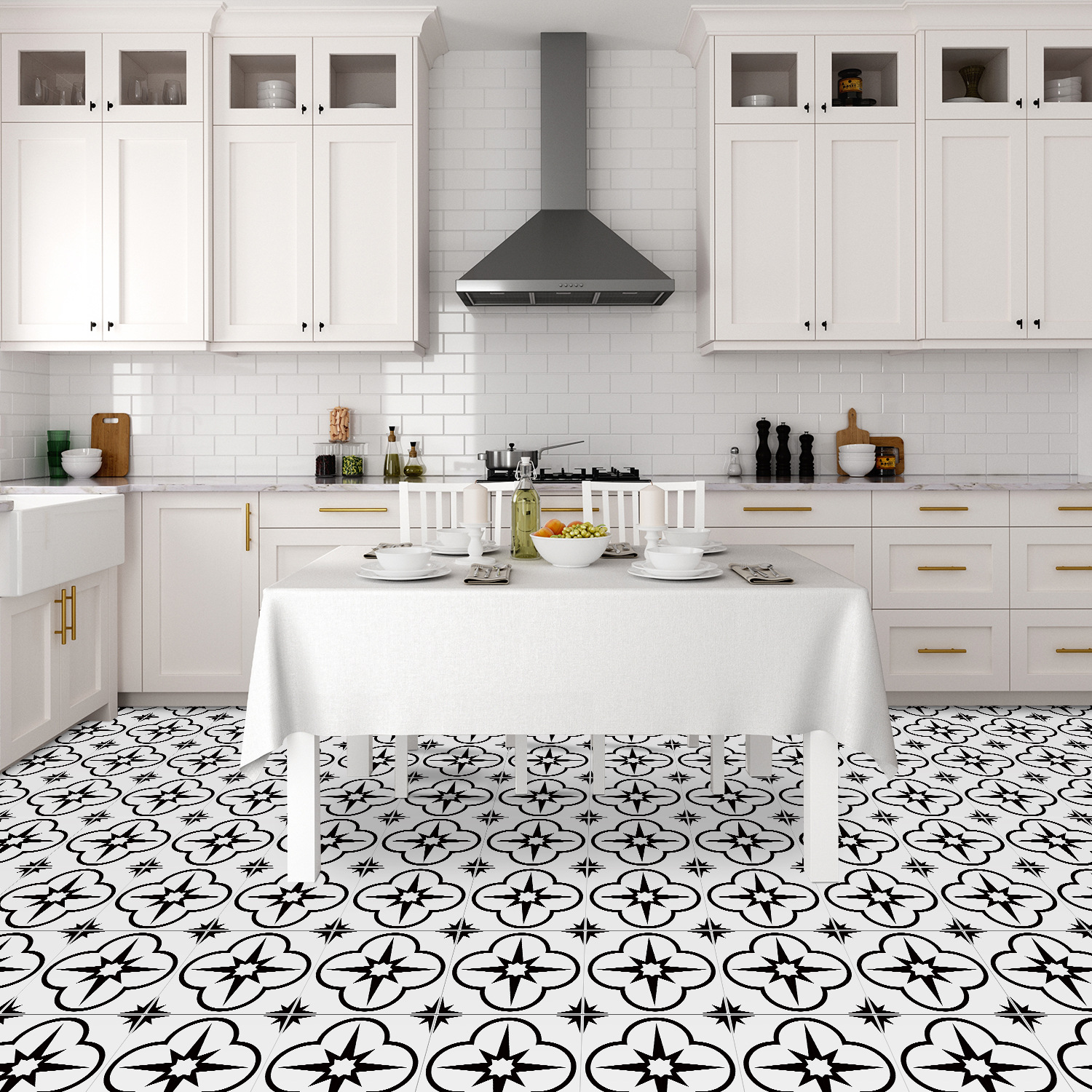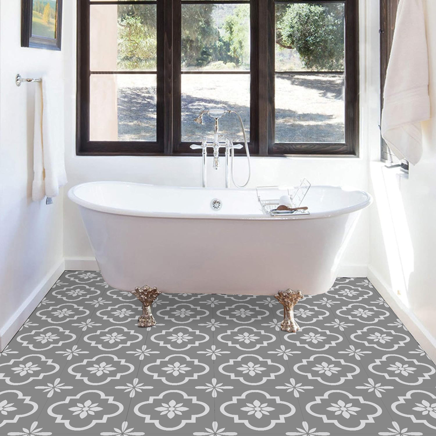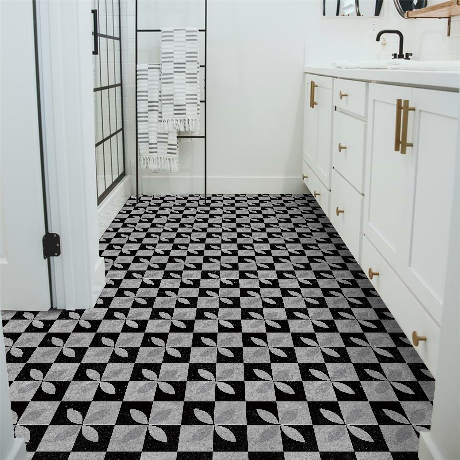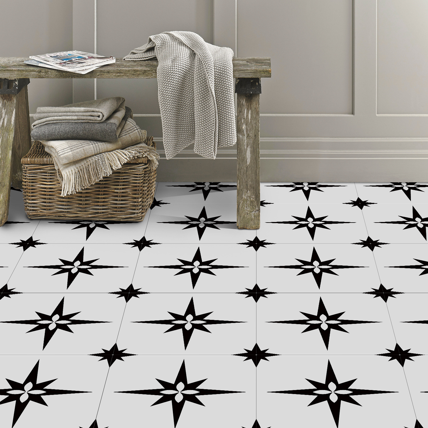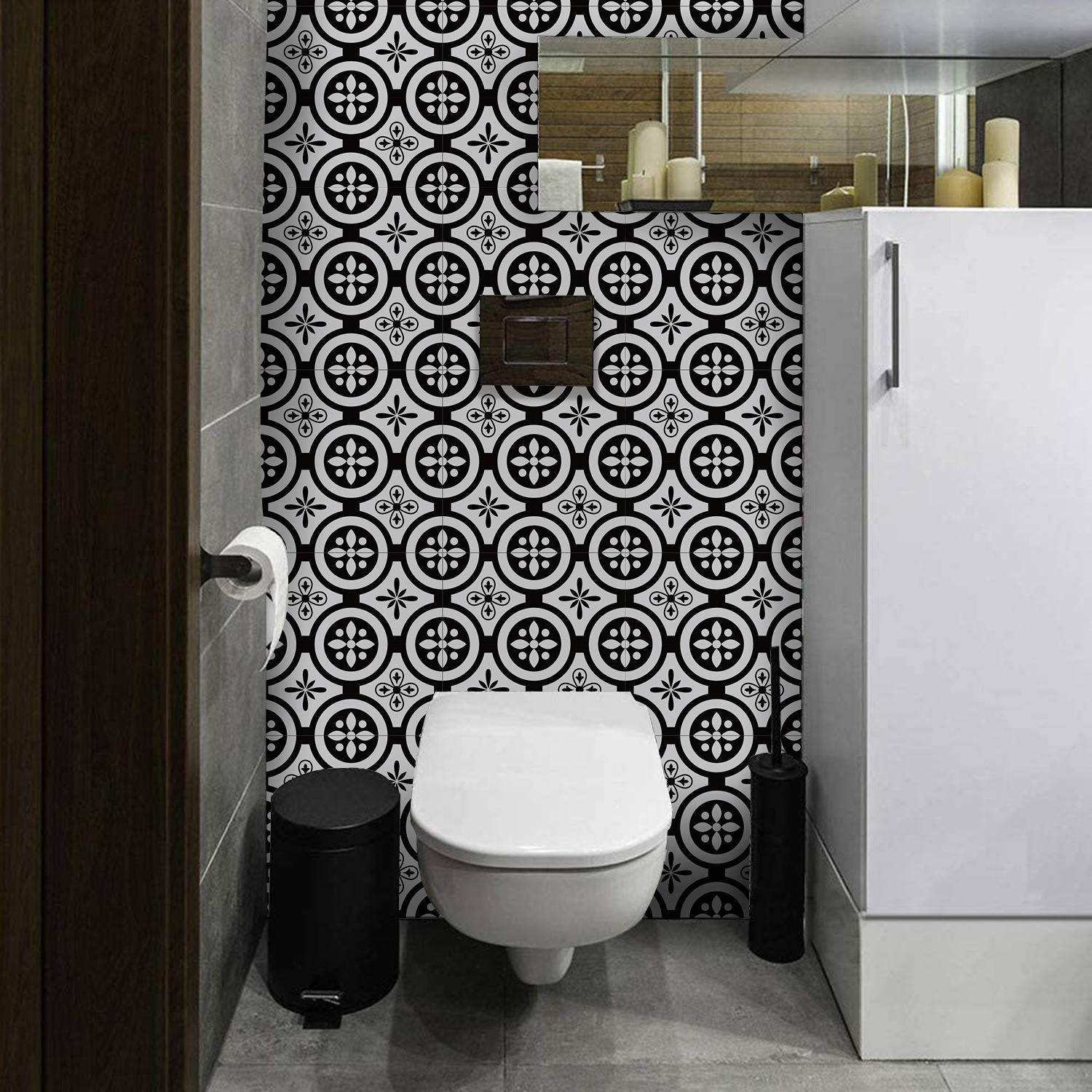 매력 세트 새로운 포르투갈어 흑백 타일 바닥 스티커 침실 욕실 바닥 장식 자체 접착 방수 유럽 바닥 스티커