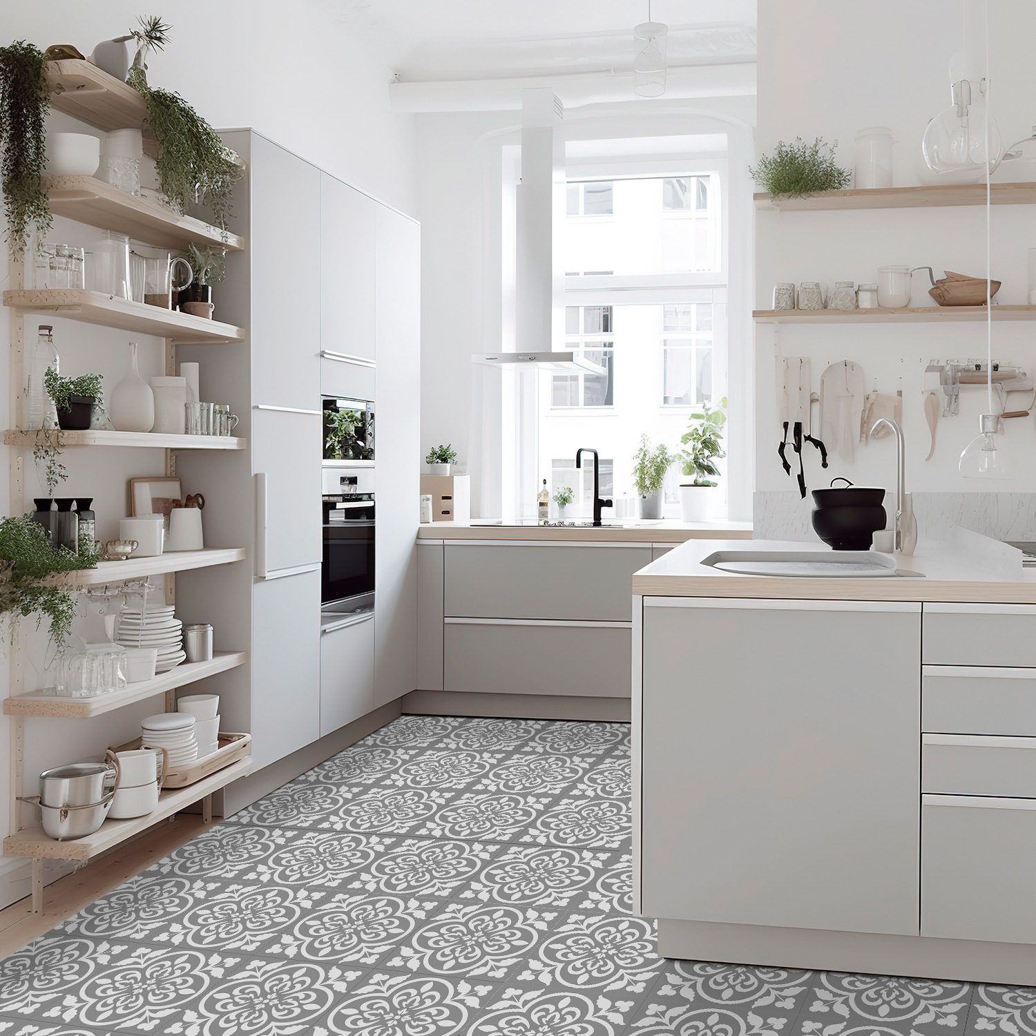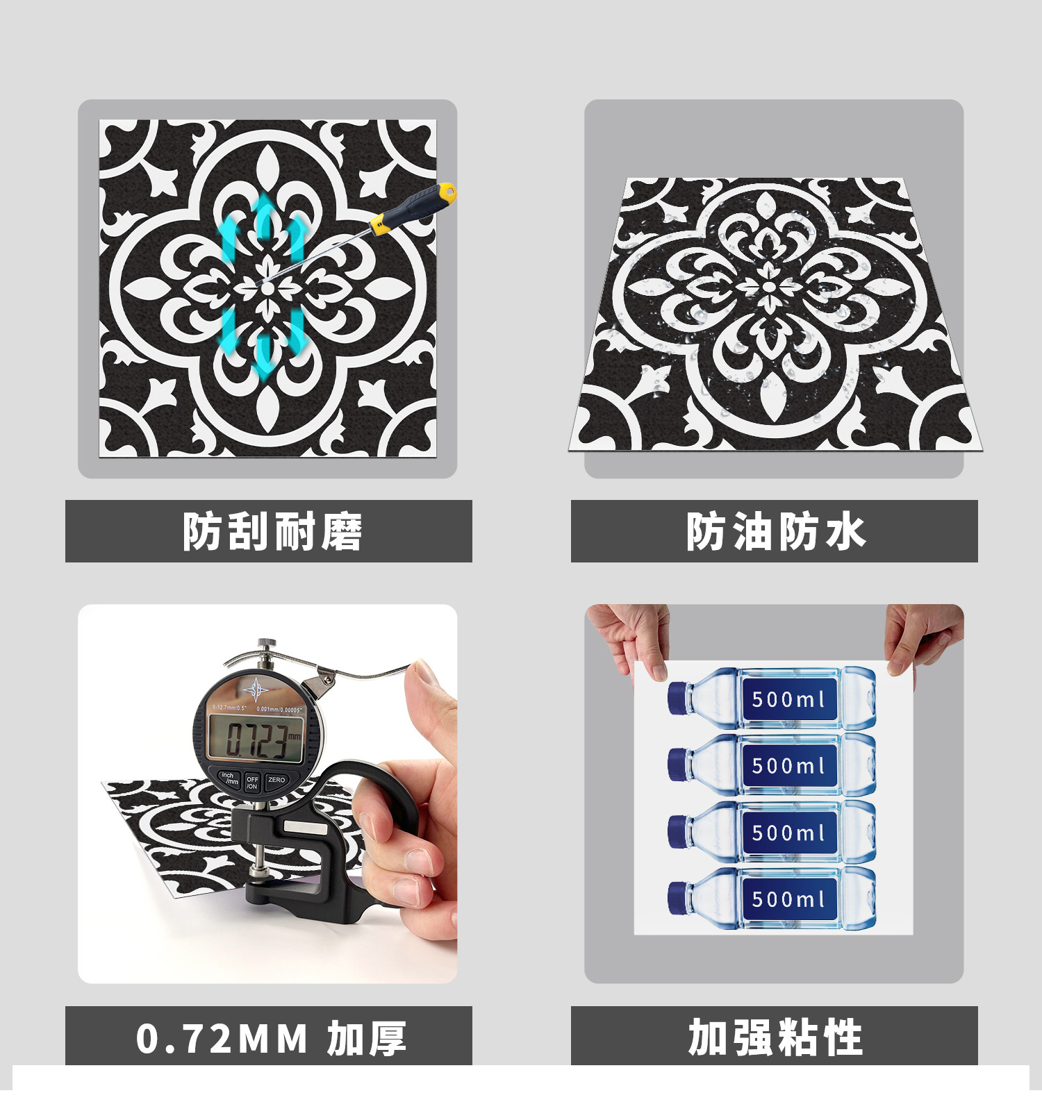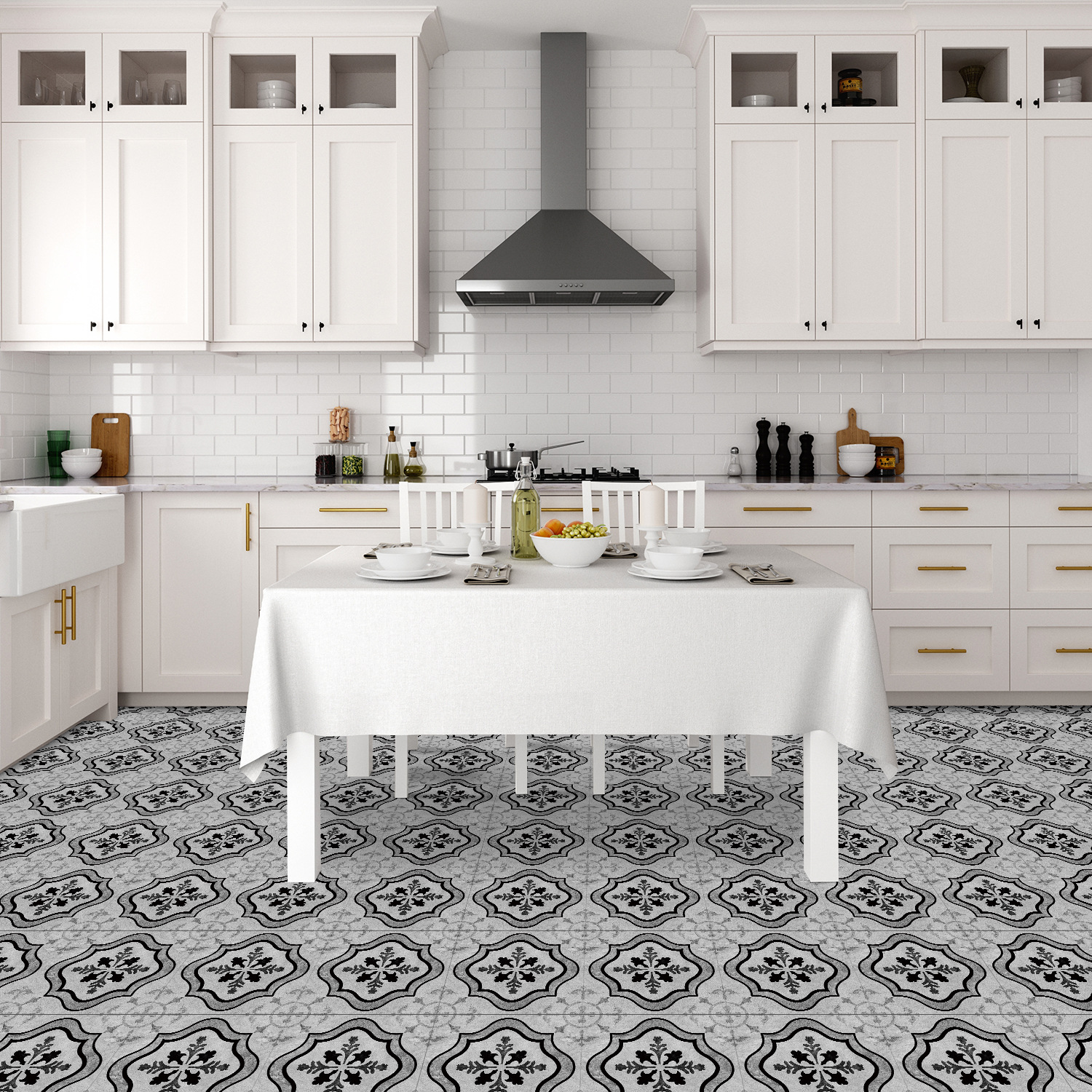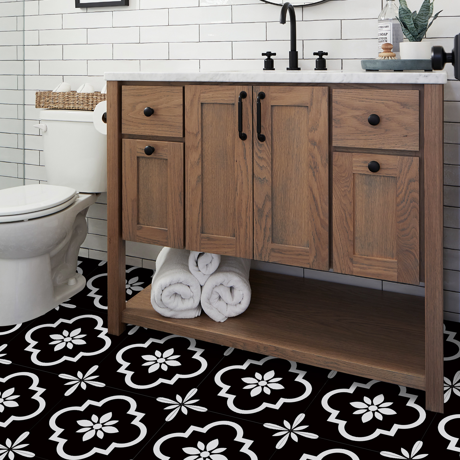 매력 세트 새로운 포르투갈어 흑백 타일 바닥 스티커 침실 욕실 바닥 장식 자체 접착 방수 유럽 바닥 스티커