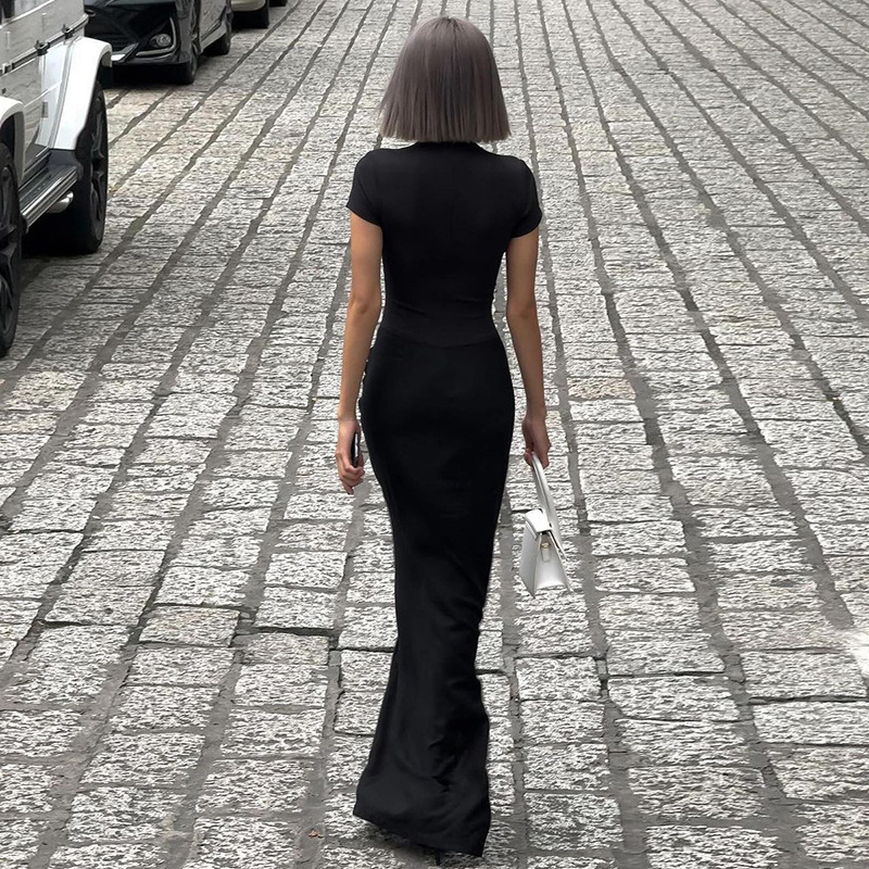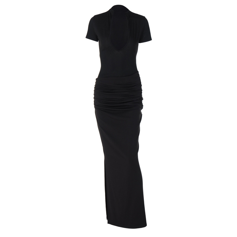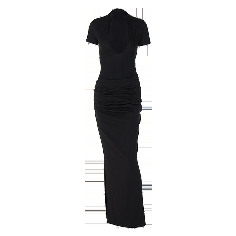 2025 새로운 여름 여성 의류 섹시한 깊은 V 짧은 소매 솔리드 컬러 핫 소녀 스타일 주름 긴 드레스 드롭 배송스토어 가기