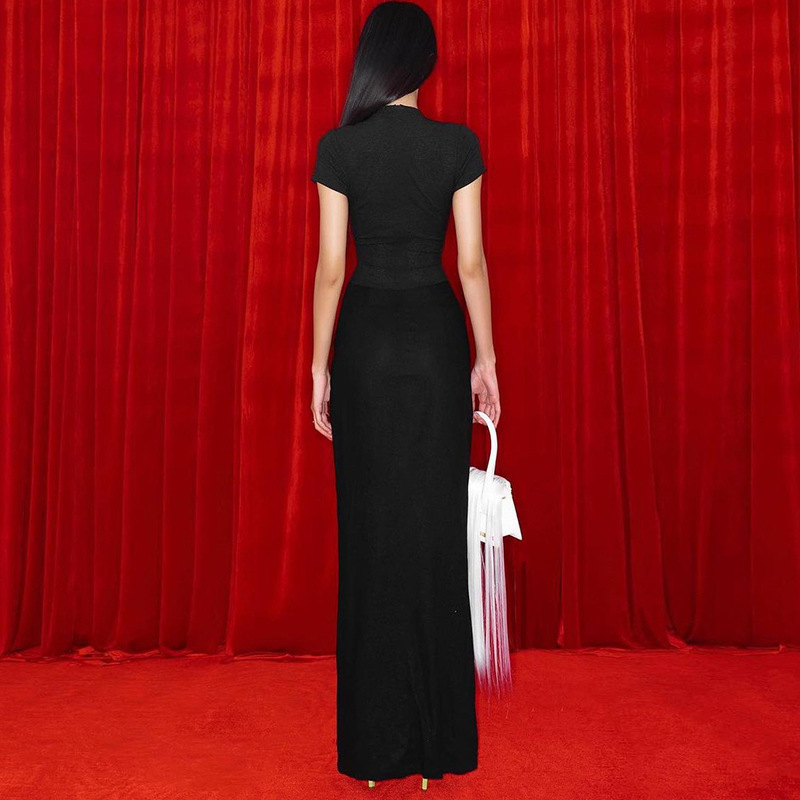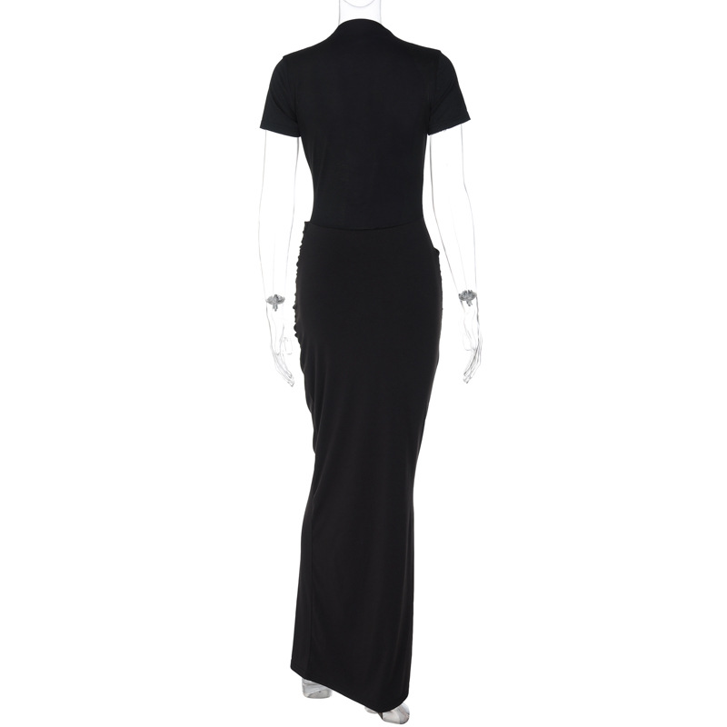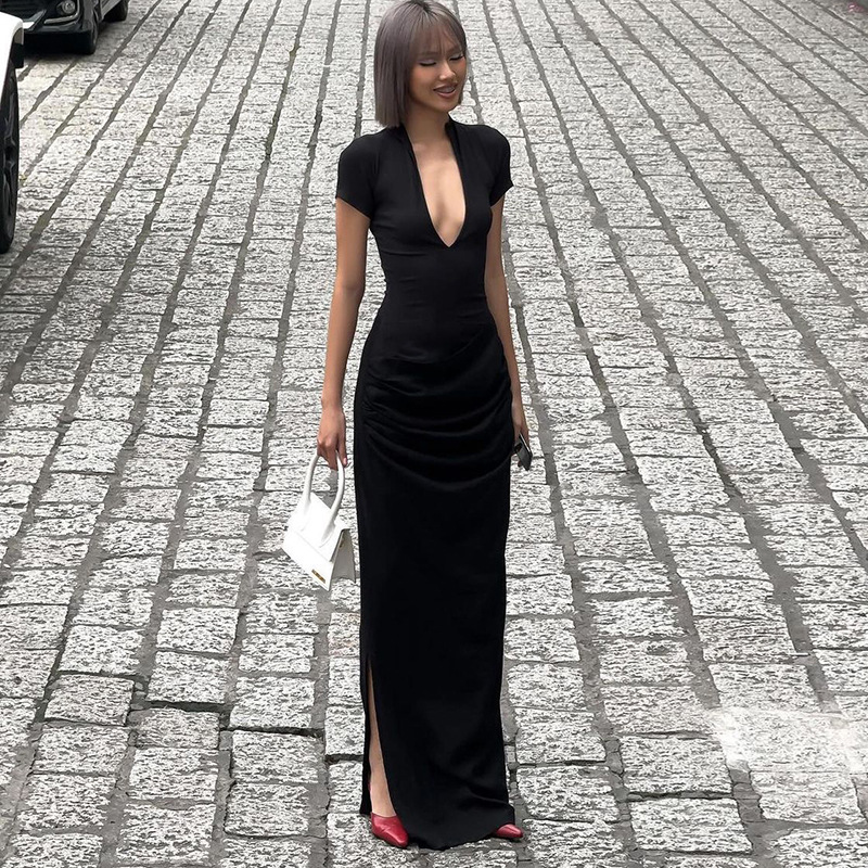 2025 새로운 여름 여성 의류 섹시한 깊은 V 짧은 소매 솔리드 컬러 핫 소녀 스타일 주름 긴 드레스 드롭 배송