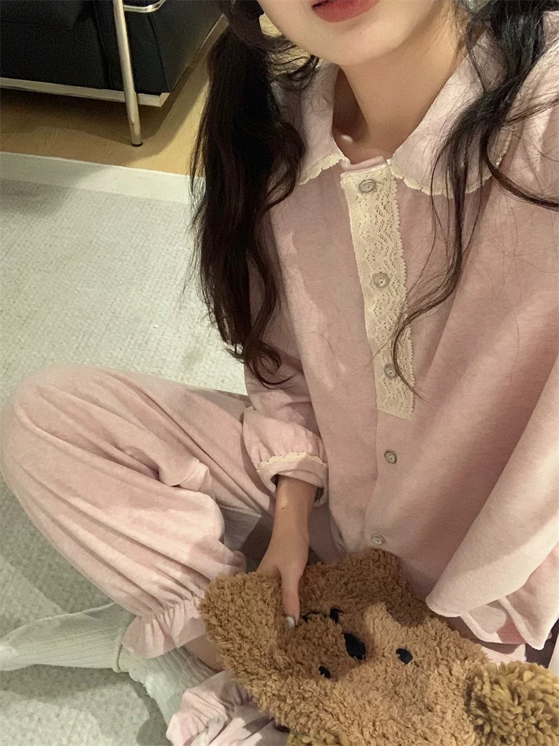 야세【미니멀리즘】신상 타올벨벳 잠옷 여성용 가을 겨울 한국 스타일 달콤하고 귀여운 레이스 장식