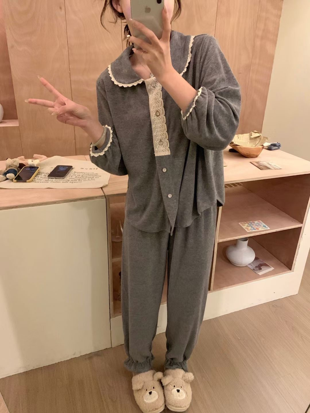 야세【미니멀리즘】신상 타올벨벳 잠옷 여성용 가을 겨울 한국 스타일 달콤하고 귀여운 레이스 장식스토어 가기