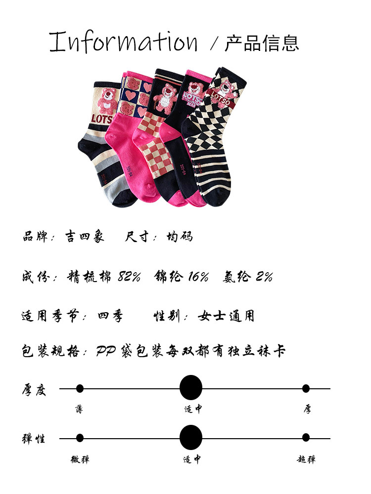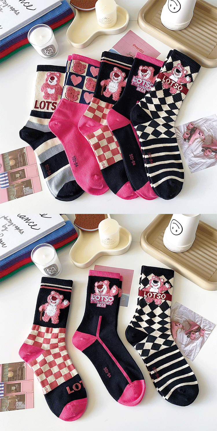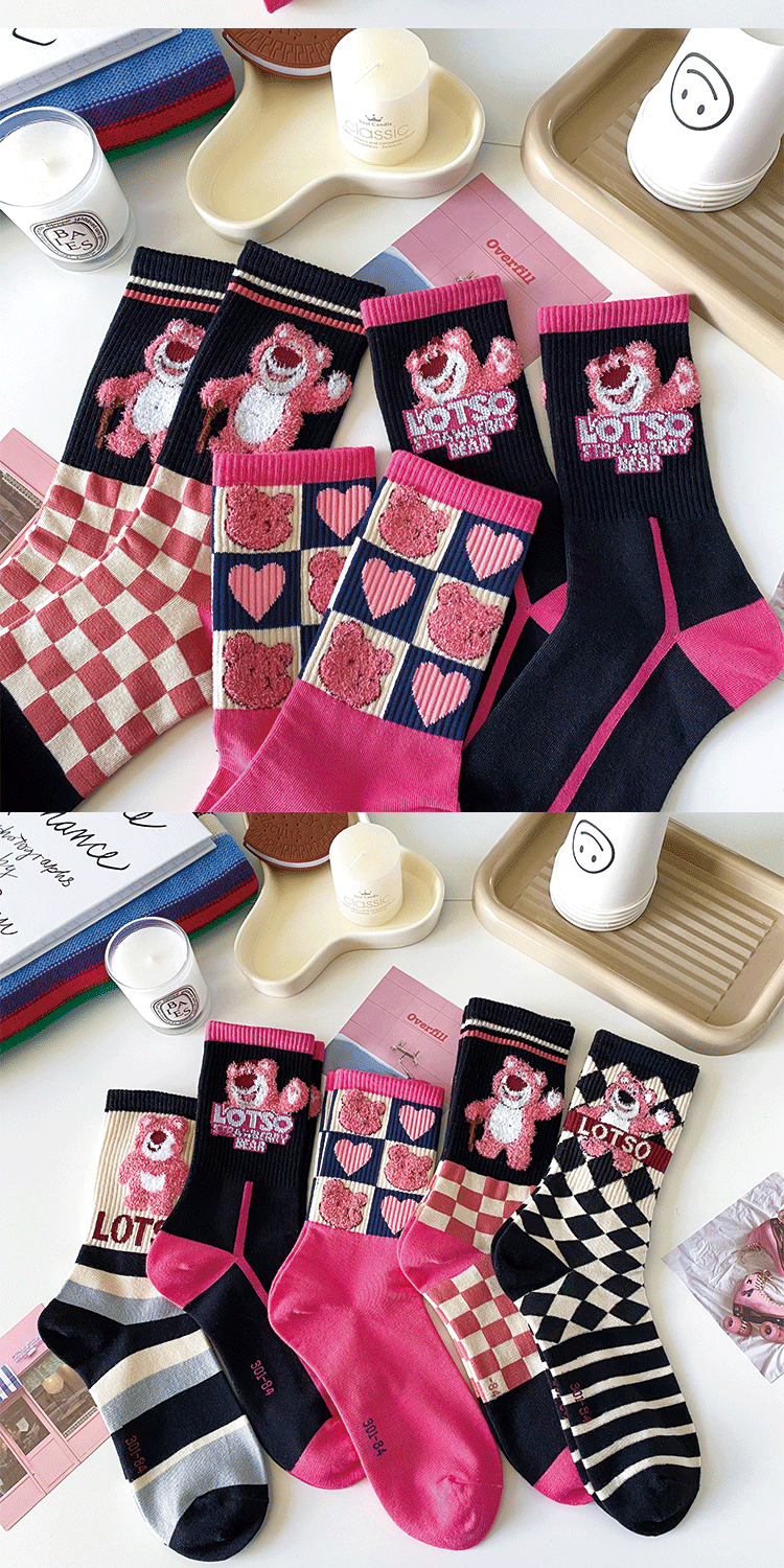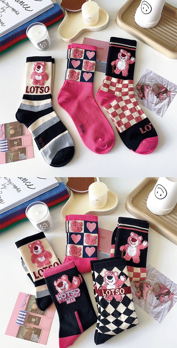 Ji Four 코끼리 양말 여성의 가을과 겨울 새로운 만화 딸기 곰 중간 길이 양말 빗질 코튼 한국식 여성 양말 학생 세련된 양말