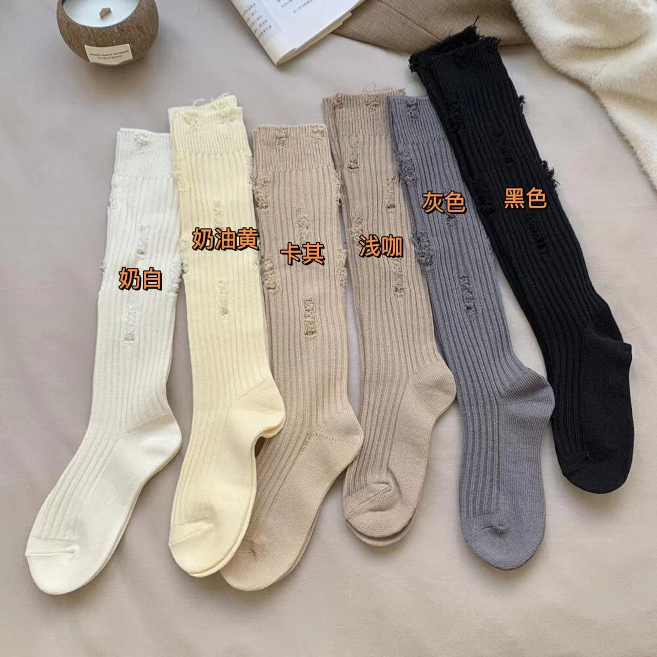 트렌디 한 거지 밀크 화이트 커프 양말 회색 중간 길이 양말 카키 쌓인 양말 여성용 찢어진 중간 길이 양말