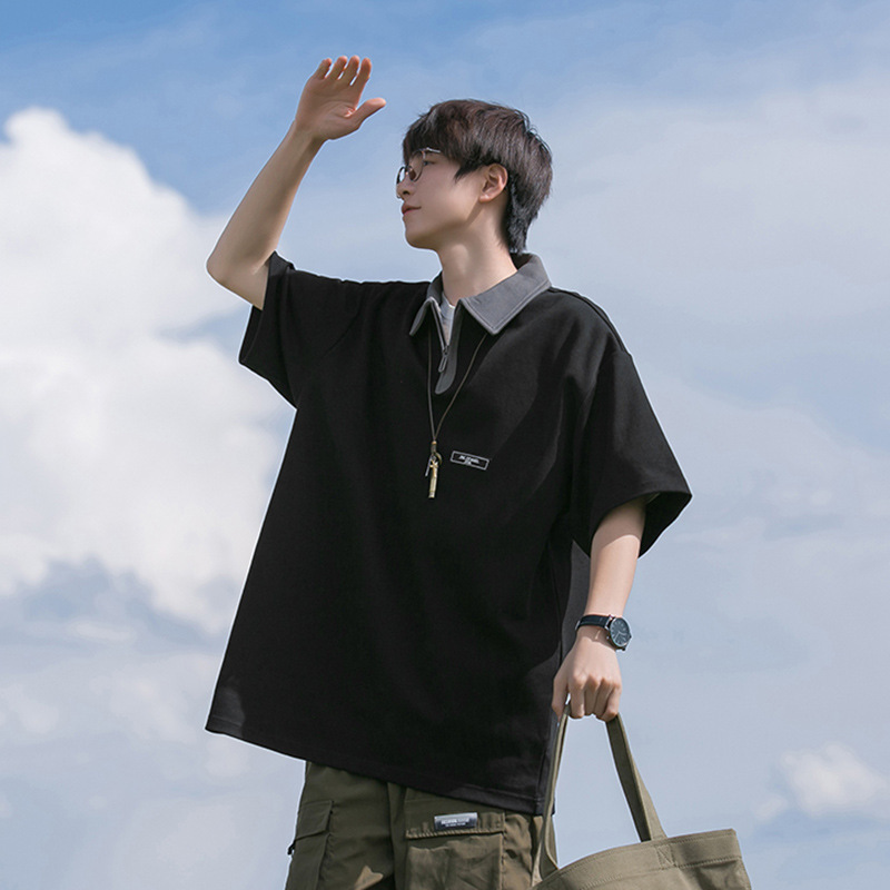 헤비 웨이트 펄 코튼 폴로 셔츠 남성용 반팔 여름 일본식 반 지퍼 라펠 티셔츠 유행 느슨한 캐주얼 반 소매 티셔츠스토어 가기