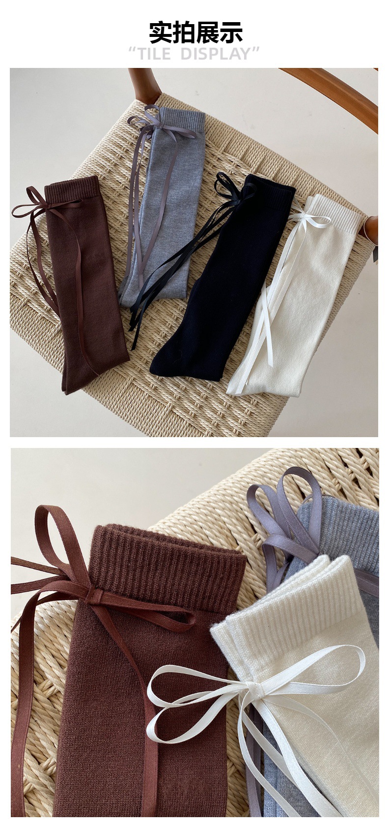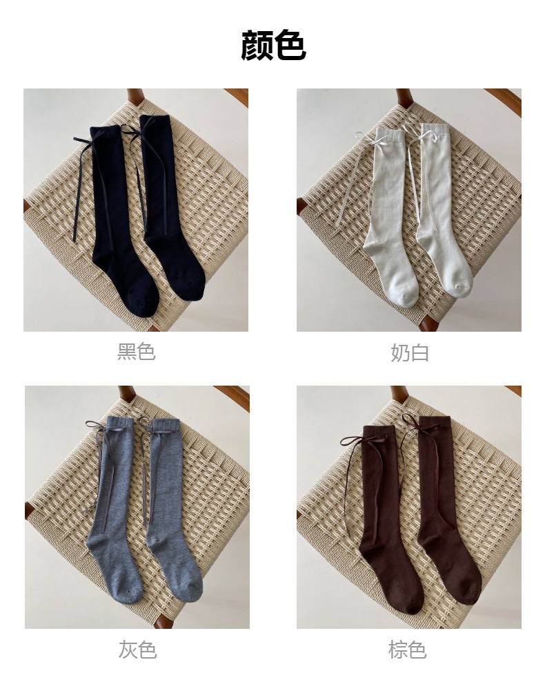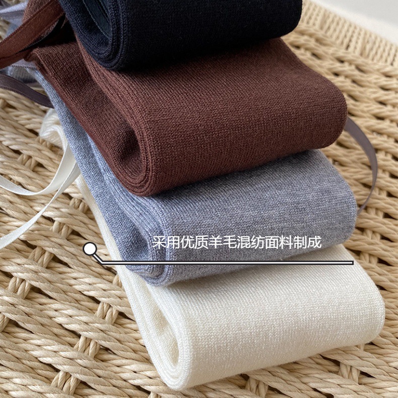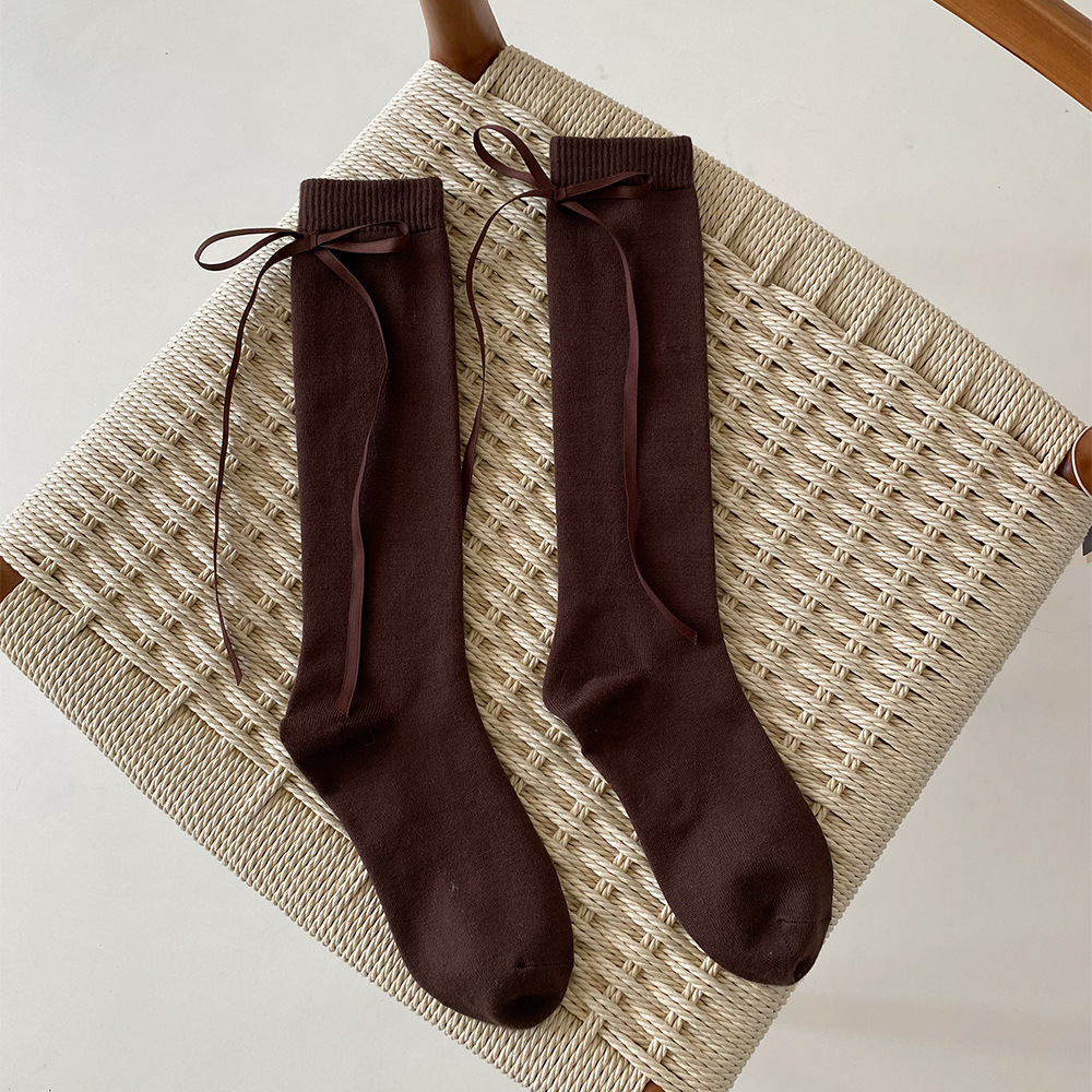가을과 겨울 단색 양모 양말 어린이 한국 스타일 보우 커프 양말 다크 브라운 흰색 달콤한 리본 무릎 높이 스타킹
