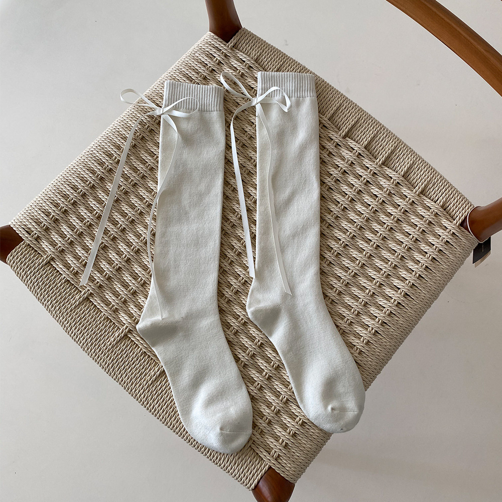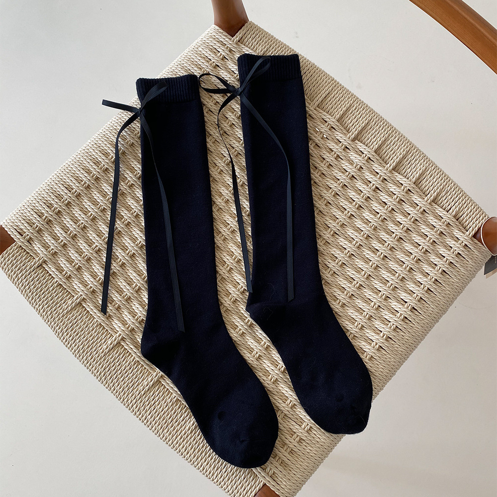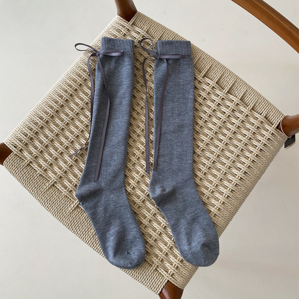 가을과 겨울 단색 양모 양말 어린이 한국 스타일 보우 커프 양말 다크 브라운 흰색 달콤한 리본 무릎 높이 스타킹