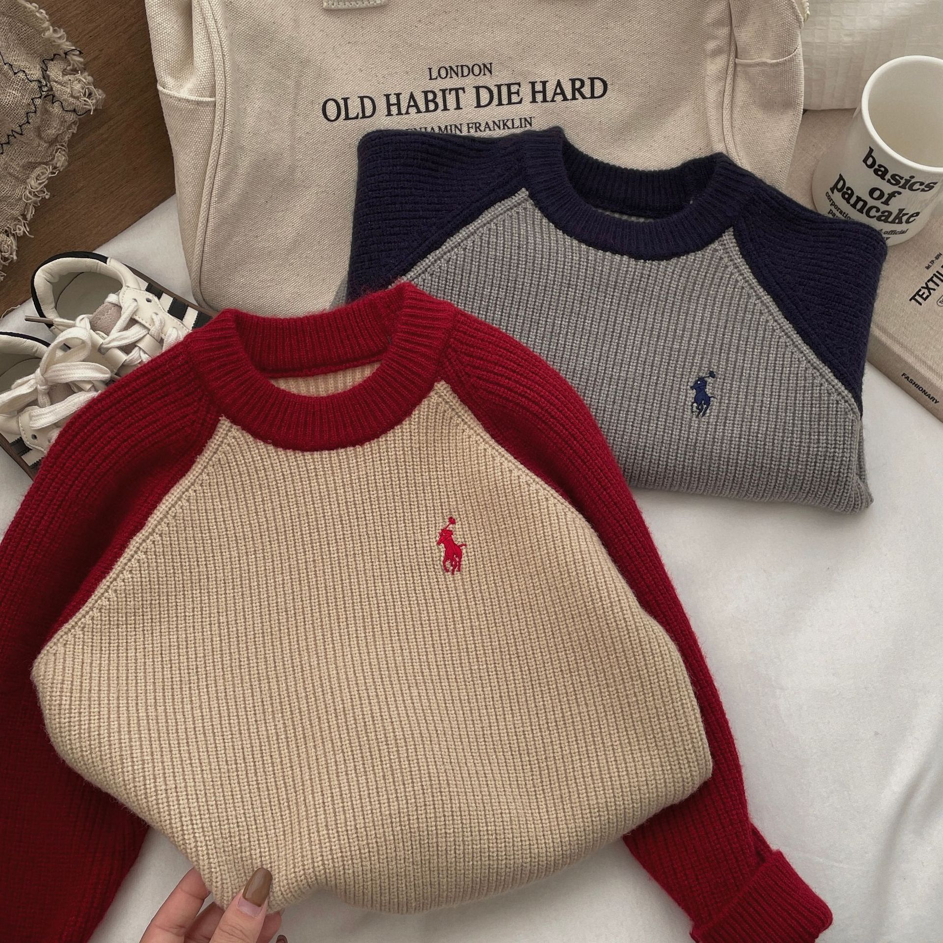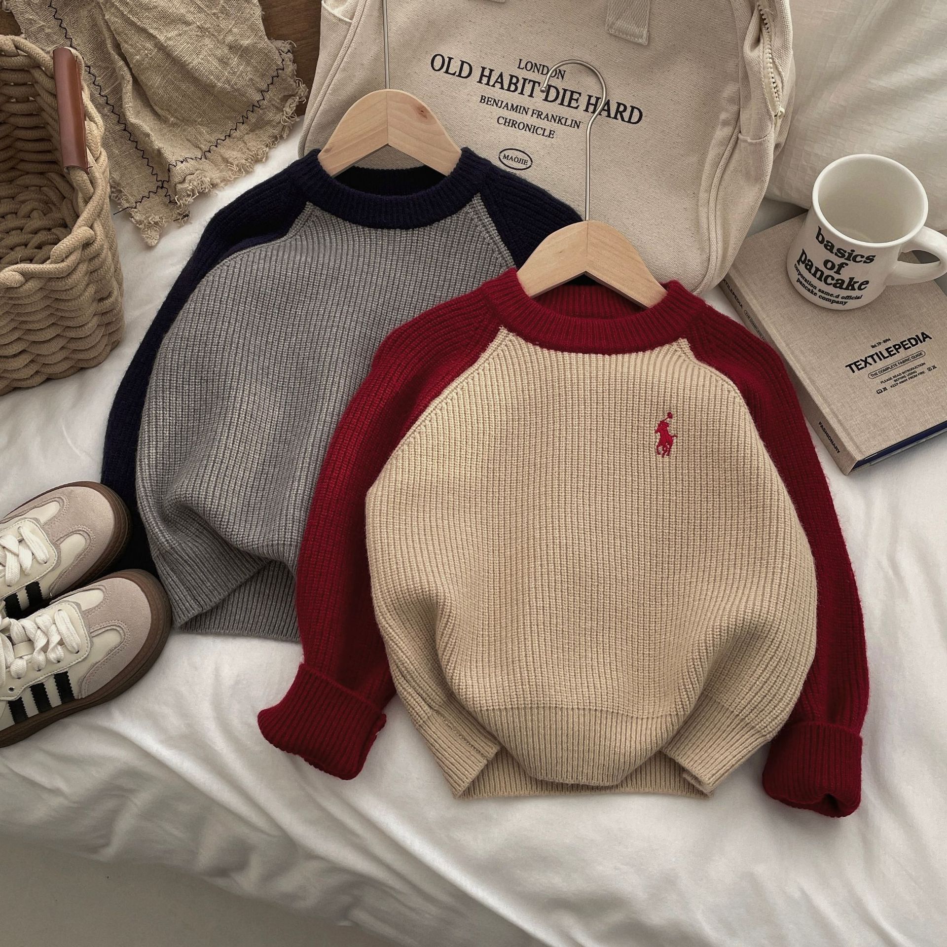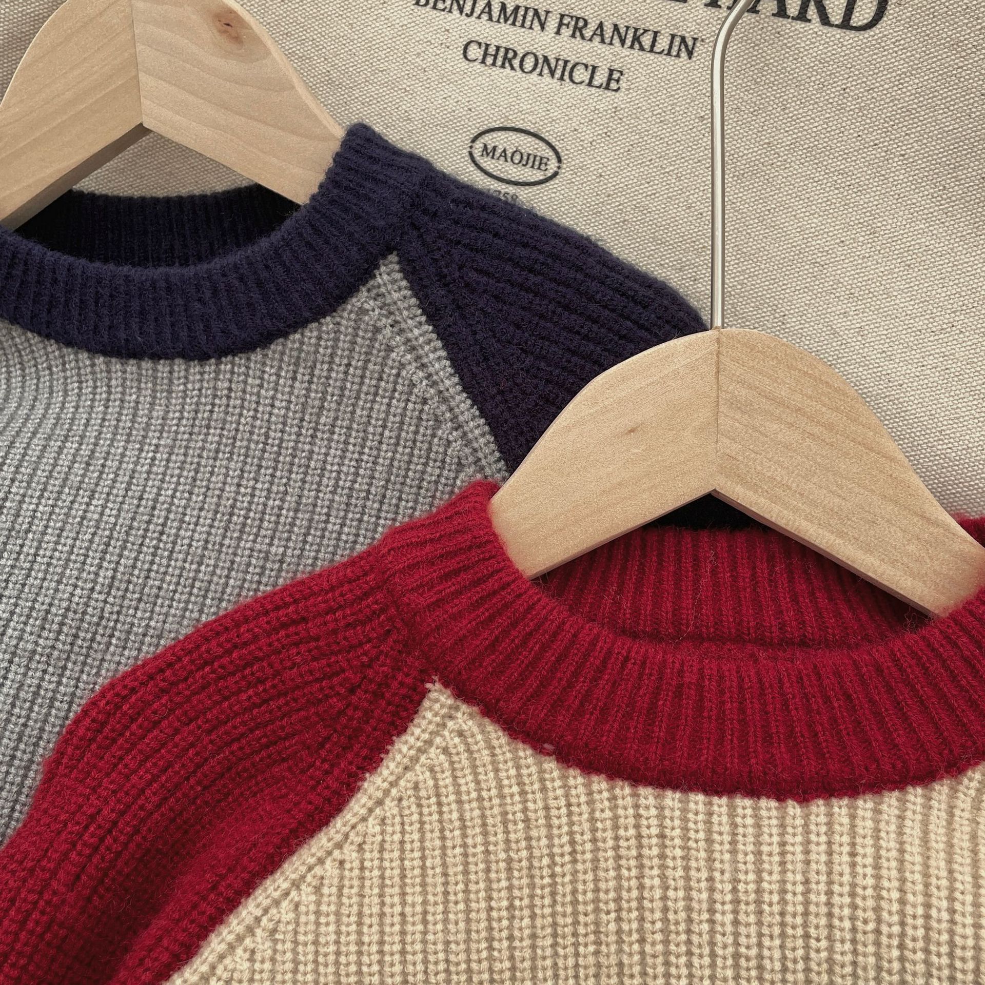 2025 새로운 가을, 겨울 어린이 스웨터 소년과 소녀 컬러 블록 라운드 넥 스웨터 한국 스타일 두꺼운 풀오버 스웨터 유행스토어 가기