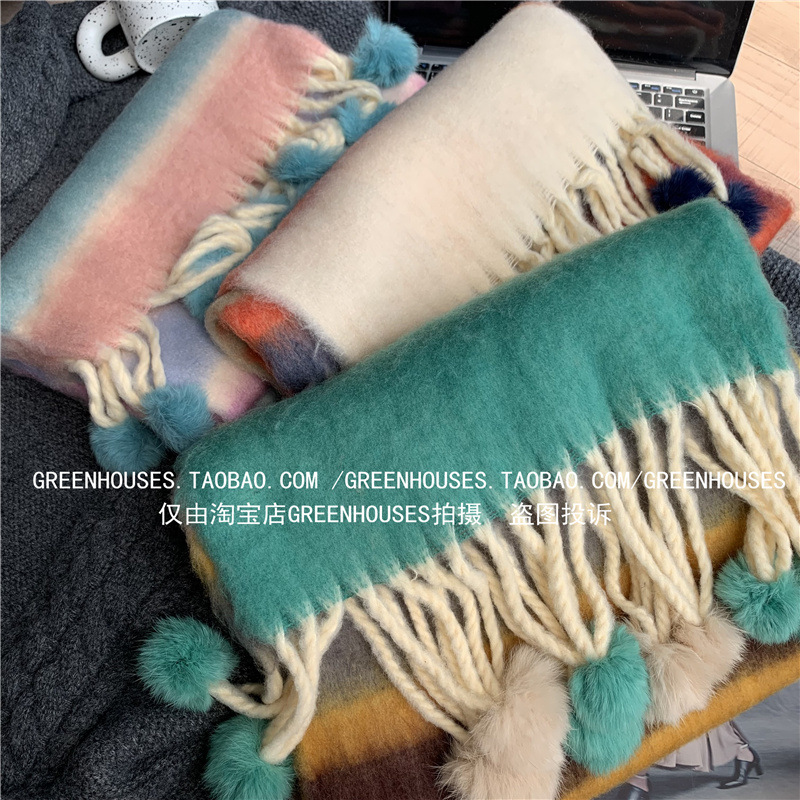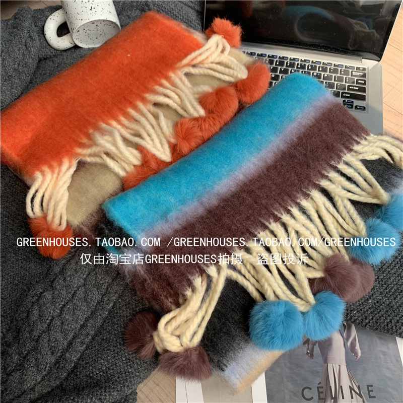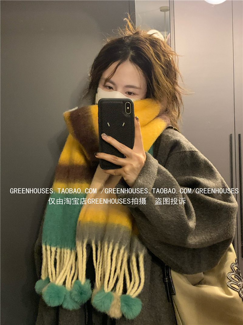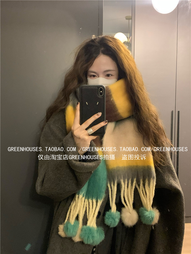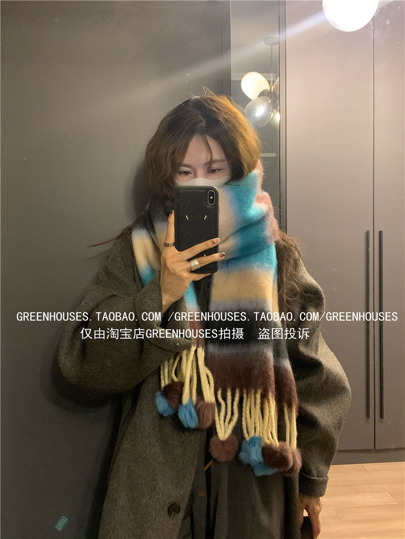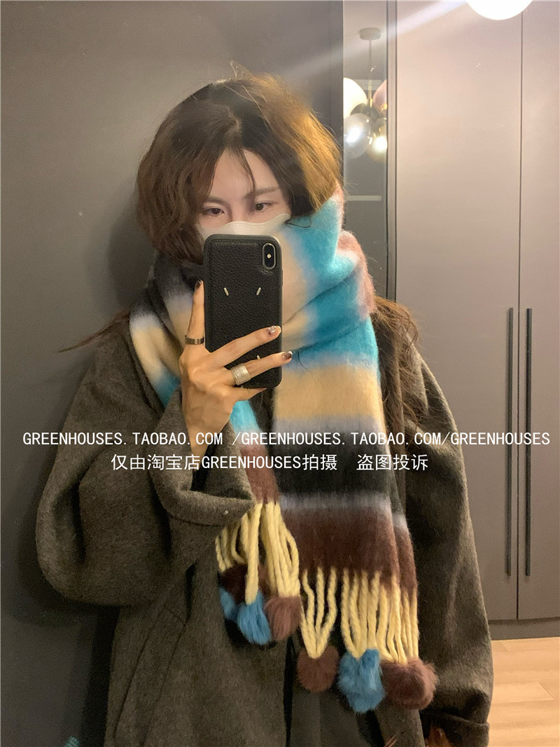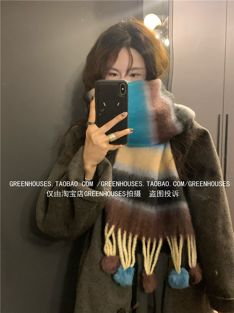 도파민 컬러 스트라이프 모헤어 스카프 여성의 가을과 겨울 두꺼운 따뜻한 토끼 헤어 볼 스카프 긴 숄스토어 가기