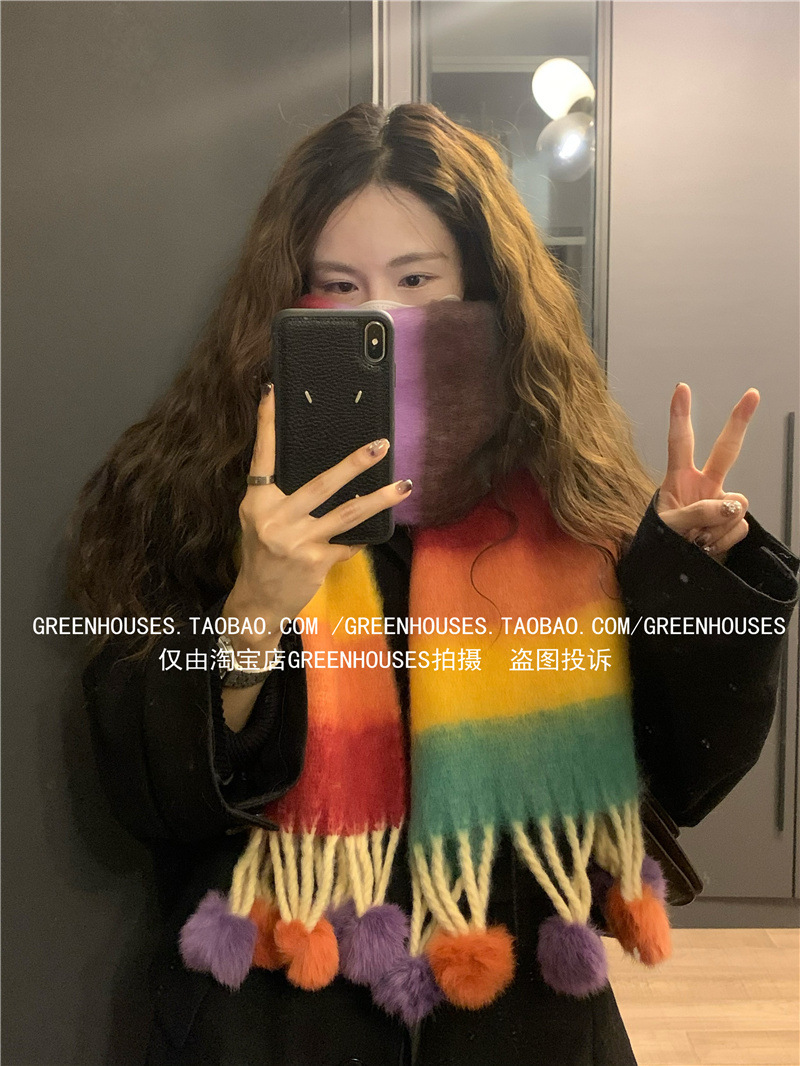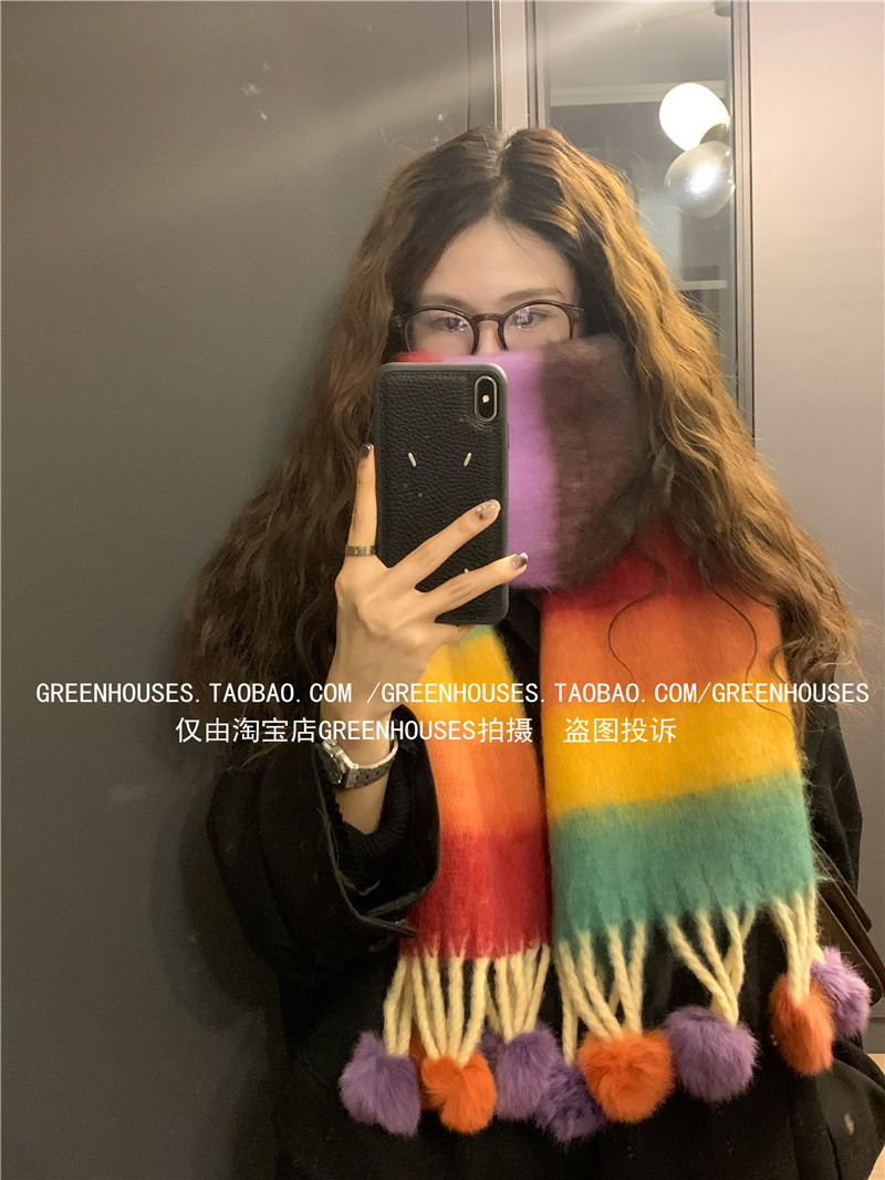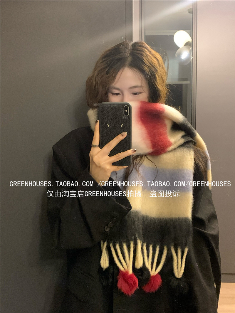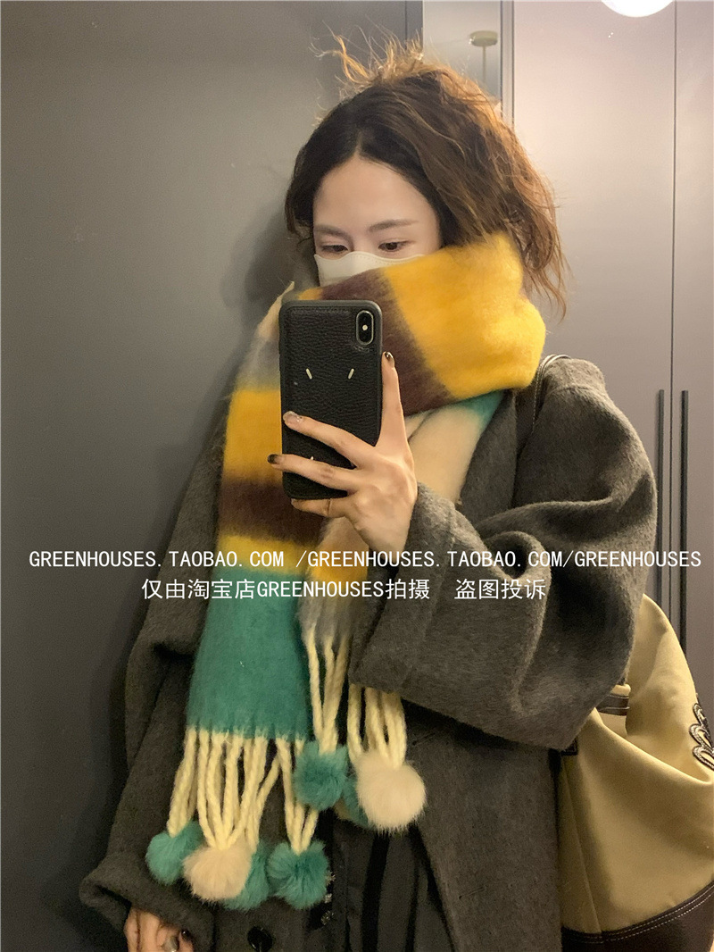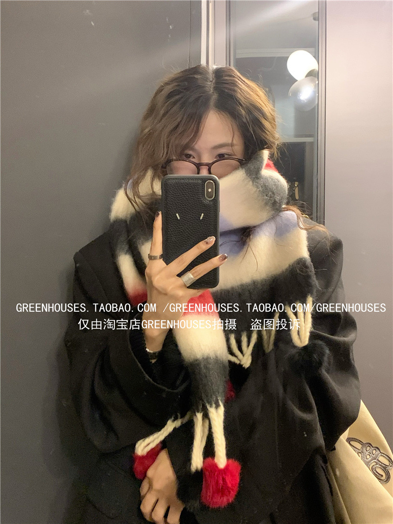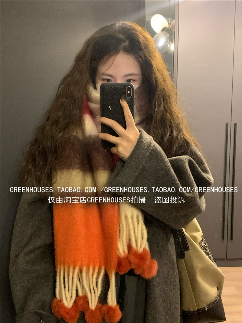 도파민 컬러 스트라이프 모헤어 스카프 여성의 가을과 겨울 두꺼운 따뜻한 토끼 헤어 볼 스카프 긴 숄스토어 가기