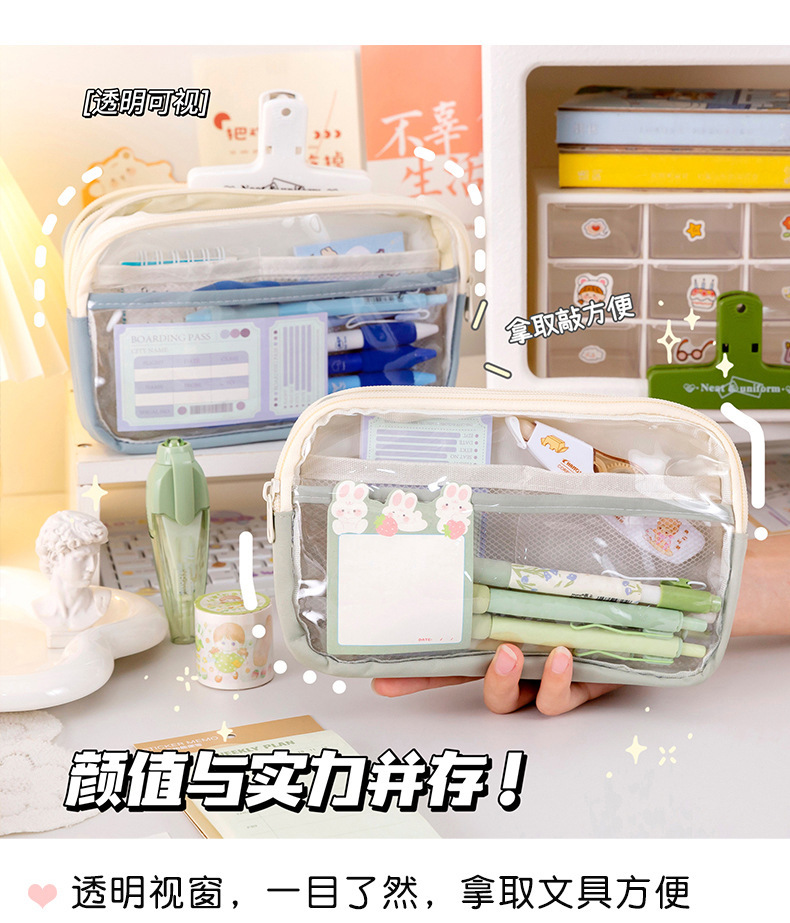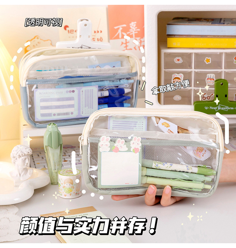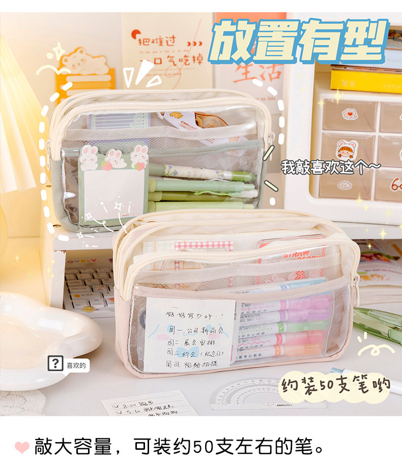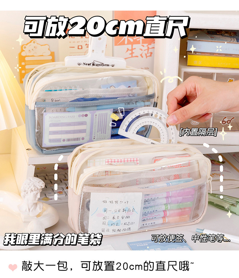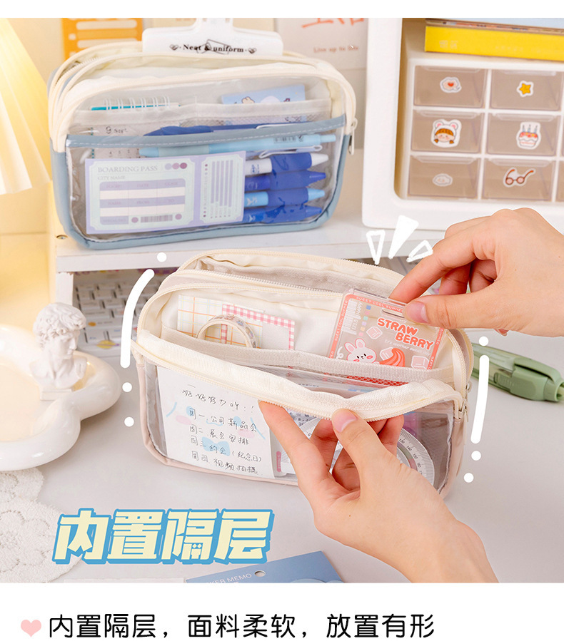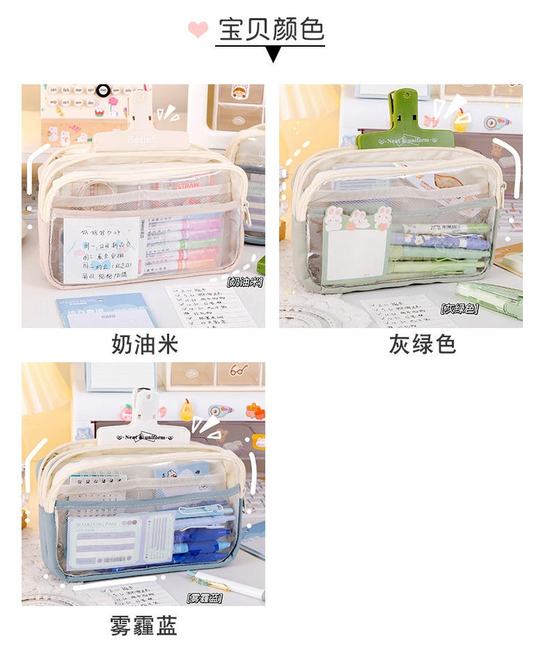 트렌디한 일본식 심플 문구 가방 3단 대용량 투명 필통 도매 여학생 초등학생 연필꽂이 수납