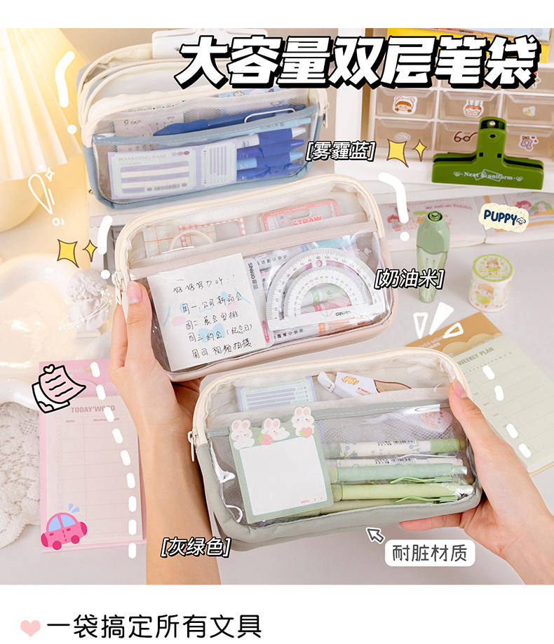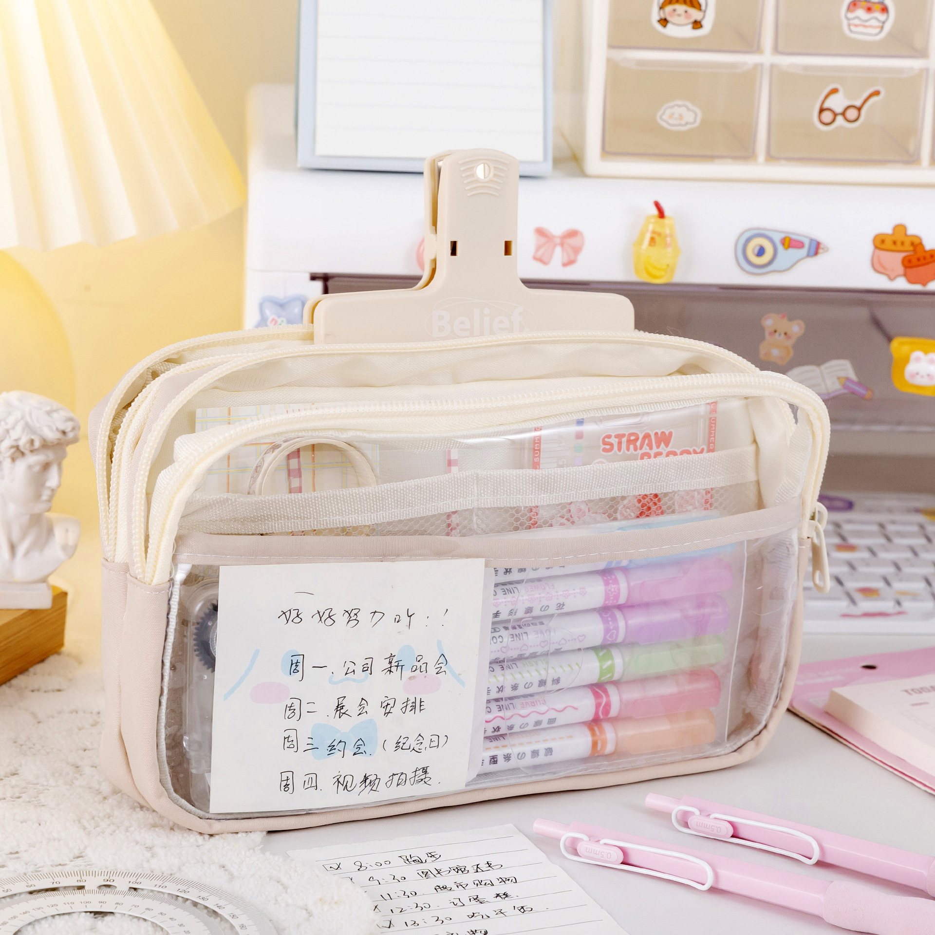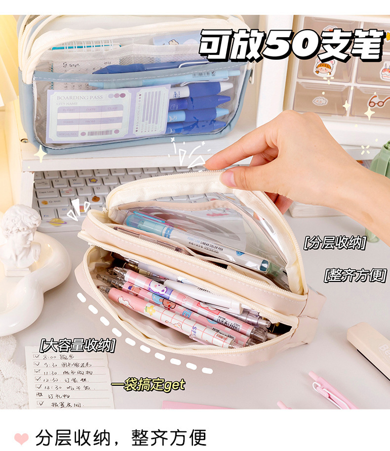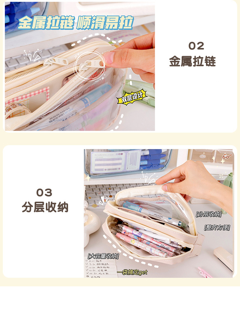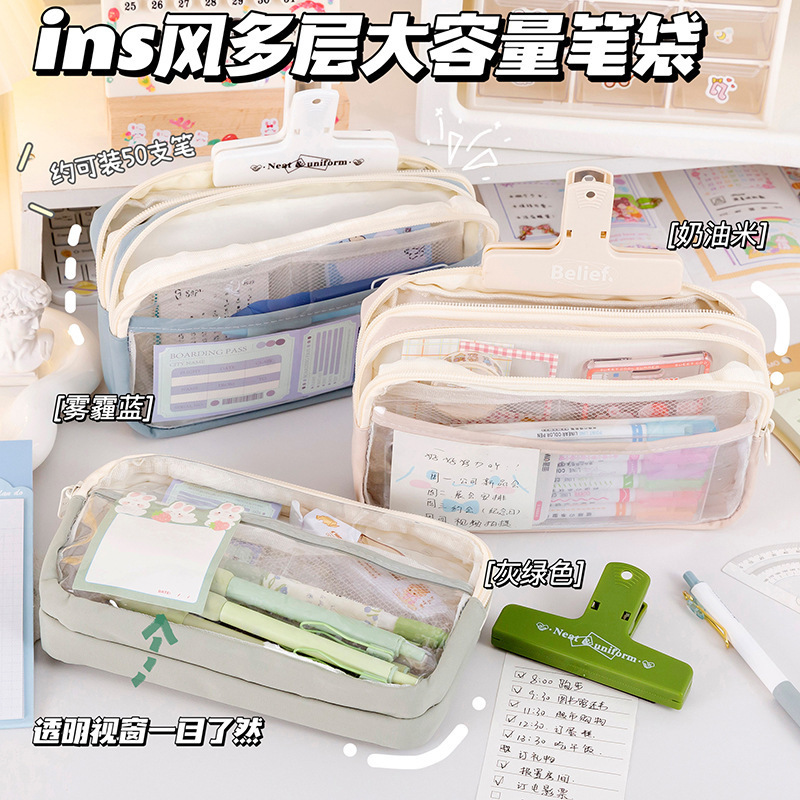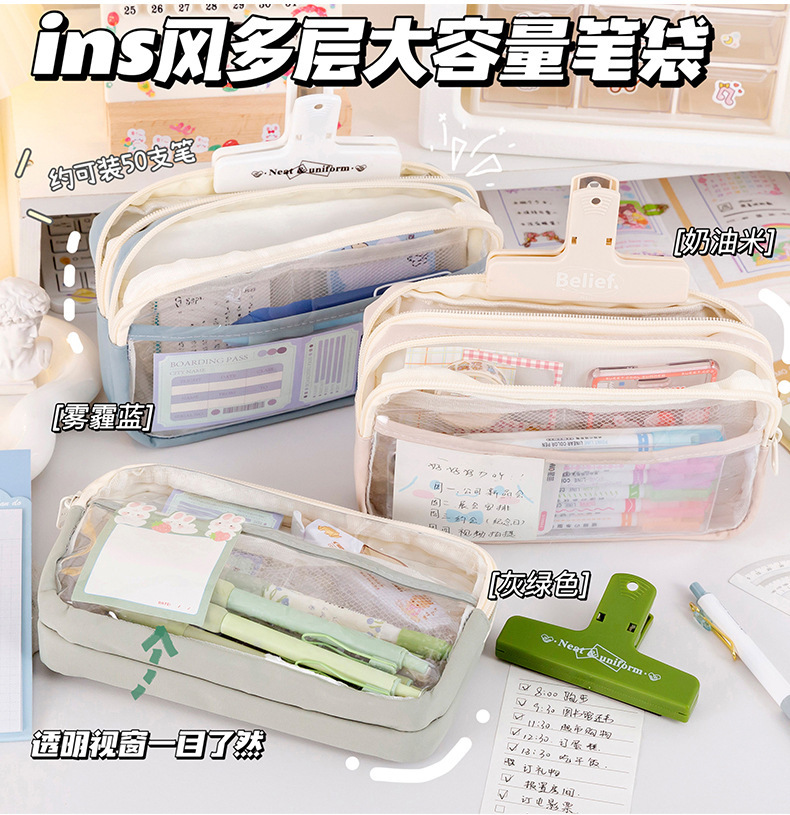 트렌디한 일본식 심플 문구 가방 3단 대용량 투명 필통 도매 여학생 초등학생 연필꽂이 수납