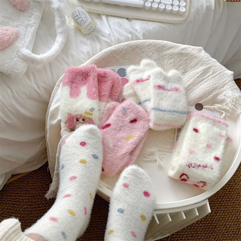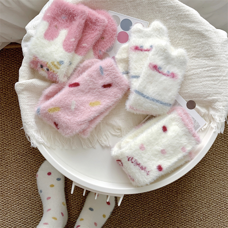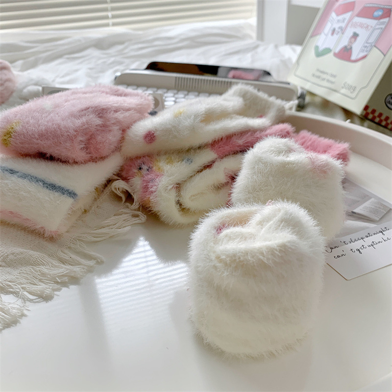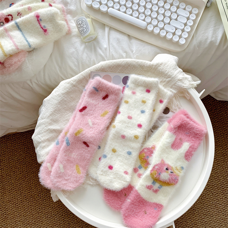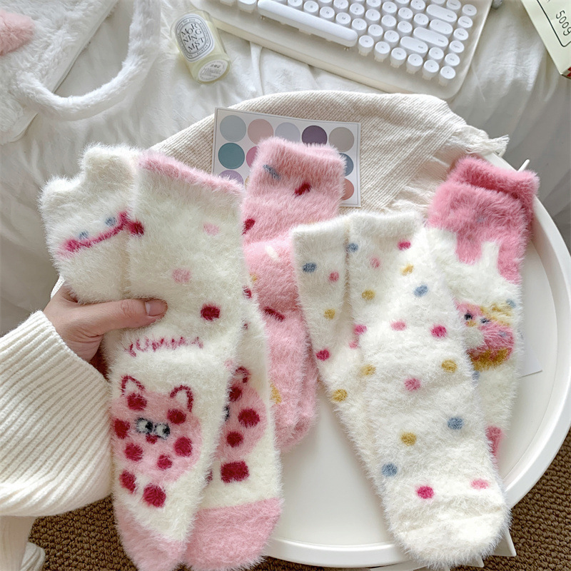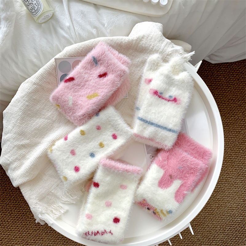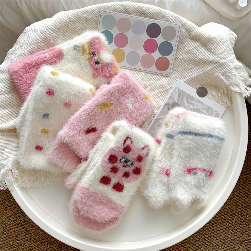 핑크색 귀여운 밍크 양털 양말 여성용 겨울 중간 길이 양말 털이 많은 수면 양말 홈 플로어 양말 두꺼운 캐주얼 양말