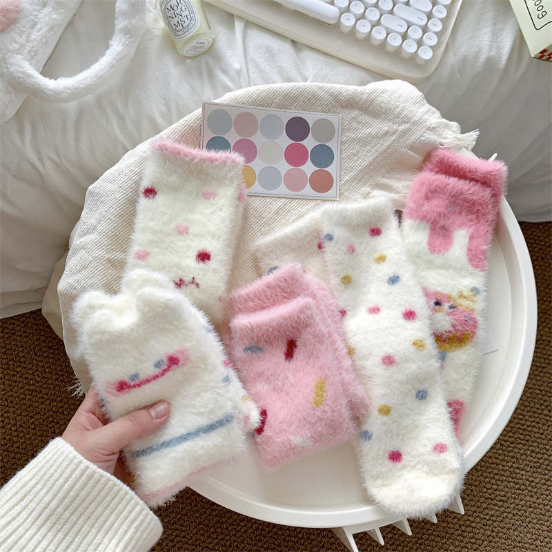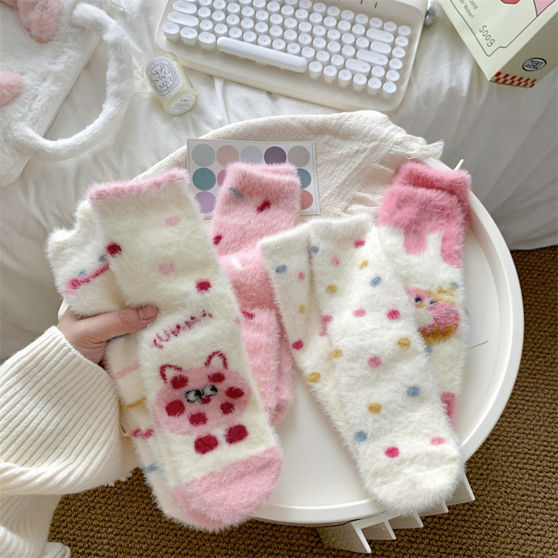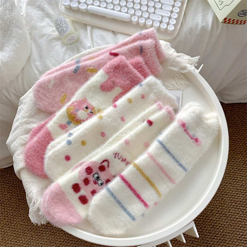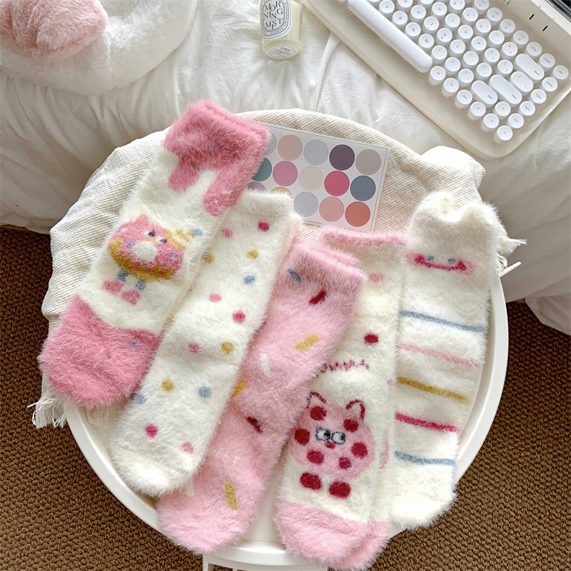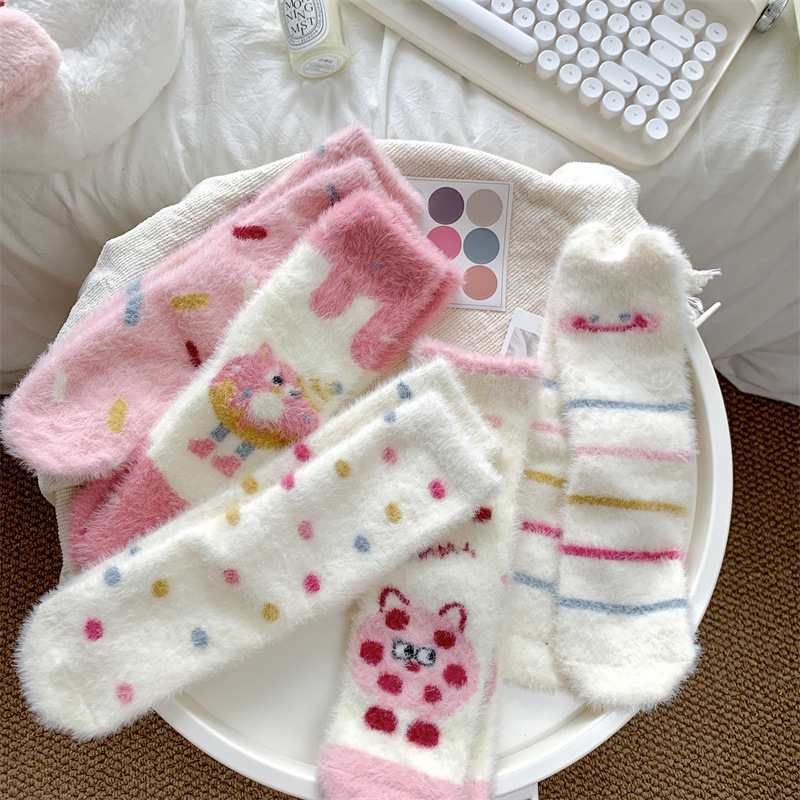핑크색 귀여운 밍크 양털 양말 여성용 겨울 중간 길이 양말 털이 많은 수면 양말 홈 플로어 양말 두꺼운 캐주얼 양말스토어 가기