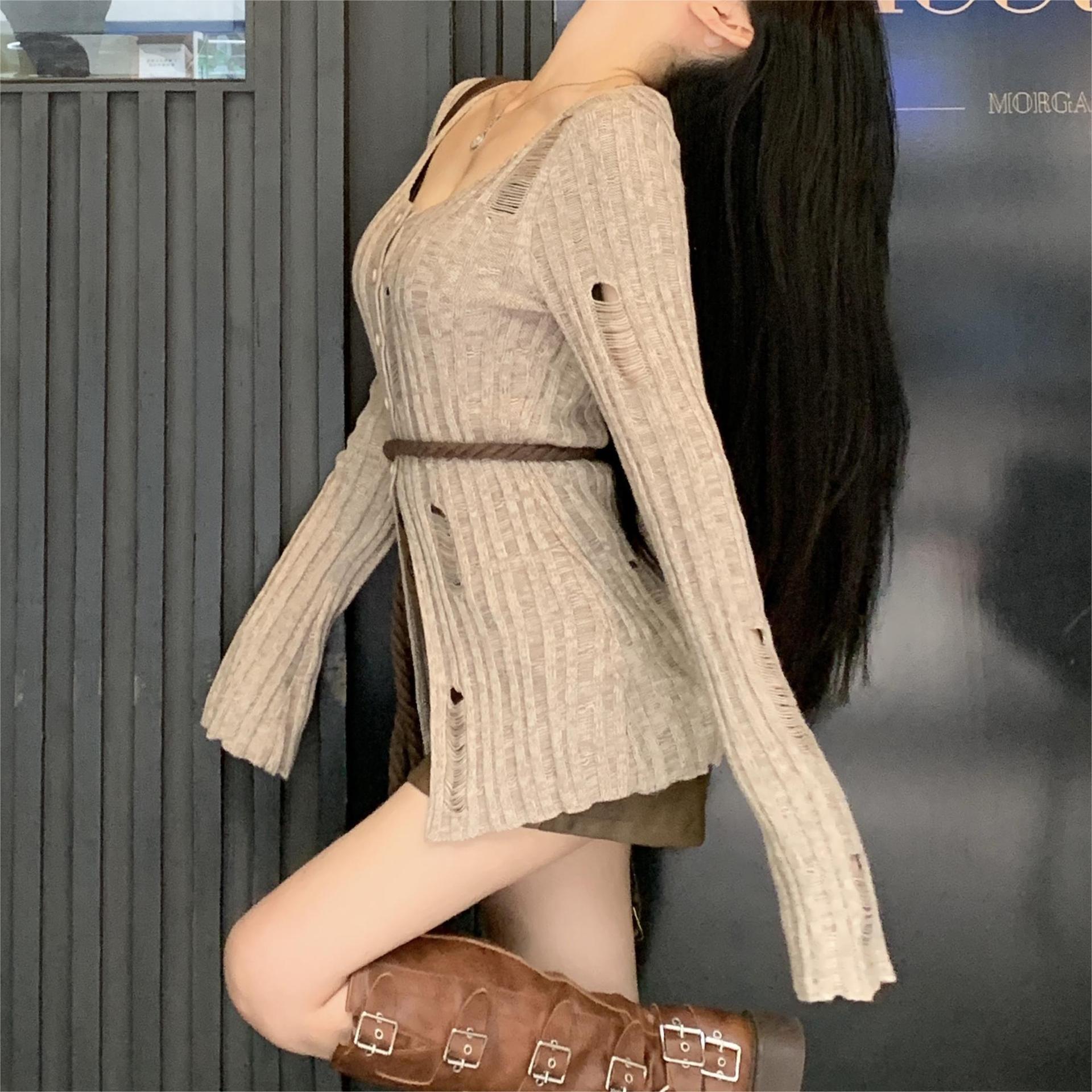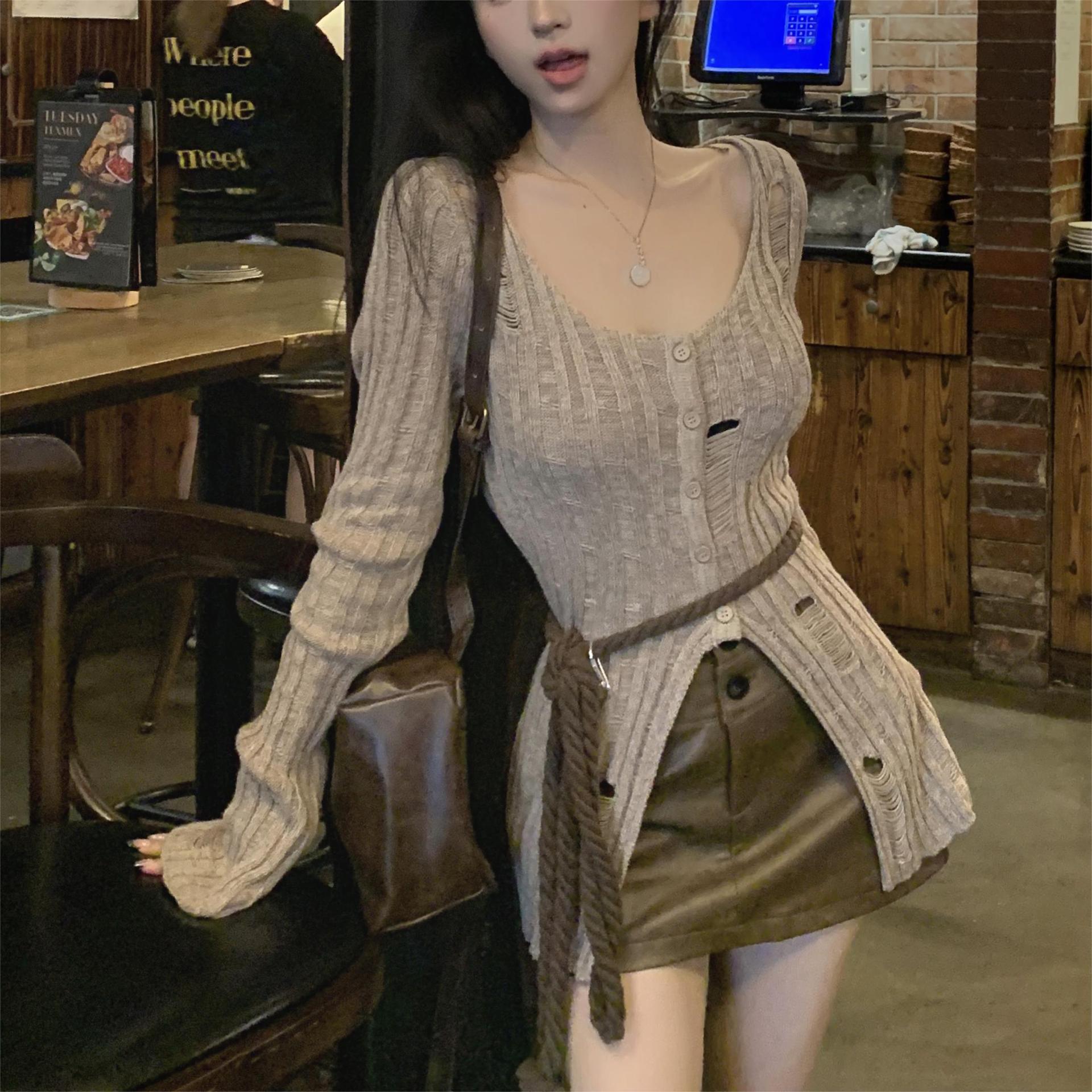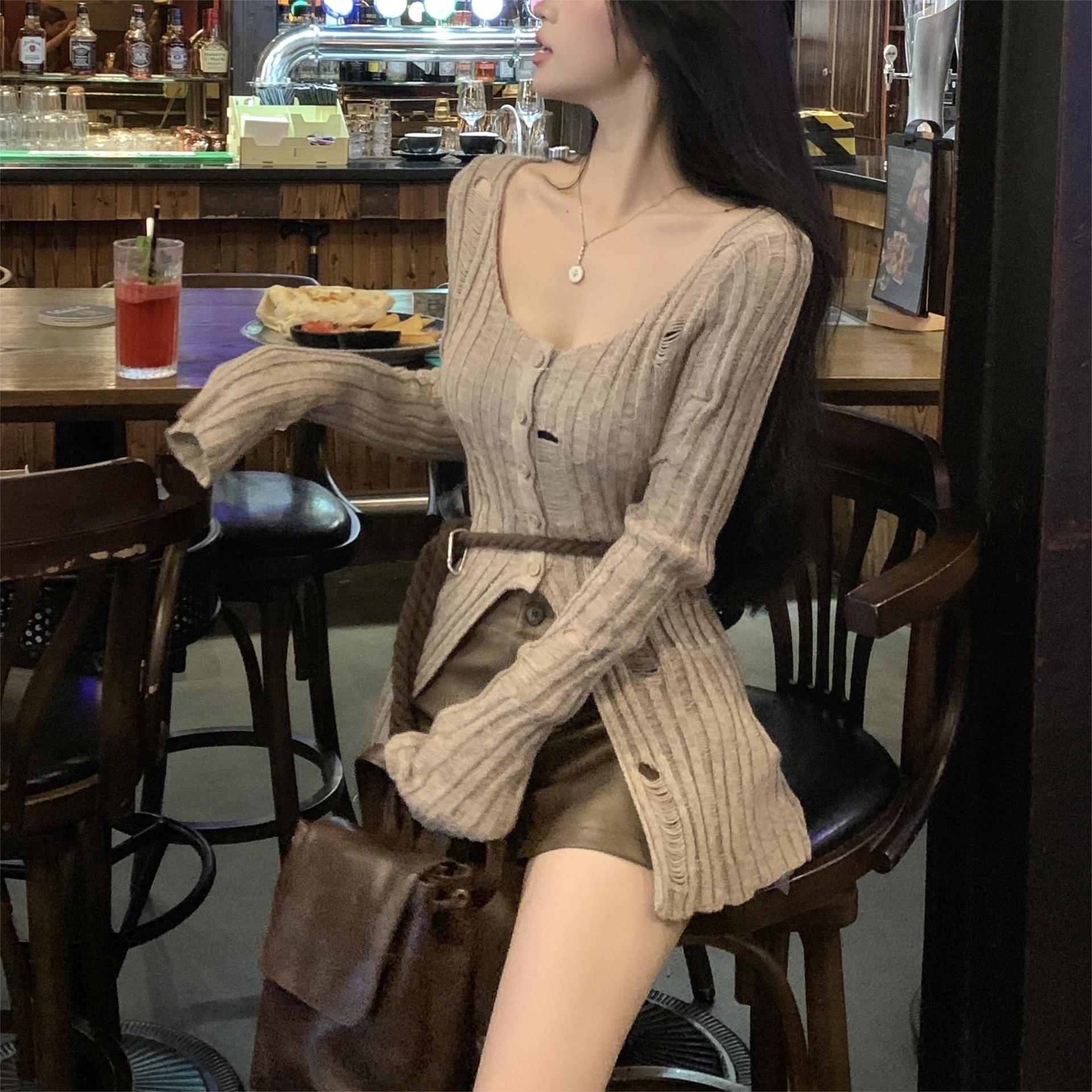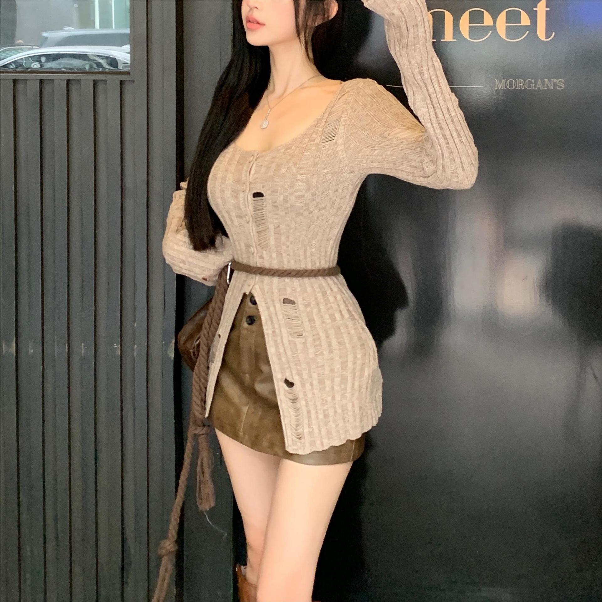 2024 년 가을 새로운 Da Lang 니트 스웨터 할로우 U-넥 롱 슬리브 니트 카디건 핫 소녀 순수한 욕망 여성 탑