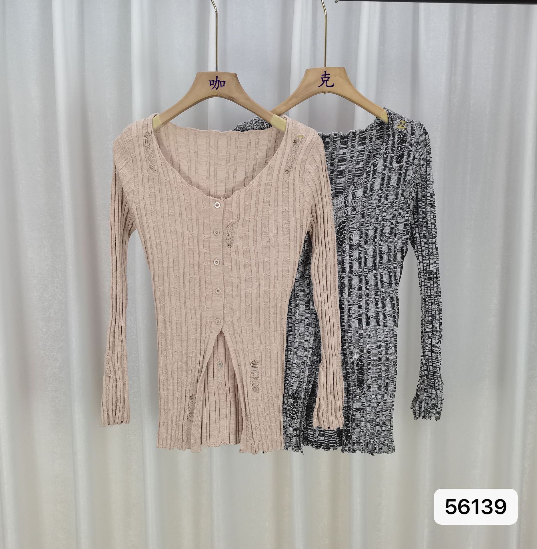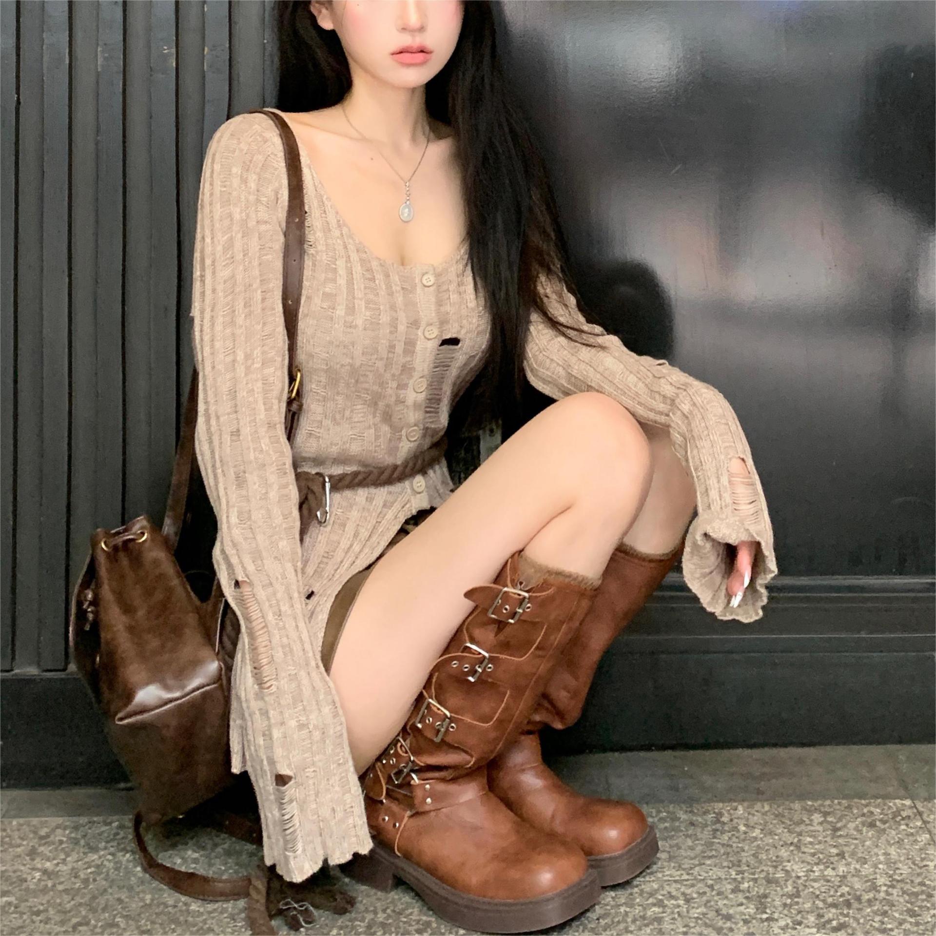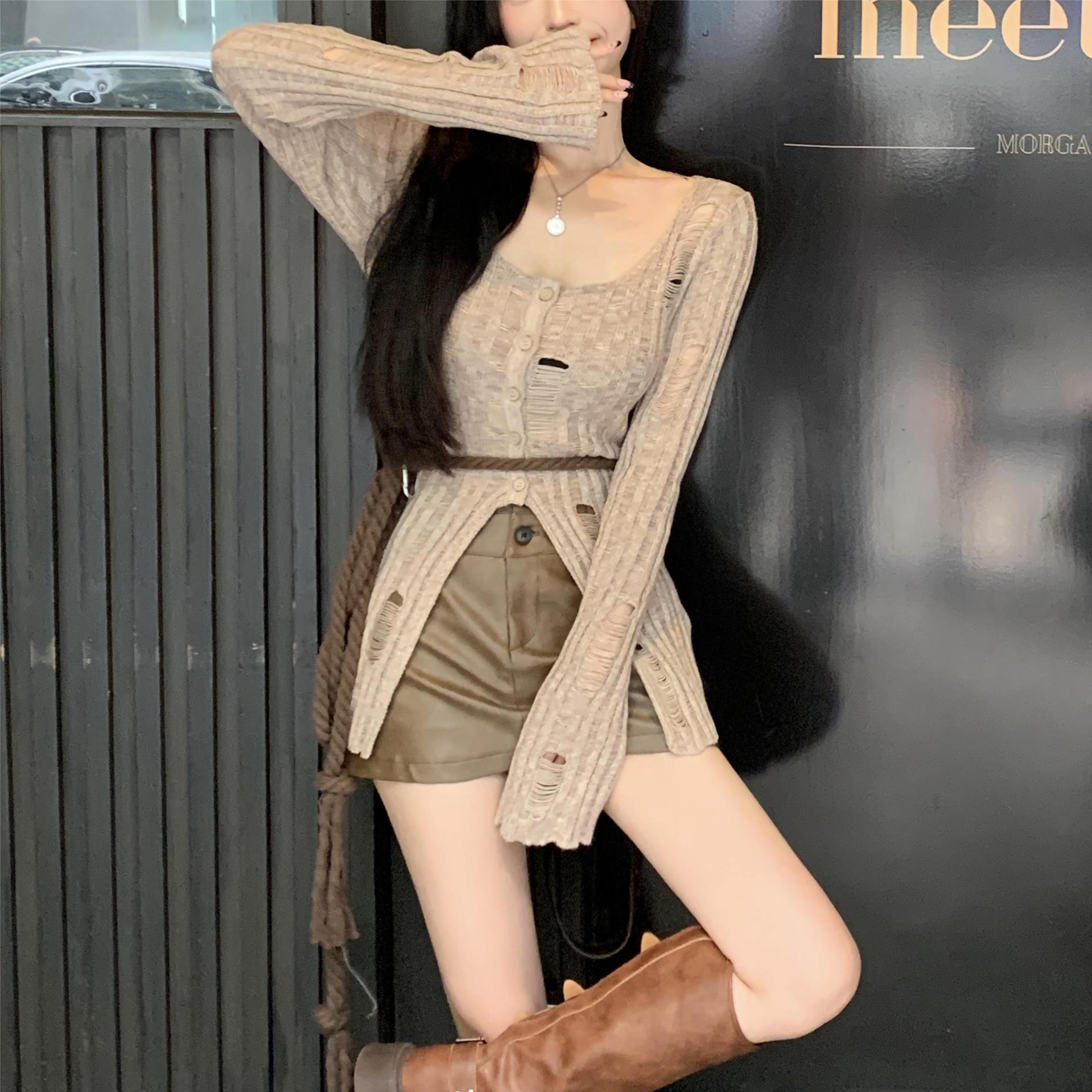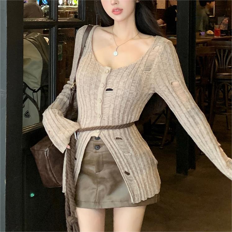 2024 년 가을 새로운 Da Lang 니트 스웨터 할로우 U-넥 롱 슬리브 니트 카디건 핫 소녀 순수한 욕망 여성 탑