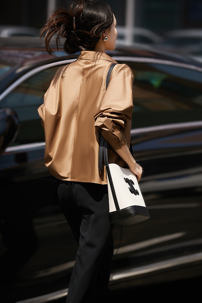 CYC660261AG 새틴 말 면화 Supima 느슨한 허리 짧은 실루엣 긴 소매 캐주얼 셔츠