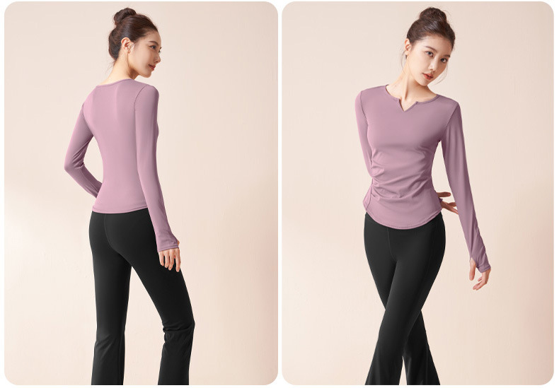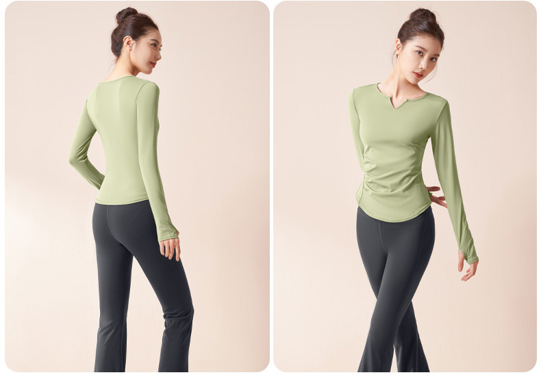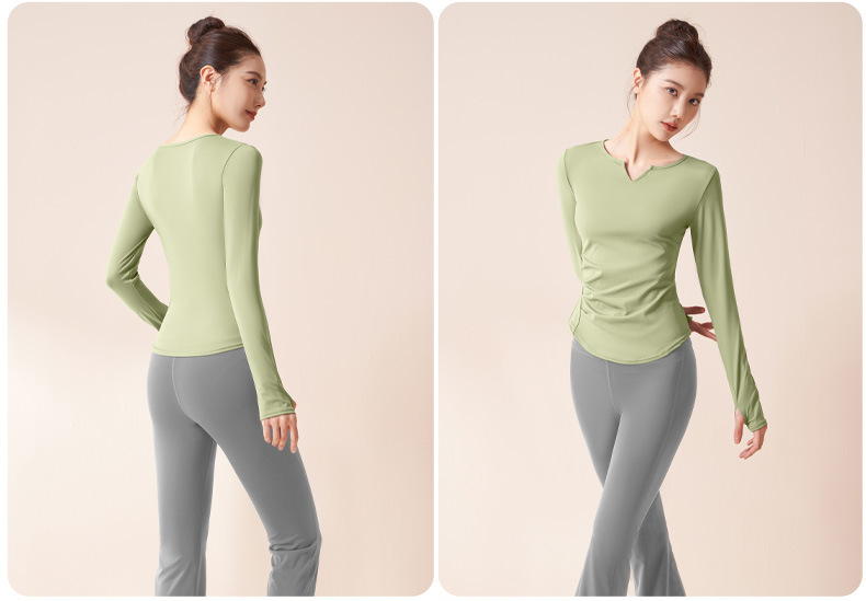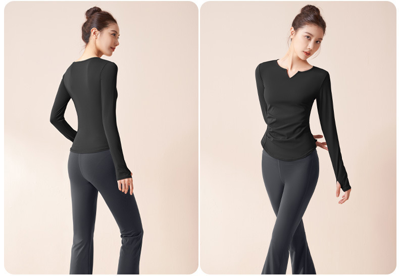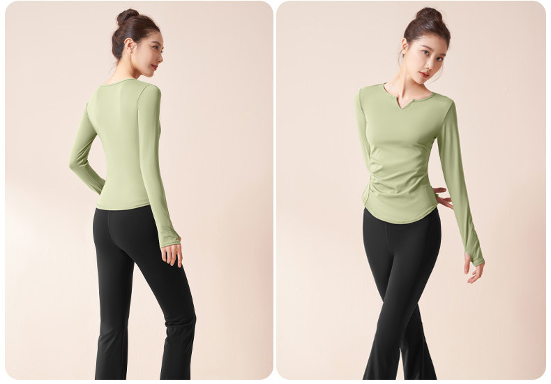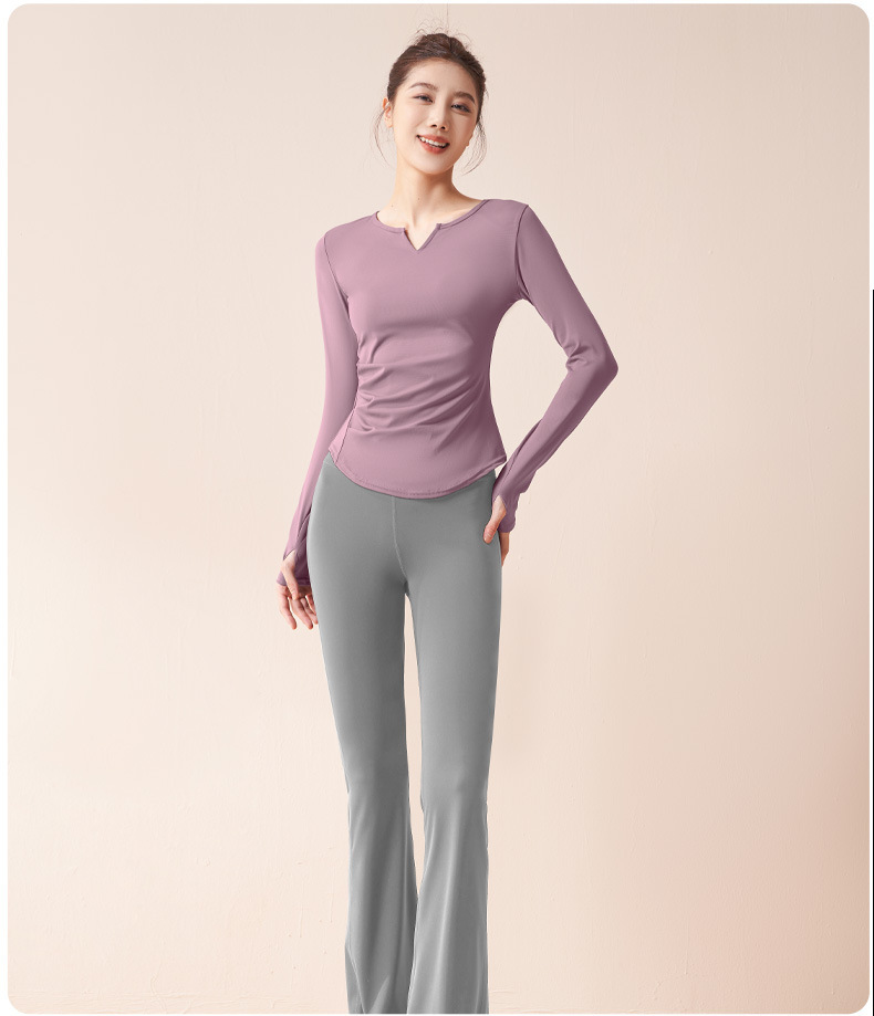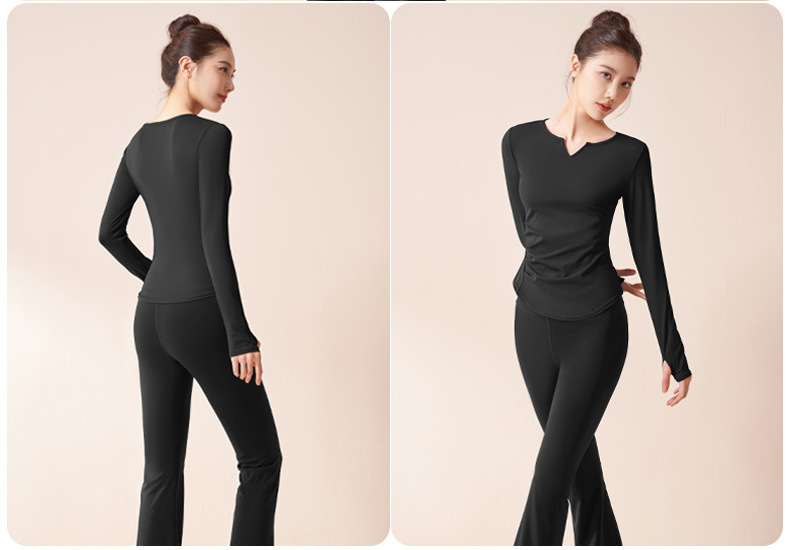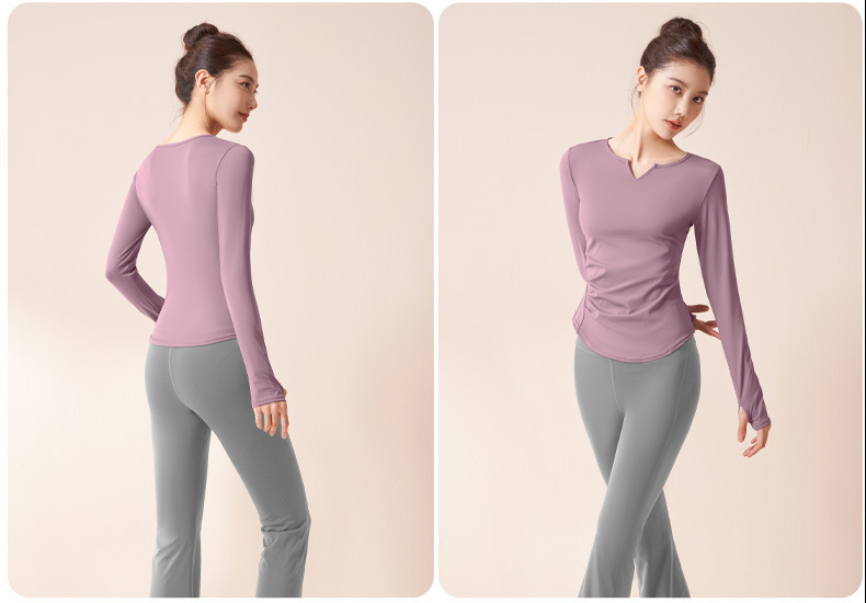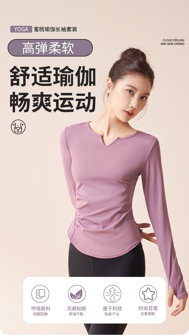 주이탕 4방향 스트레치 브이넥 플리츠 요가복 세트, 누드톤 슬림핏 롱 가을 피트니스 세트 (여성용)스토어 가기