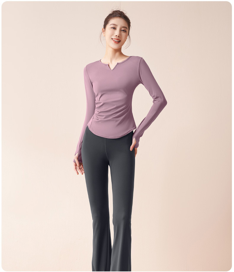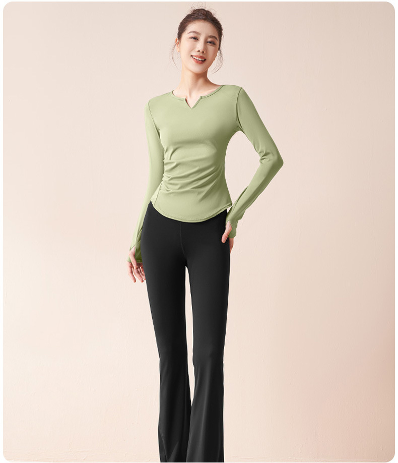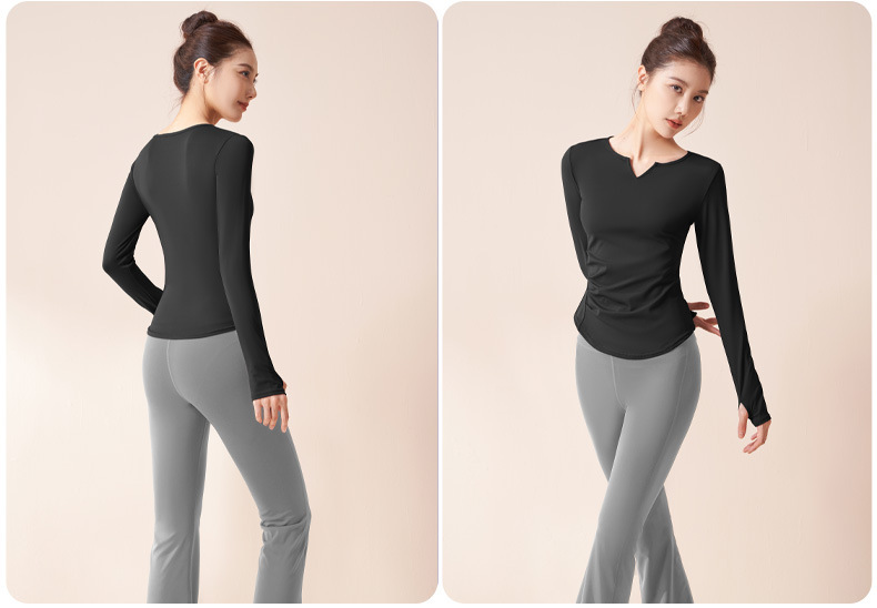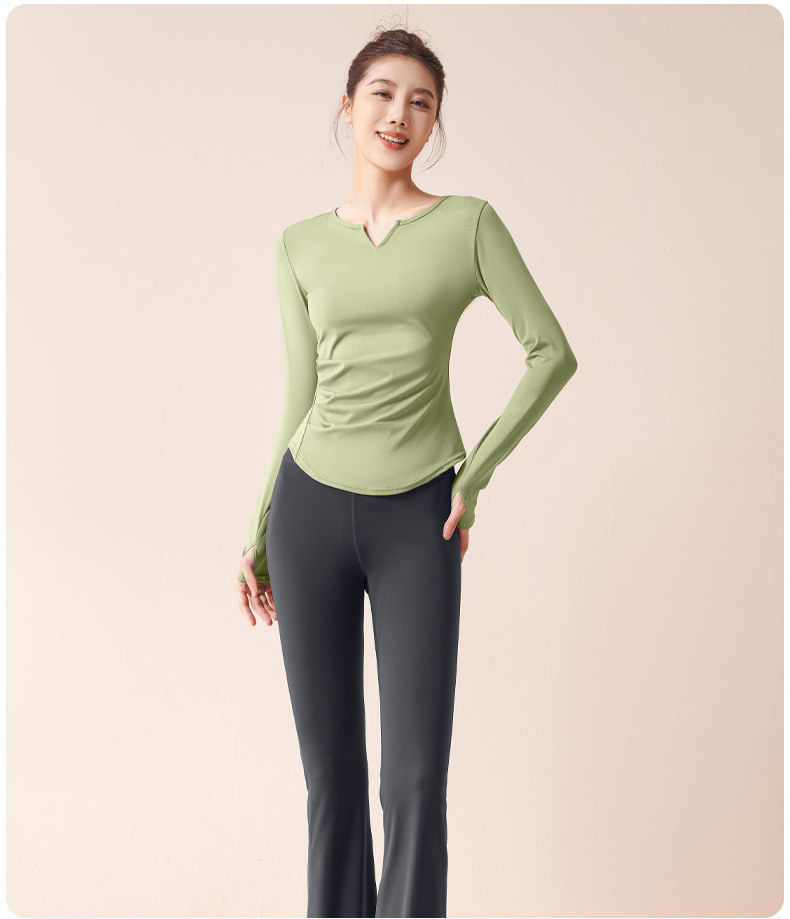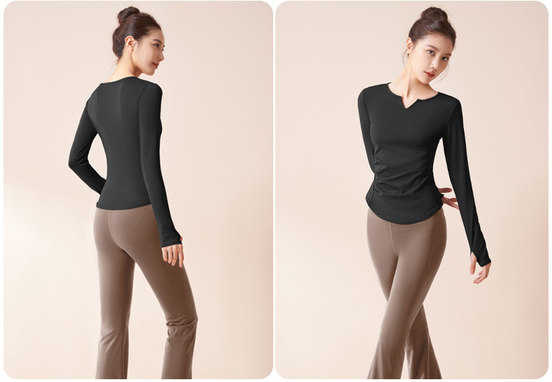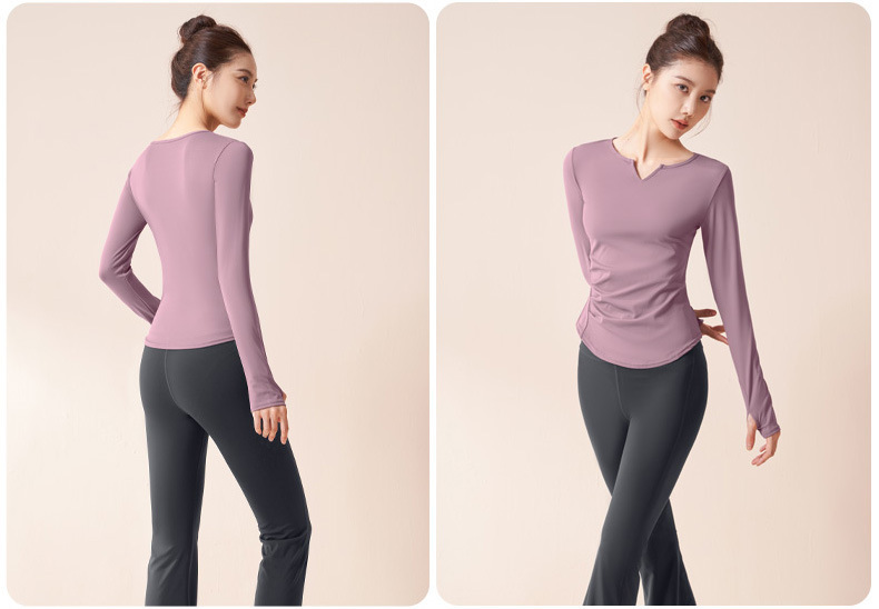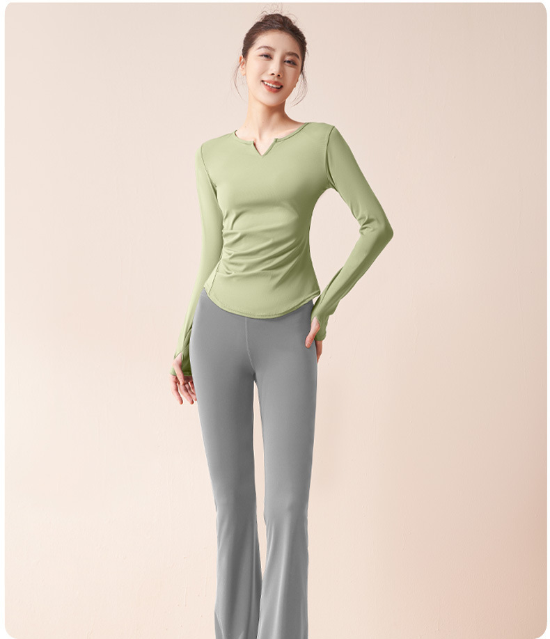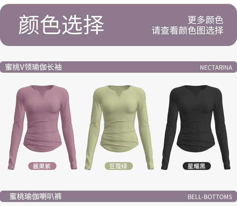 주이탕 4방향 스트레치 브이넥 플리츠 요가복 세트, 누드톤 슬림핏 롱 가을 피트니스 세트 (여성용)스토어 가기