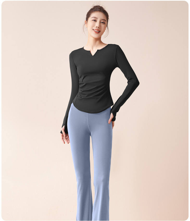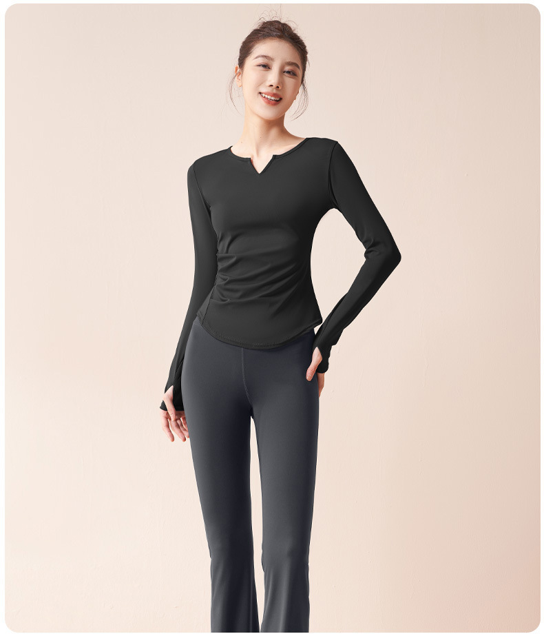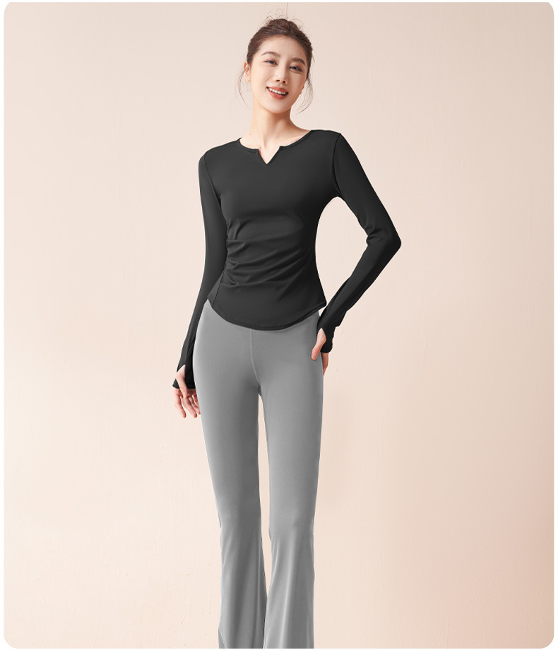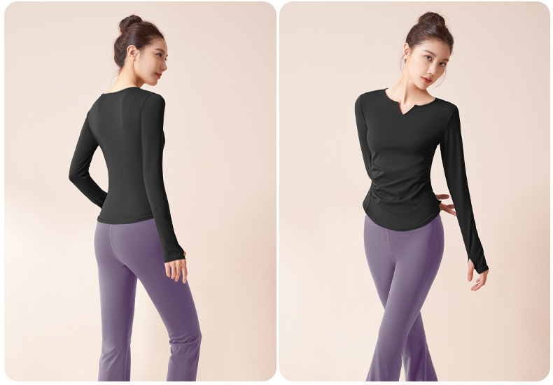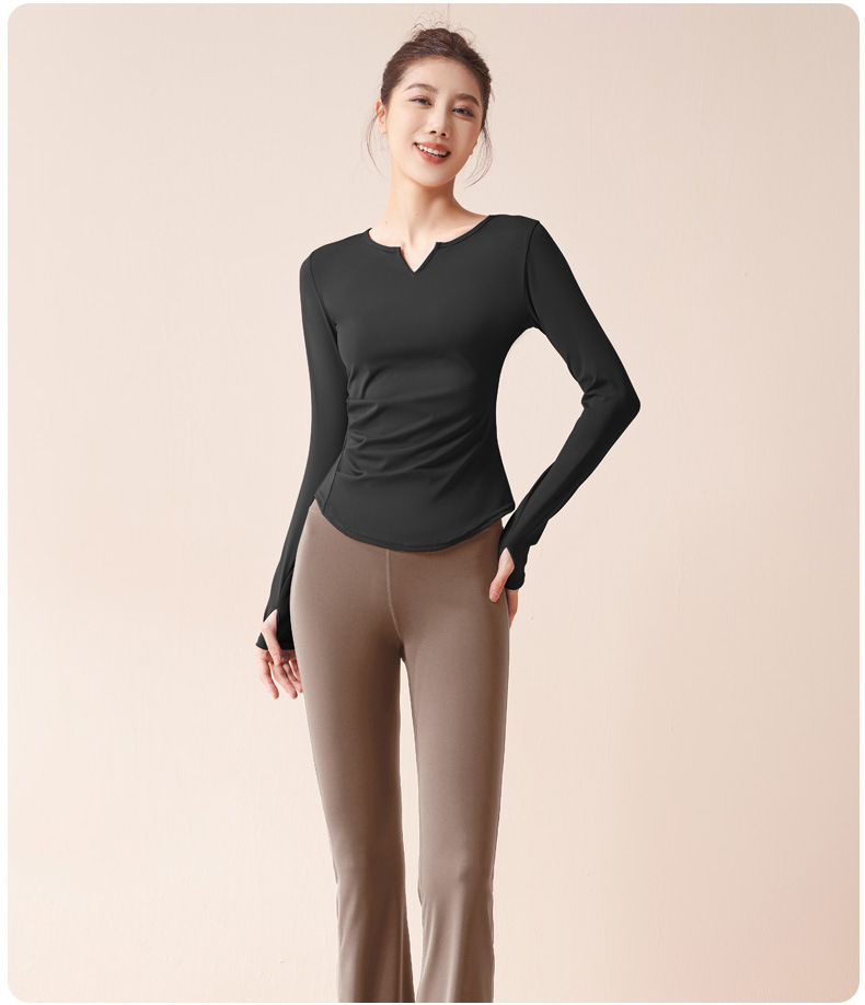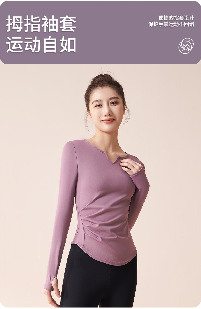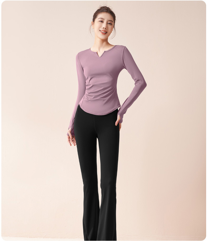 주이탕 4방향 스트레치 브이넥 플리츠 요가복 세트, 누드톤 슬림핏 롱 가을 피트니스 세트 (여성용)스토어 가기