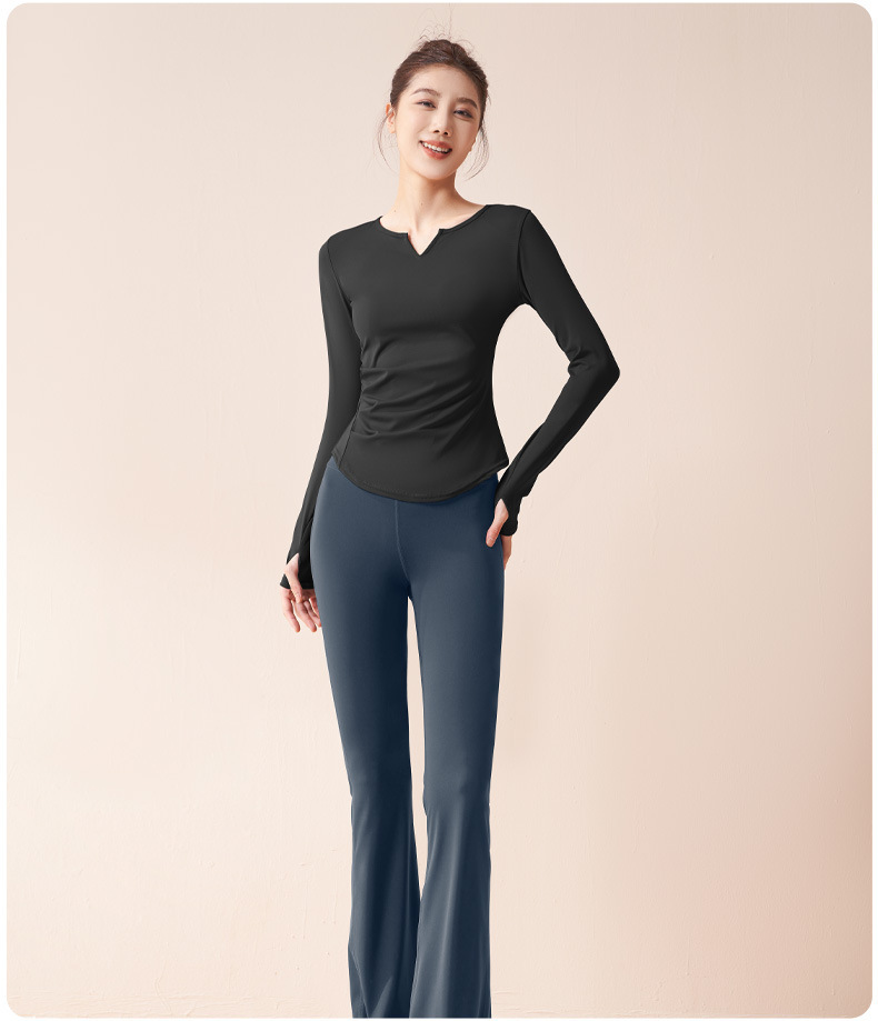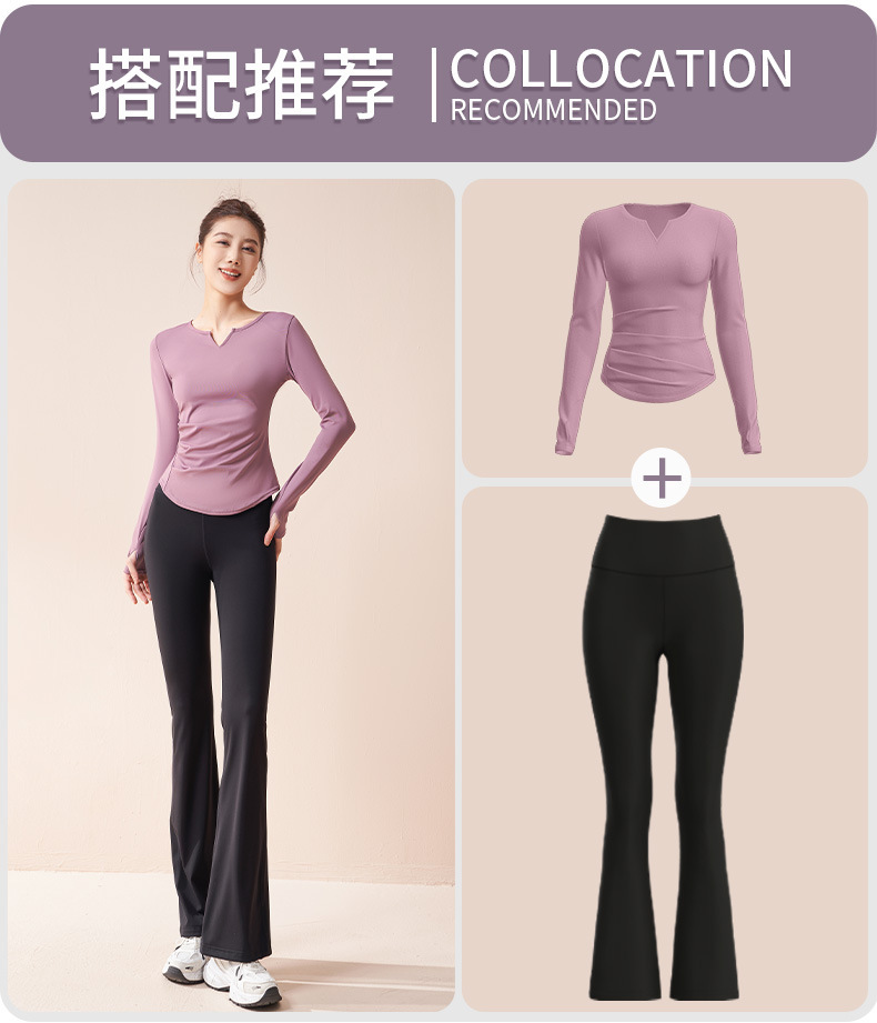 주이탕 4방향 스트레치 브이넥 플리츠 요가복 세트, 누드톤 슬림핏 롱 가을 피트니스 세트 (여성용)