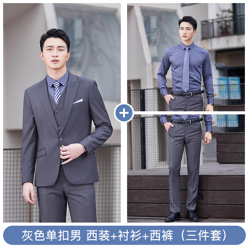 • 그레이 싱글 버튼 남자 세트 + 다크 그레이 스트라이프 긴팔 셔츠 + 양복 조끼 + 바지