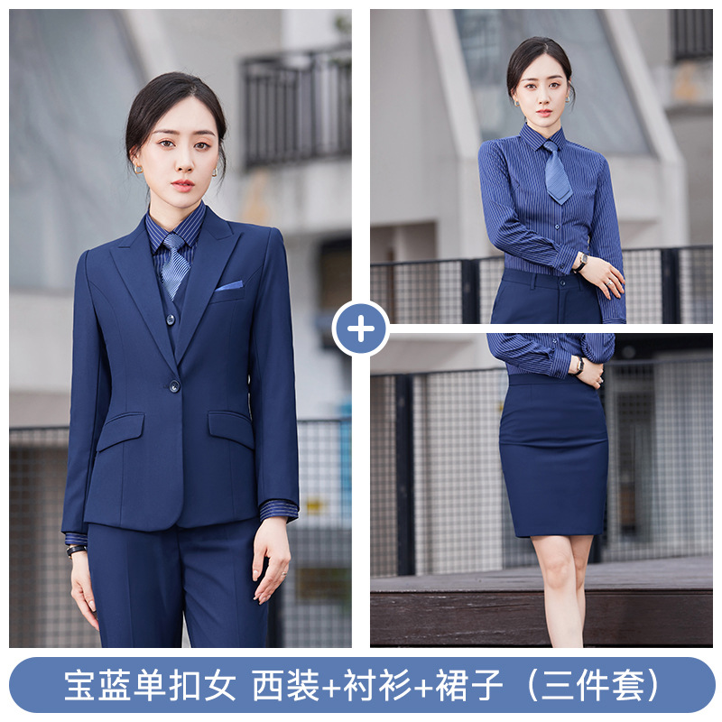 • 사파이어 싱글 버튼 여성 세트 + 다크 블루 스트라이프 긴팔 셔츠 + 양복 조끼 + 바지 + 웨스턴 스커트