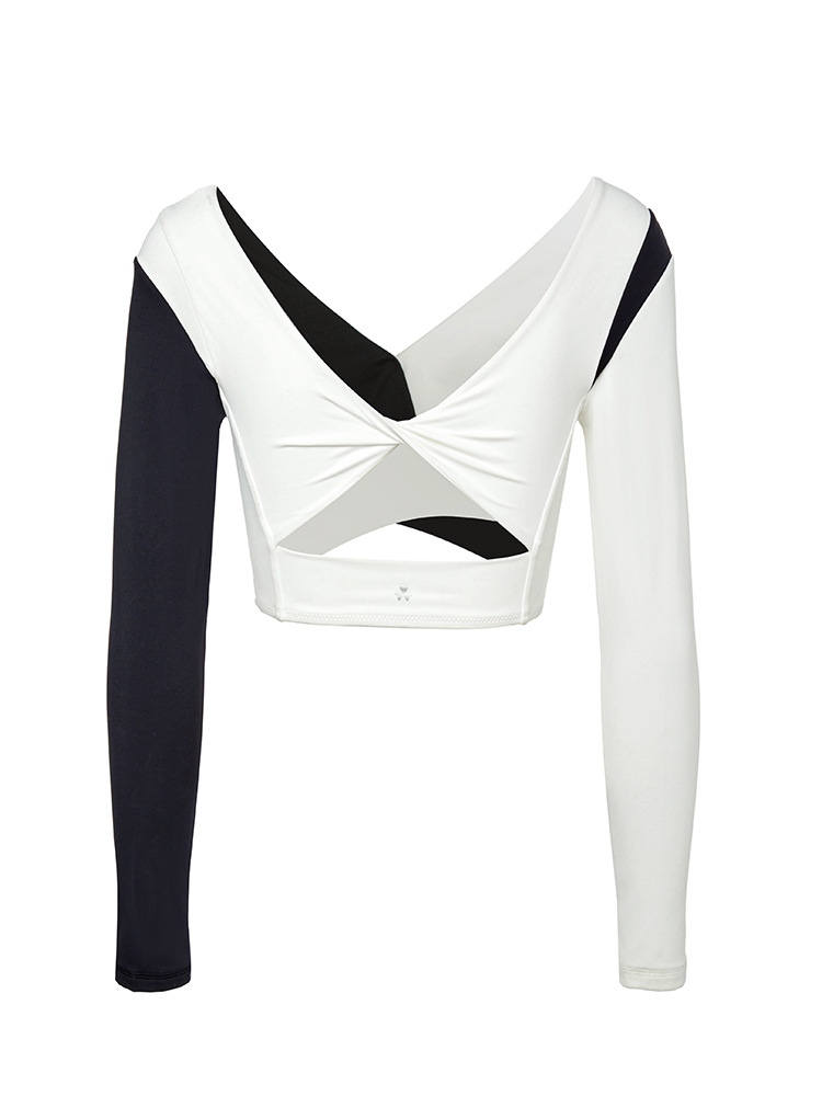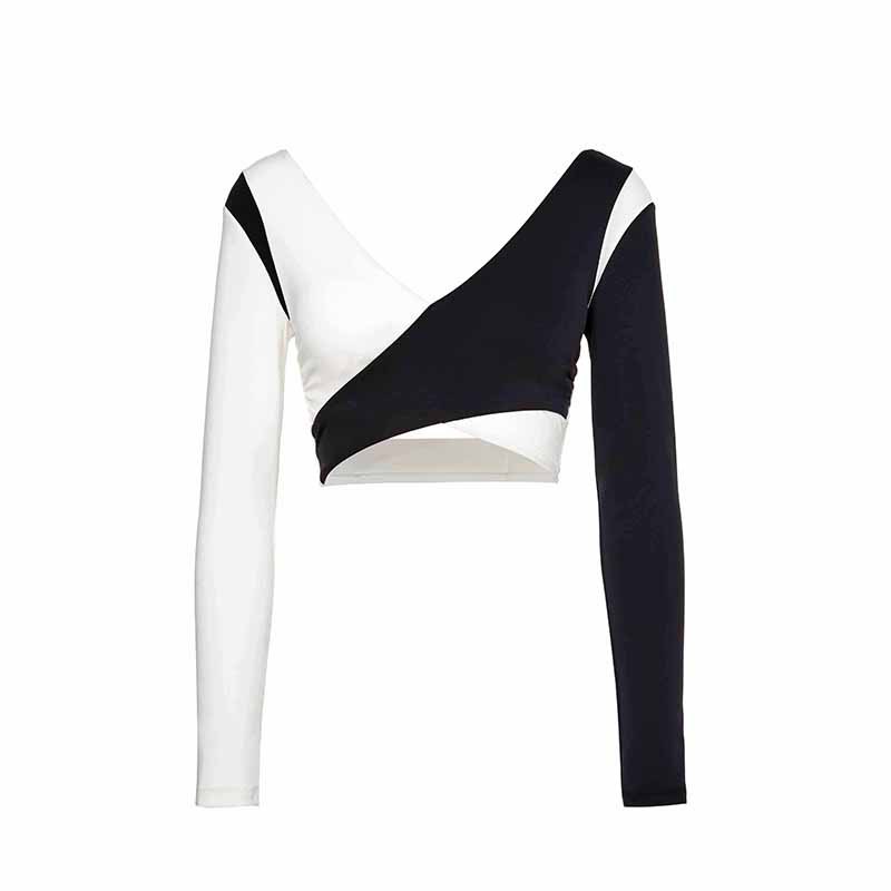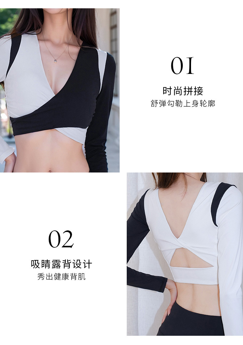 야외 레저 요가 착용 긴팔 흑백 스플 라이스 슬림 통기성 운동복 러닝 피트니스 v 넥 탑 타이트