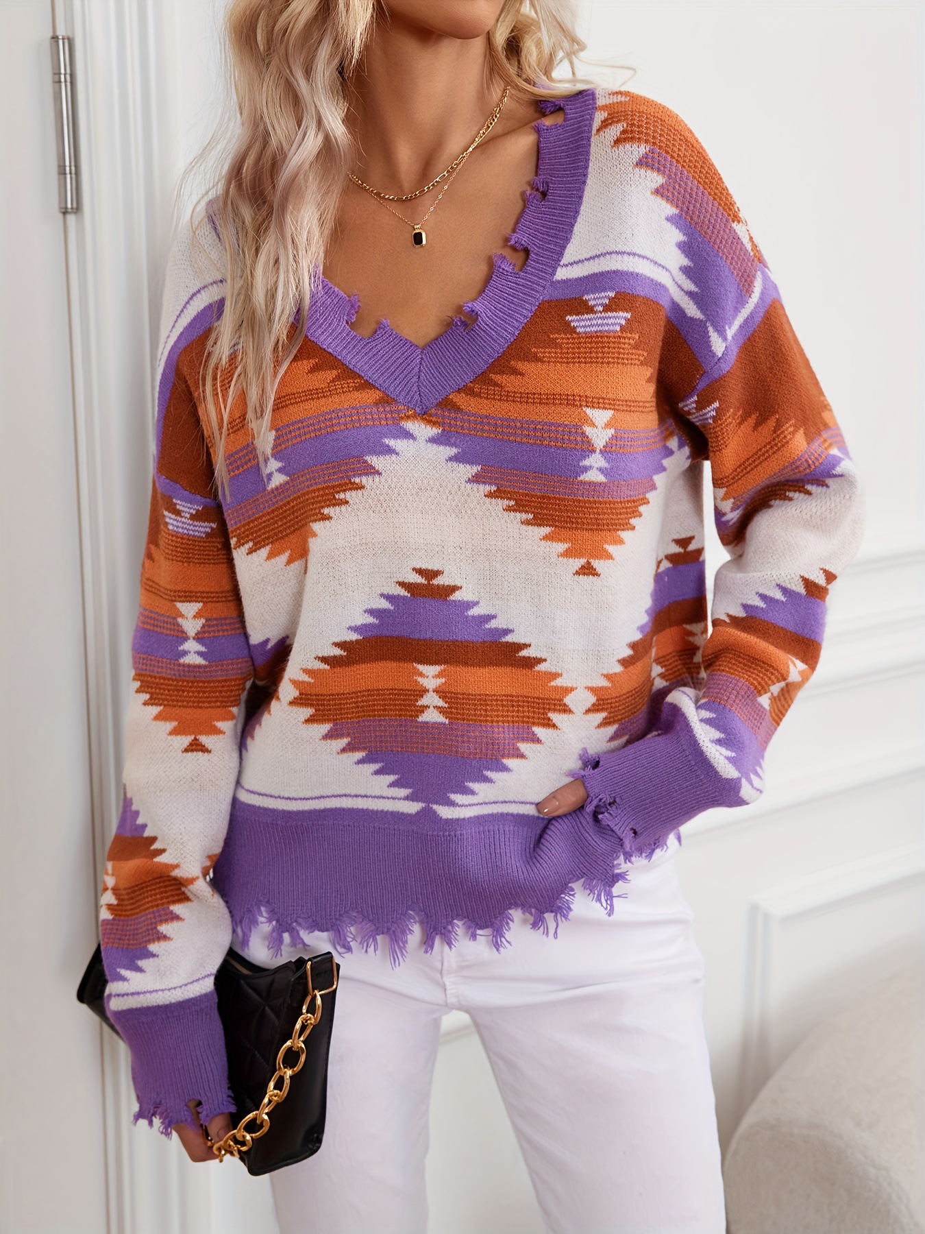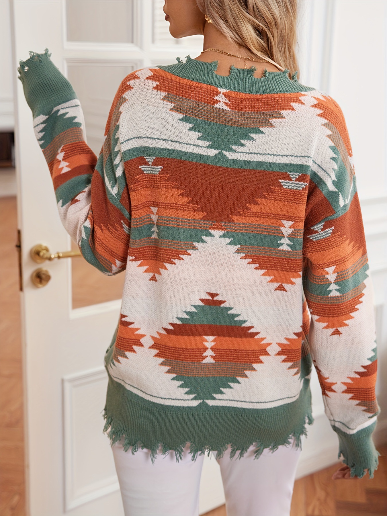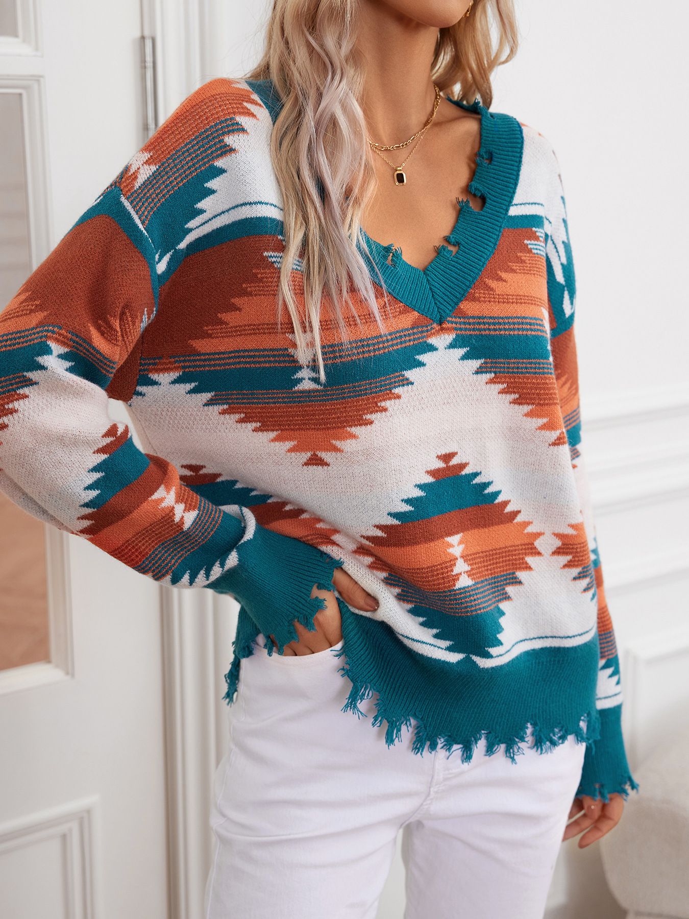 가을과 겨울 아즈텍 조각 풀오버 니트 펑크 스웨터 기하학적 패턴 V-넥 짧은 탑 긴팔 여성