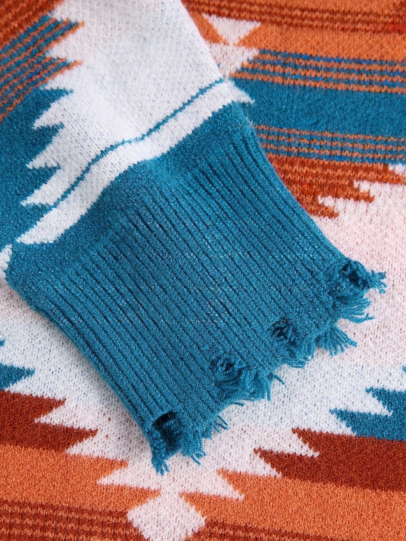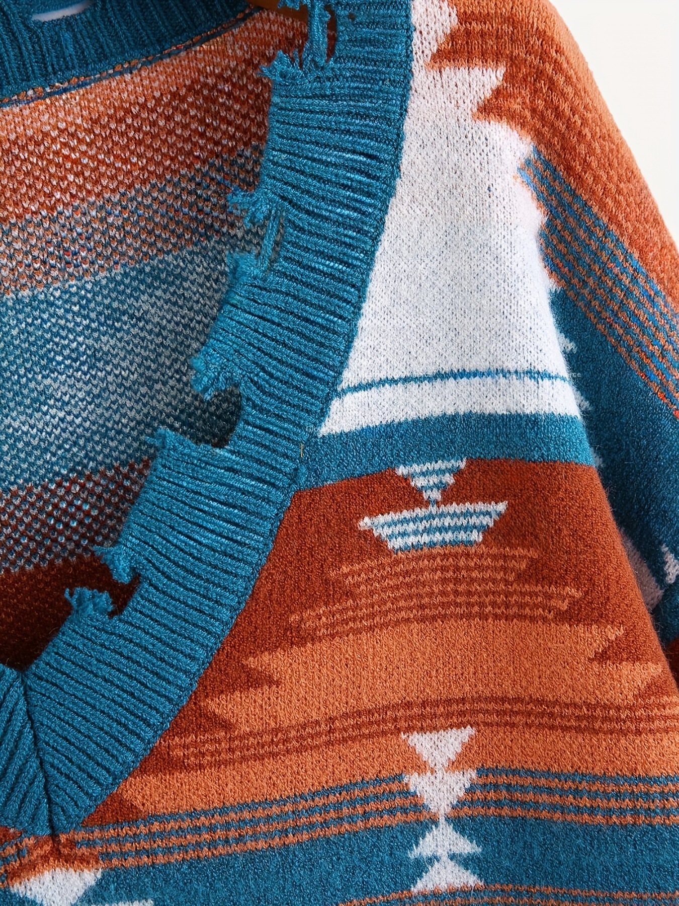 가을과 겨울 아즈텍 조각 풀오버 니트 펑크 스웨터 기하학적 패턴 V-넥 짧은 탑 긴팔 여성스토어 가기