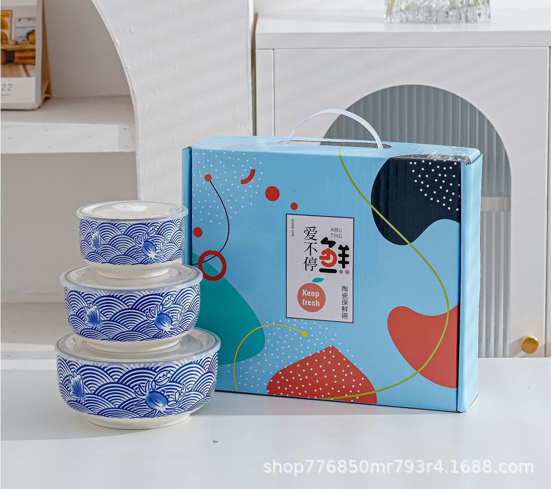 세라믹 신선한 보울 3 피스 세트 뚜껑 선물 상자 가정용 전자 레인지 인스턴트 국수 그릇 도시락 상자 세트 밀봉 상자