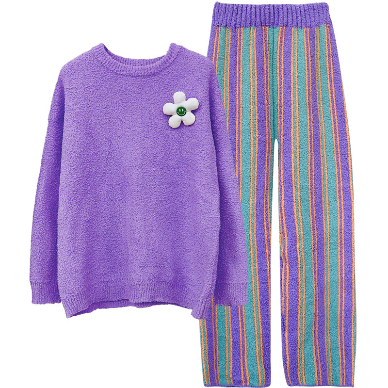 웨어러블 홈 의류 색상 캔디 스트라이프 꽃 부드러운 잠옷 여자의 가을과 겨울 두꺼운 따뜻한 니트 세트