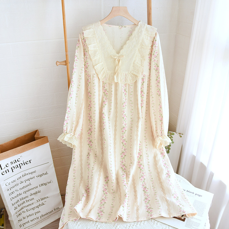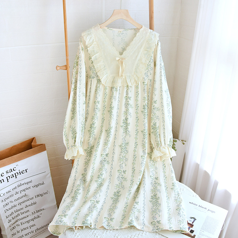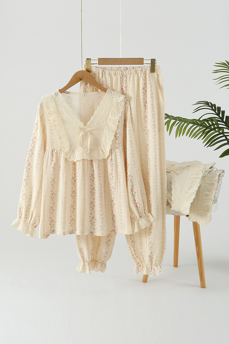 여성용 잠옷 가을 순수 코튼 풀오버 라운드 넥 레이스 긴팔 바지 홈웨어 루즈 플러스 사이즈 스위트스토어 가기