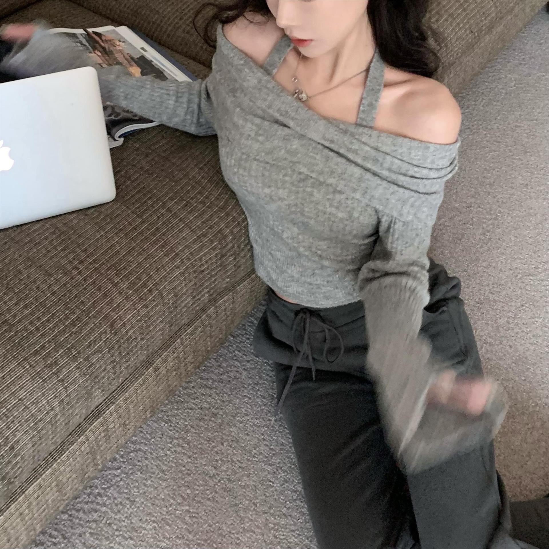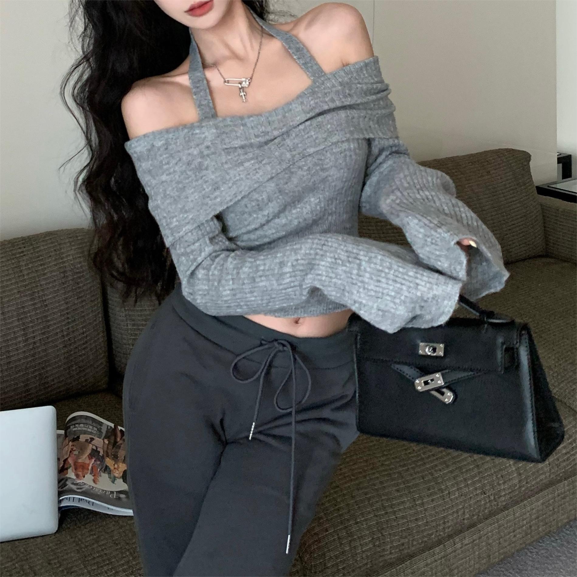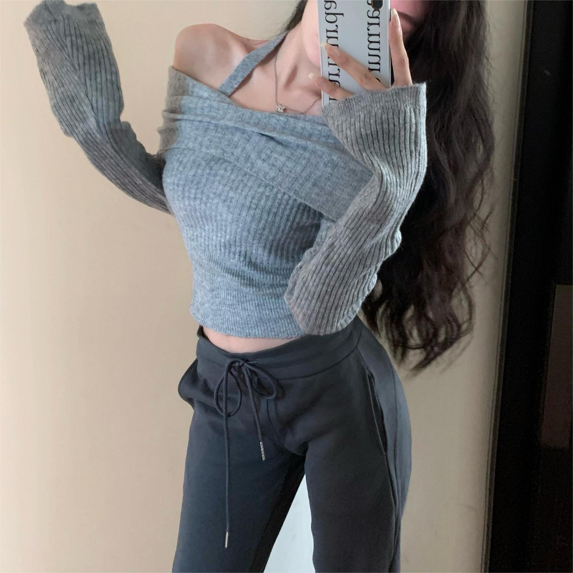 가을과 겨울 새로운 다랑 니트 숄더 넥 긴팔 슬림핏 스파이스 걸스 퓨어 욕망 여성용 스웨터 탑